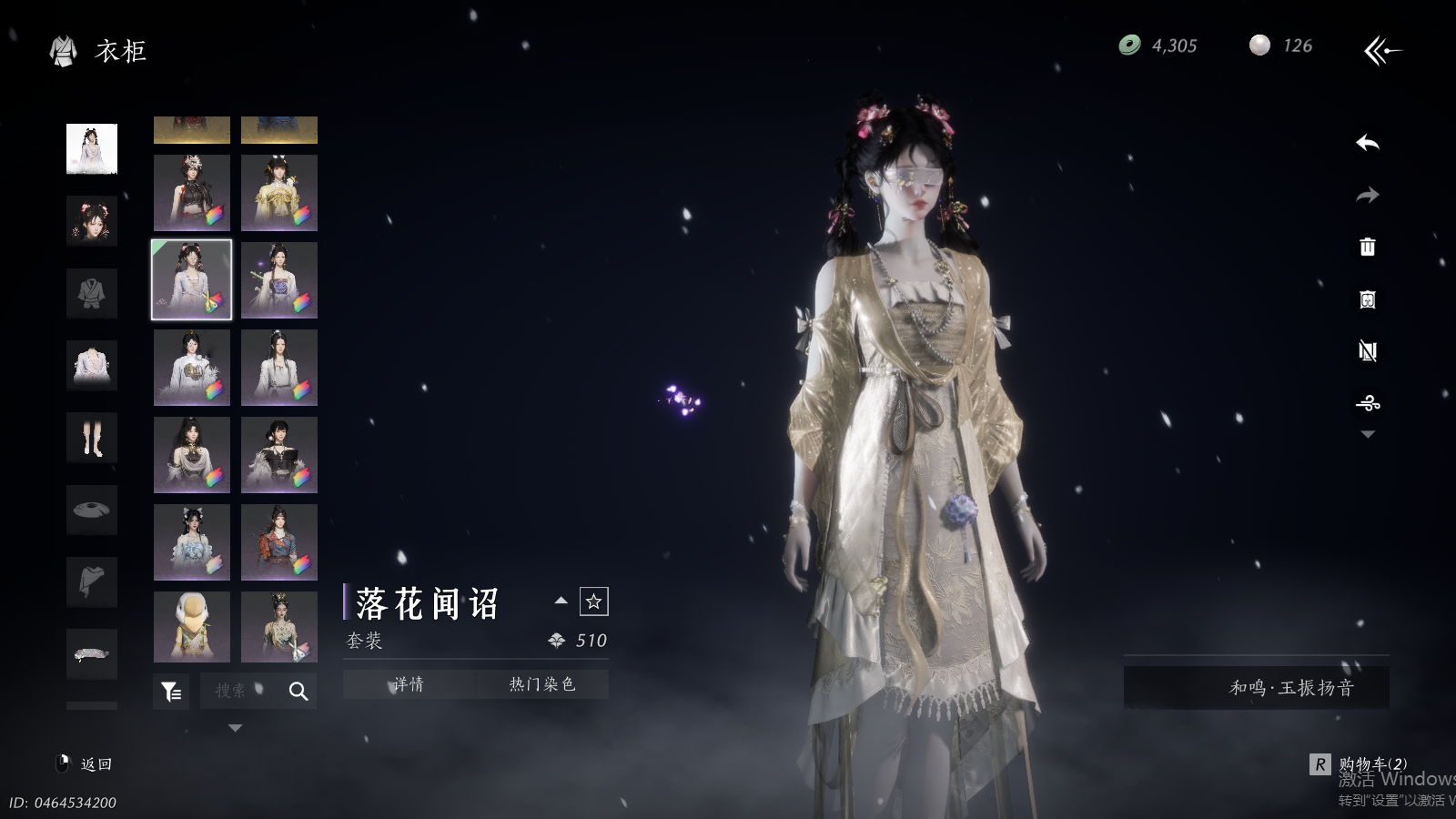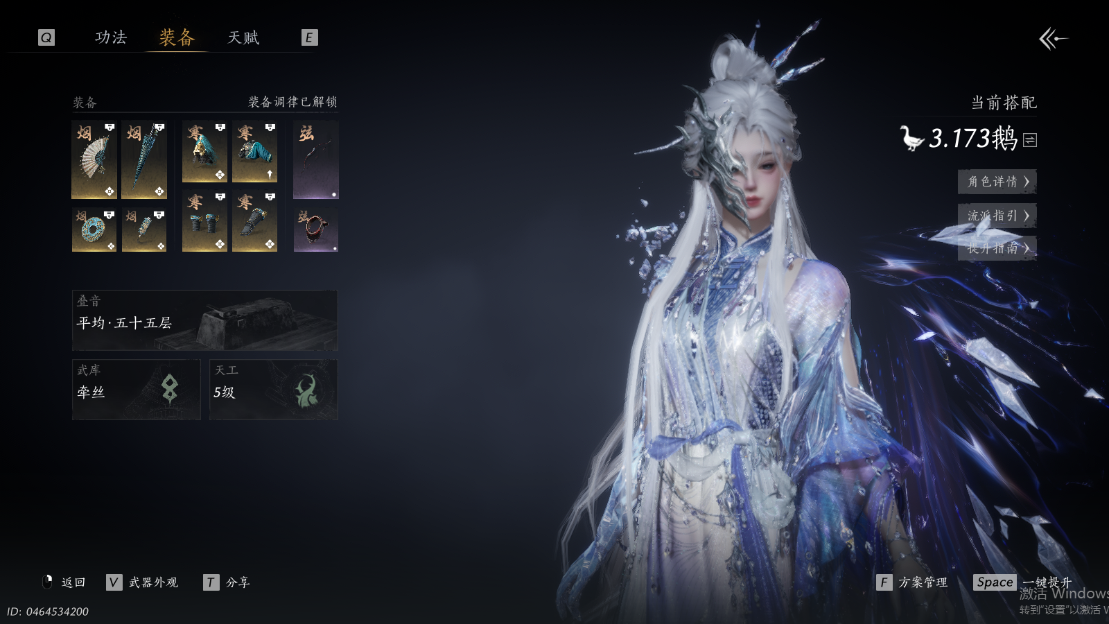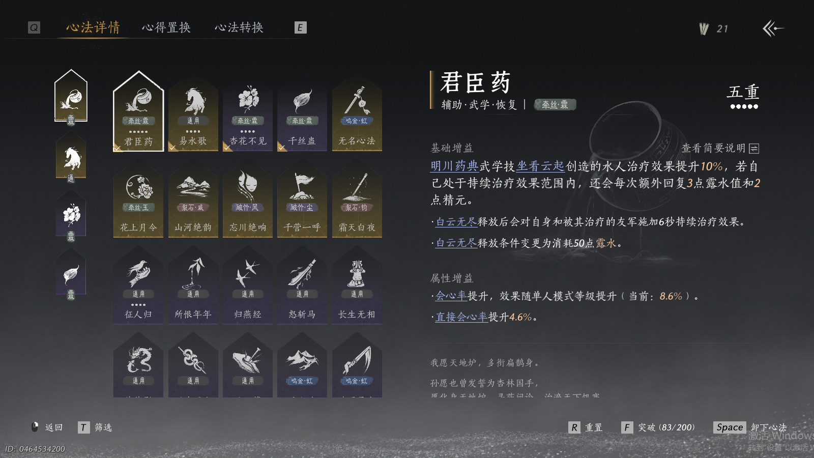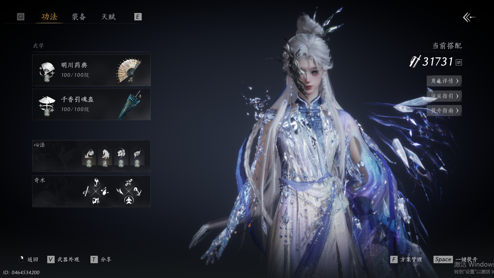 【澄心不染金阙翼回配饰,可封装5金伞,幽灵速坐骑,如碎霜天,青丘千岁,月中天阙,瑞鹤仙,将星入命,弄清影,霓裳徊天武学,鳞跃天倾黄龙断戟奇术,4套258时装,心法6666】 风华值73492 武林造诣(鹅)35029 已用八音窍数量12 未用八音窍数量0 等级100 角色性别【文本】女 【绝境】 【无换绑CD】 【未绑定或可换绑】 【未注册】 【不支持人脸包赔】 【女】 【无】 【ios】 【是】 【是】 【否】 稀有套装5 稀有发型1 稀有武器外观1 稀有武学奇术2 稀有坐骑1 套装4 稀有套装:将星入命,瑞鹤仙,如碎霜天,月中天阙,青丘千岁; 稀有发型:弄清影; 稀有武器外观:藏音·北溟有鱼(五金); 稀有武学奇术:黄龙断戟,鳞跃天倾; 稀有坐骑:幽灵速; 套装:青草原,花月天真,夜郎幽问,金滟玉团;