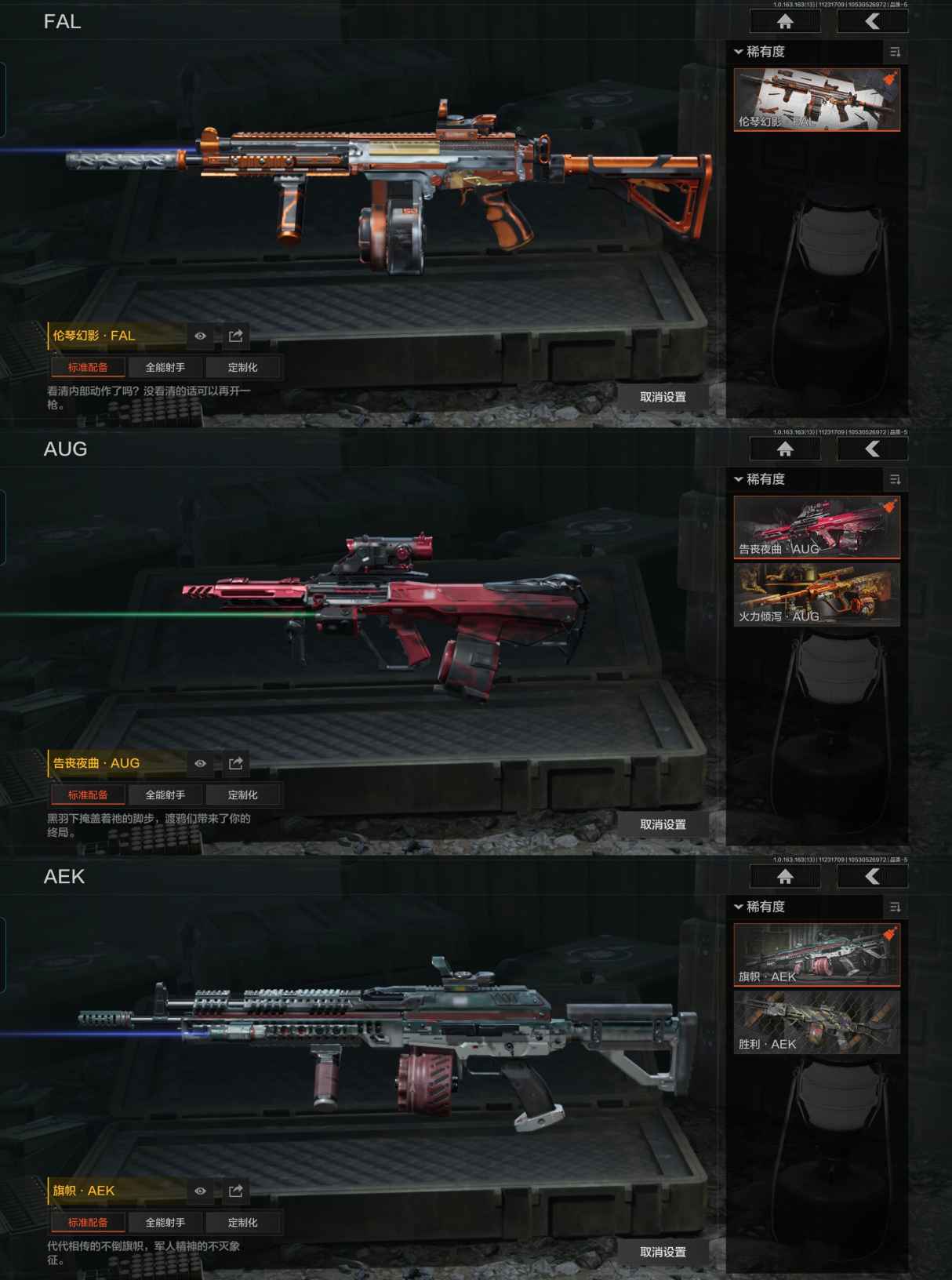[13608797]库存价值379962 4近战武器 1金套装 4金枪皮 可修改实名 【柯恩币数量】:19.0 【角色装扮(金)】:使徒·欧瑞恩 【近战武器】:来战·开山刀,工兵铲,涂鸦利刃,急袭弯刀 【金色枪皮】:告丧夜曲·AUG,告丧夜曲·AR57,利齿风暴·MPX,冰河碎影·14 【紫色枪皮】:炎夏浪花·H416,快乐游戏·M110,快乐游戏·MPX,边缘矢量·MPX,伦琴计量·Vector45,骤羽尖啸·AK12,利齿风暴·T03,利齿风暴·T79,来战·AK74N,巅峰·M4A1,涂鸦·AK102,湖冰倒影·ACE31,湖冰倒影·MP5,涂绘猎人·AR57[13966792]库存价值35.5 5近战武器 1金套装 6金枪皮 可修改实名 【柯恩币数量】:31965【角色装扮(金)】:火绒·塔莉娅【近战武器】:来战·开山刀,S-07折刀,寒牙手刺,工兵铲,急袭弯刀【金色枪皮】:骑士之剑·VSS,竞技·FAL,旗帜·AEK,棱光裂变·QBU191,利齿风暴·MPX,蓝色咆哮·H416【紫色枪皮】:火绒·AK12,旗帜·SVDS,旗帜·RPK16,棱光裂变·莫辛,骑士之剑·AKS74U,竞技·AUG,快乐游戏·AK102,边缘矢量·AX50,典礼武备·14,超越自我·Vector9,超越自我·AR30,鱼跃丹青·DT MDR,利齿风暴·T03,利齿风暴·T79,来战·AKM,来战·AK74N,竞技·M4A1,焰色反应·M110【角色装扮(紫)】:使徒·瑞文,都市夜影套装