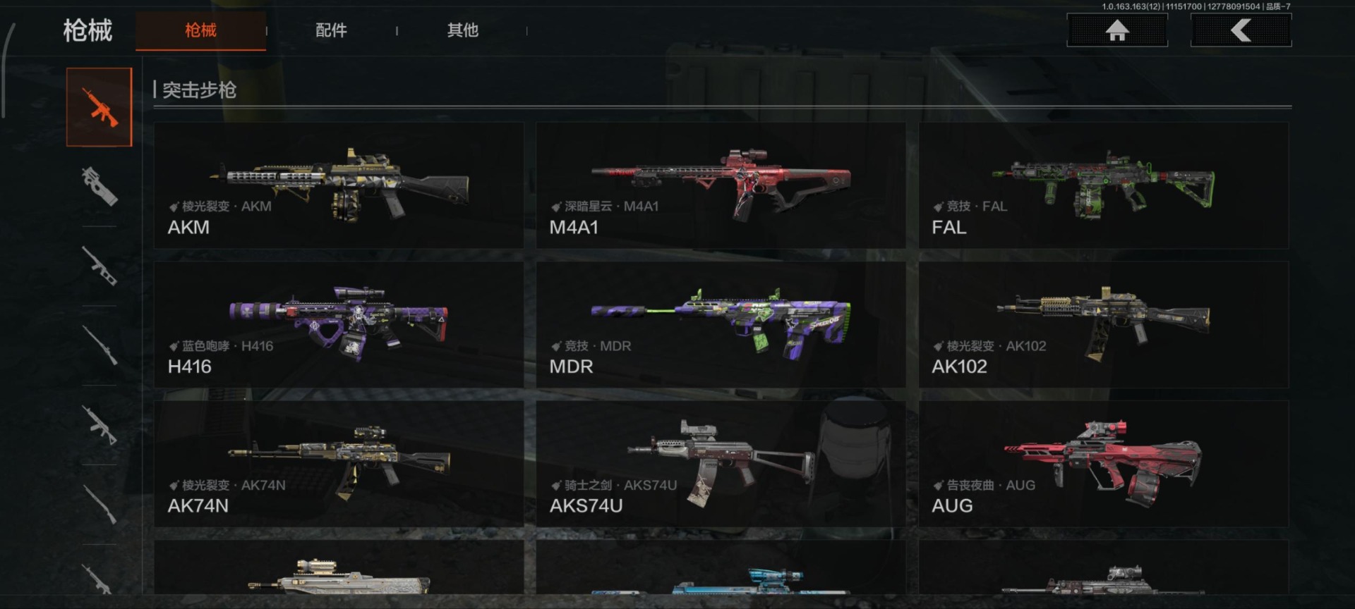 商品描述:[13994911]库存价值5.8 4近战武器 2金套装 9金枪皮 可修改实名 【柯恩币数量】:29839 【角色装扮(金)】:火绒·塔莉娅,钢铁壁垒作战服 【近战武器】:赢家匕首,来战·开山刀,冬日冰镐,裁决手杖剑 【金色枪皮】:旗帜·AEK,棱光裂变·QBU191,告丧夜曲·AUG,浮鳞影青·QBZ192,旧王圣谕·QBZ191,竞技·FAL,骑士之剑·VSS,蓝色咆哮·H416,冬夜·AK12 【紫色枪皮】:棱光裂变·AK74N,棱光裂变·AK102,棱光裂变·AKM,竞技·MDR,骤羽尖啸·MPX,无畏·USAS12,旗帜·SVDS,赢家·F2000,典礼武备·14,典礼武备·MCX,秘域鎏金·RPK16,骑士之剑·AKS74U,骑士之剑·SJ16,白垩游魂·莫辛,深暗星云·M4A1,全地形数码·M110,骑士之剑·ACE31,缟兵玄墨·T03,神锋·Vector45,靶场潮流·SCAR,靶场潮流·AN94 【角色装扮(紫)】:金狮护身·转运套装,鎏金街头套装