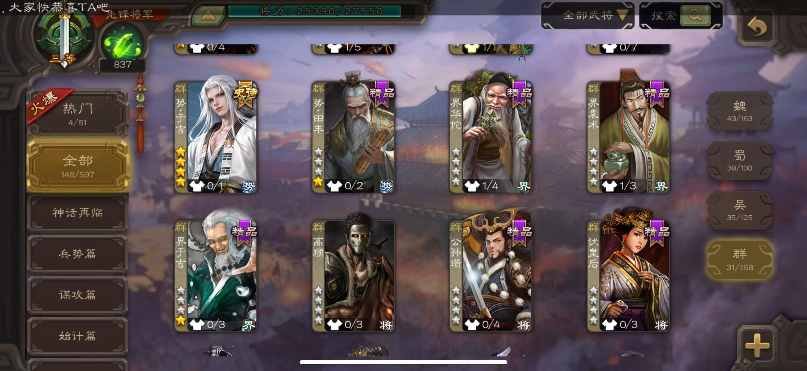 商品描述:三国杀先锋将军势于吉,曹婴,董允3史诗,天宫带一个张既,带6w多羽毛。三卡材料多。
