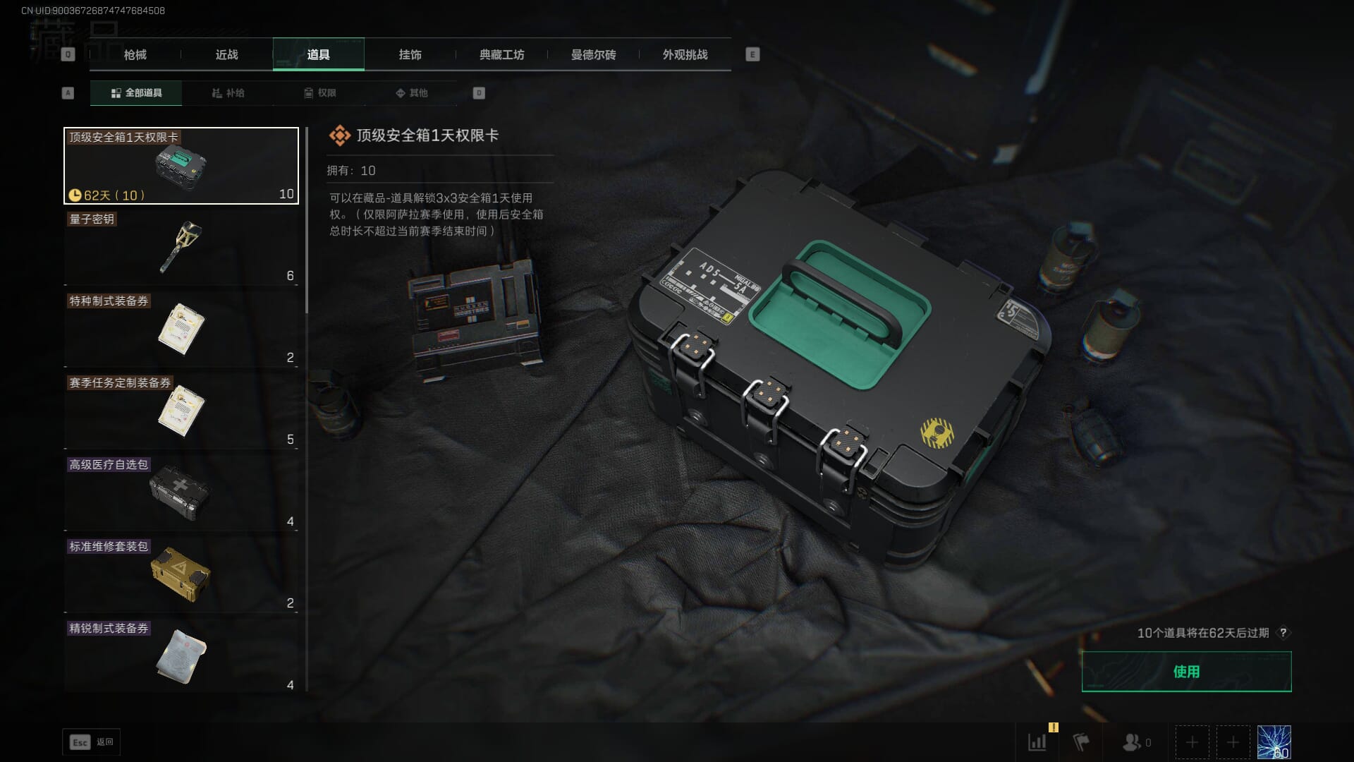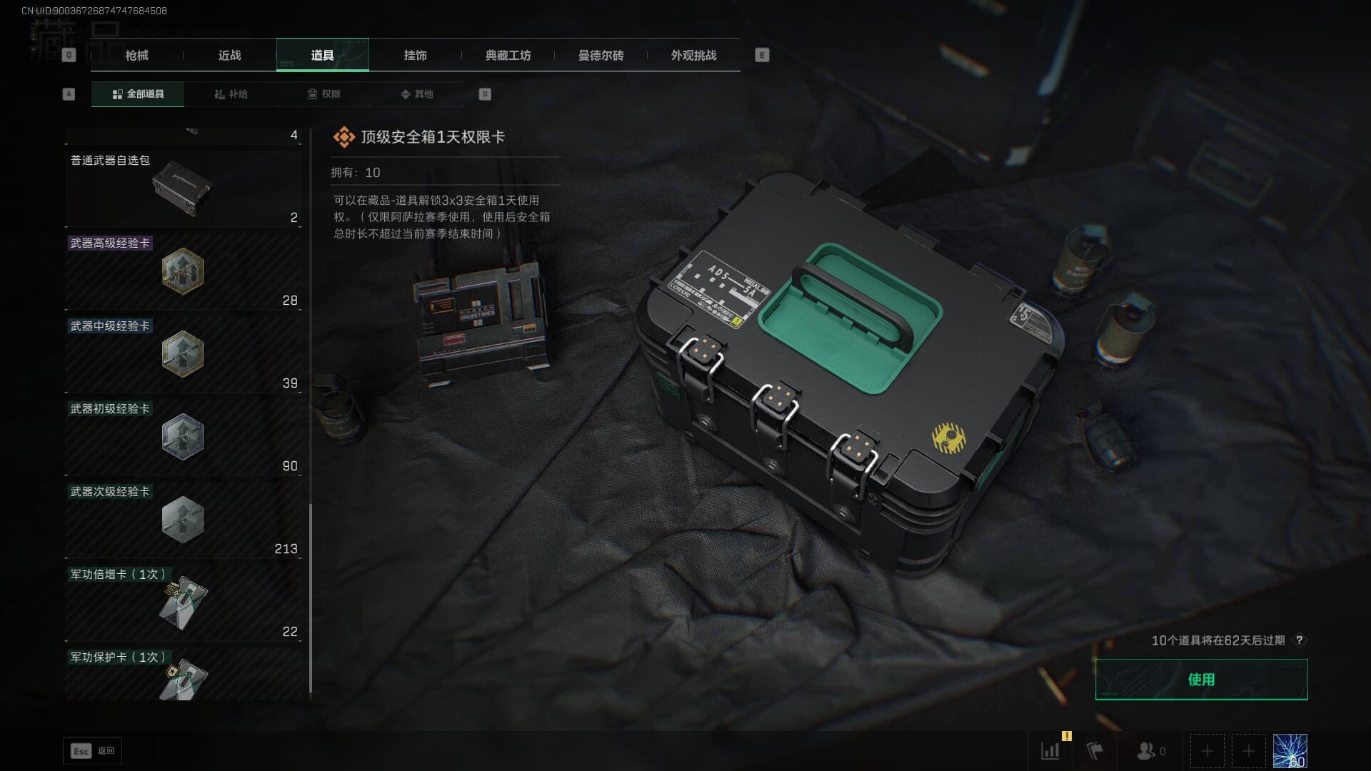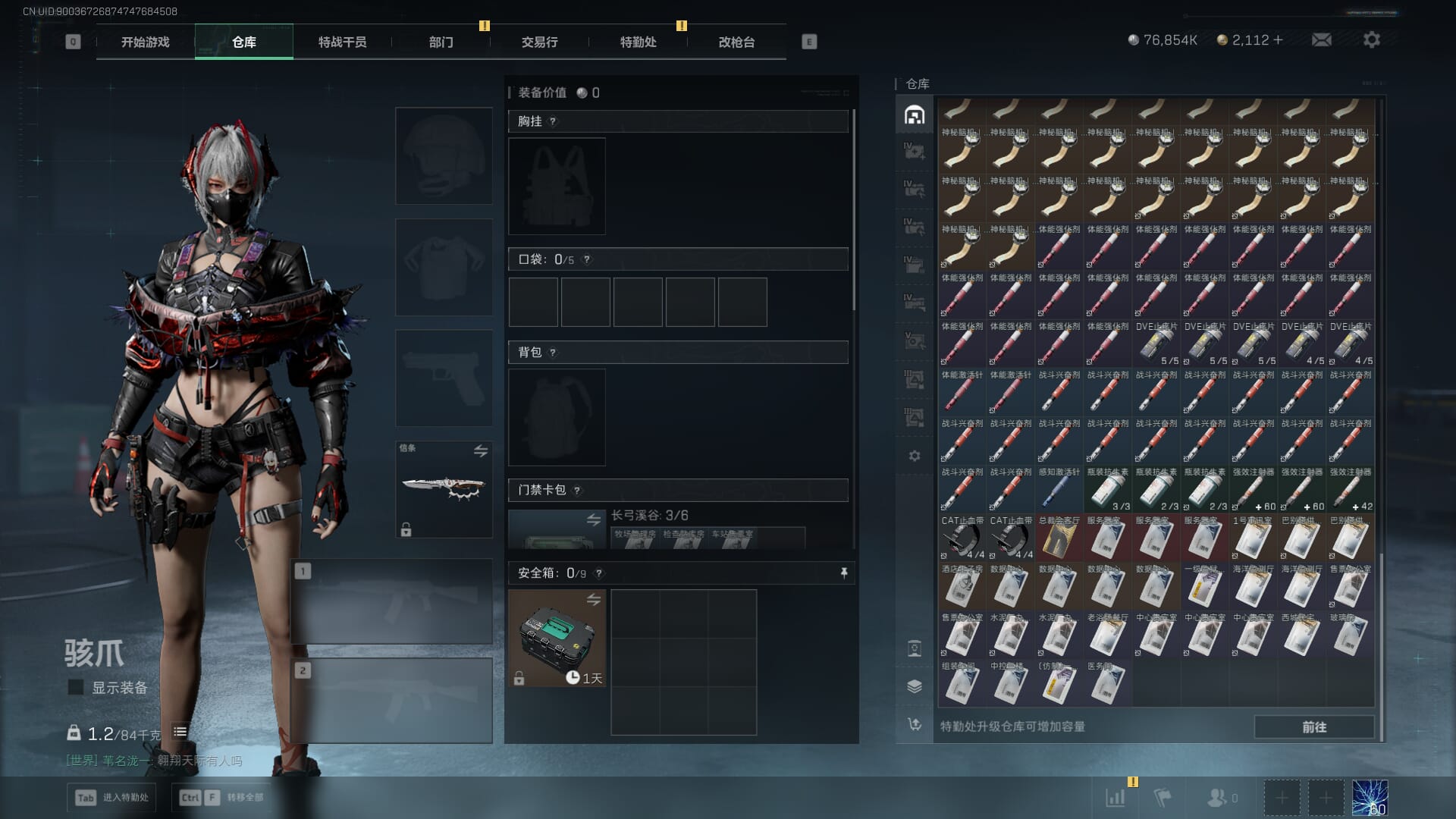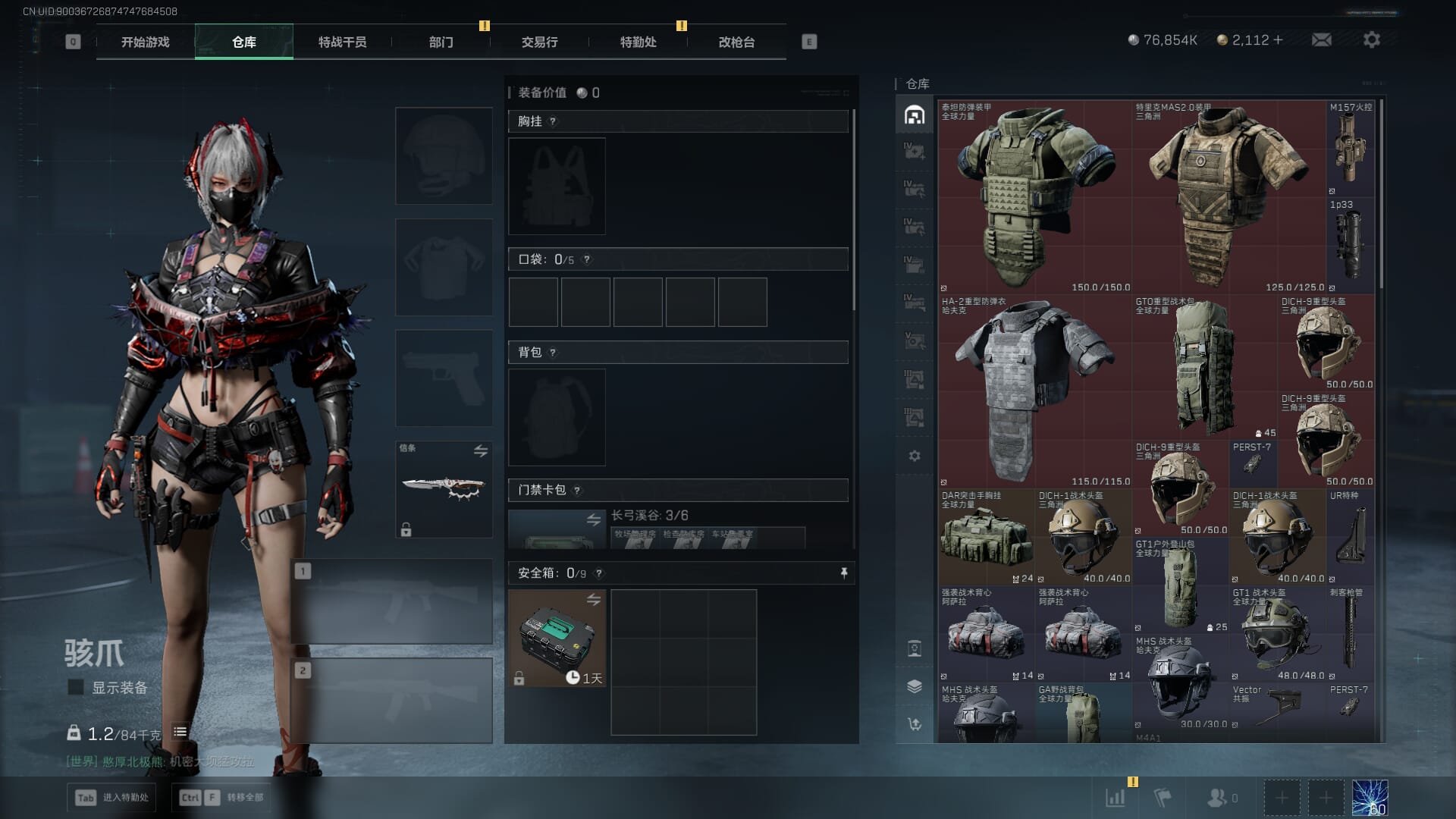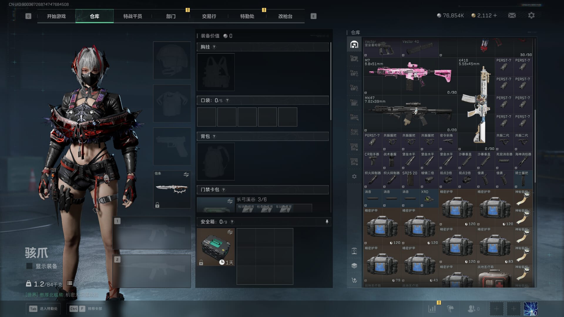 总资产:62.2M,哈夫币:84W,武器皮肤:5,黑鹰_,战场60级:列兵,【安全箱】基础安全箱;【特勤处等级】仓库LV.5,靶场LV.4,训练中心LV.4;【干员皮肤】骇爪维什戴尔,红狼电锯惊魂;【近战武器】近战武器-黑鹰;【步枪皮肤】M4A1突击步枪-阿米娅,SCAR-H战斗步枪-启航,KC17突击步枪-电锯惊魂;【狙击步枪皮肤】R93狙击步枪-维什戴尔;