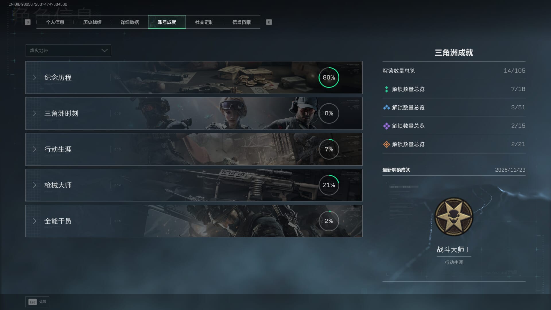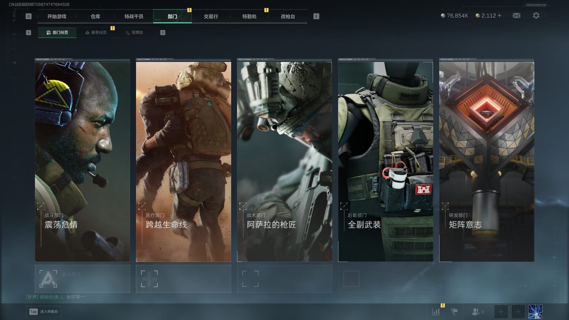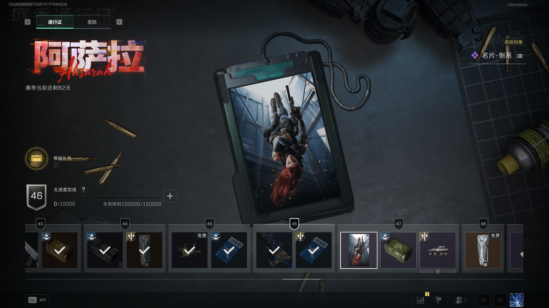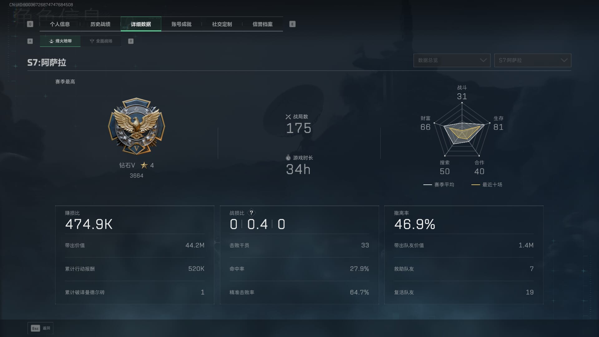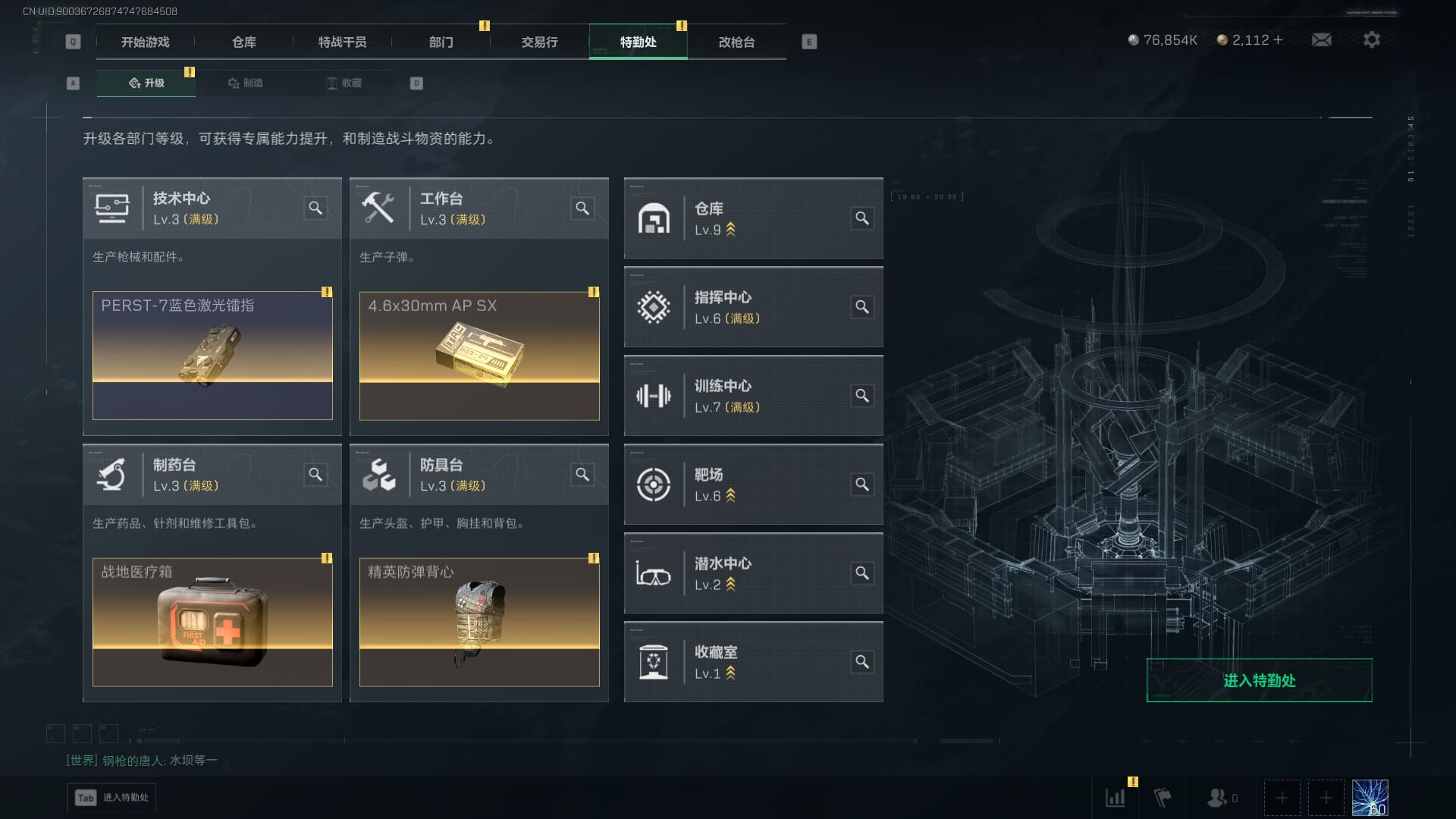 总资产:62.2M,哈夫币:84W,武器皮肤:5,黑鹰_,战场60级:列兵,【安全箱】基础安全箱;【特勤处等级】仓库LV.5,靶场LV.4,训练中心LV.4;【干员皮肤】骇爪维什戴尔,红狼电锯惊魂;【近战武器】近战武器-黑鹰;【步枪皮肤】M4A1突击步枪-阿米娅,SCAR-H战斗步枪-启航,KC17突击步枪-电锯惊魂;【狙击步枪皮肤】R93狙击步枪-维什戴尔;
