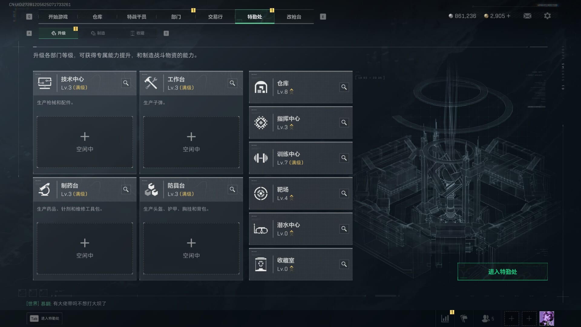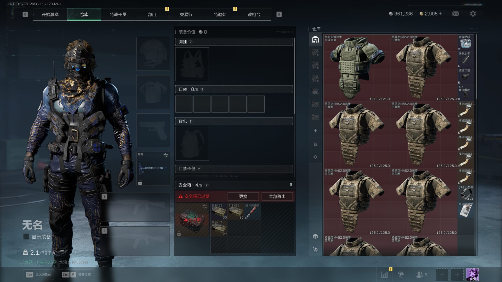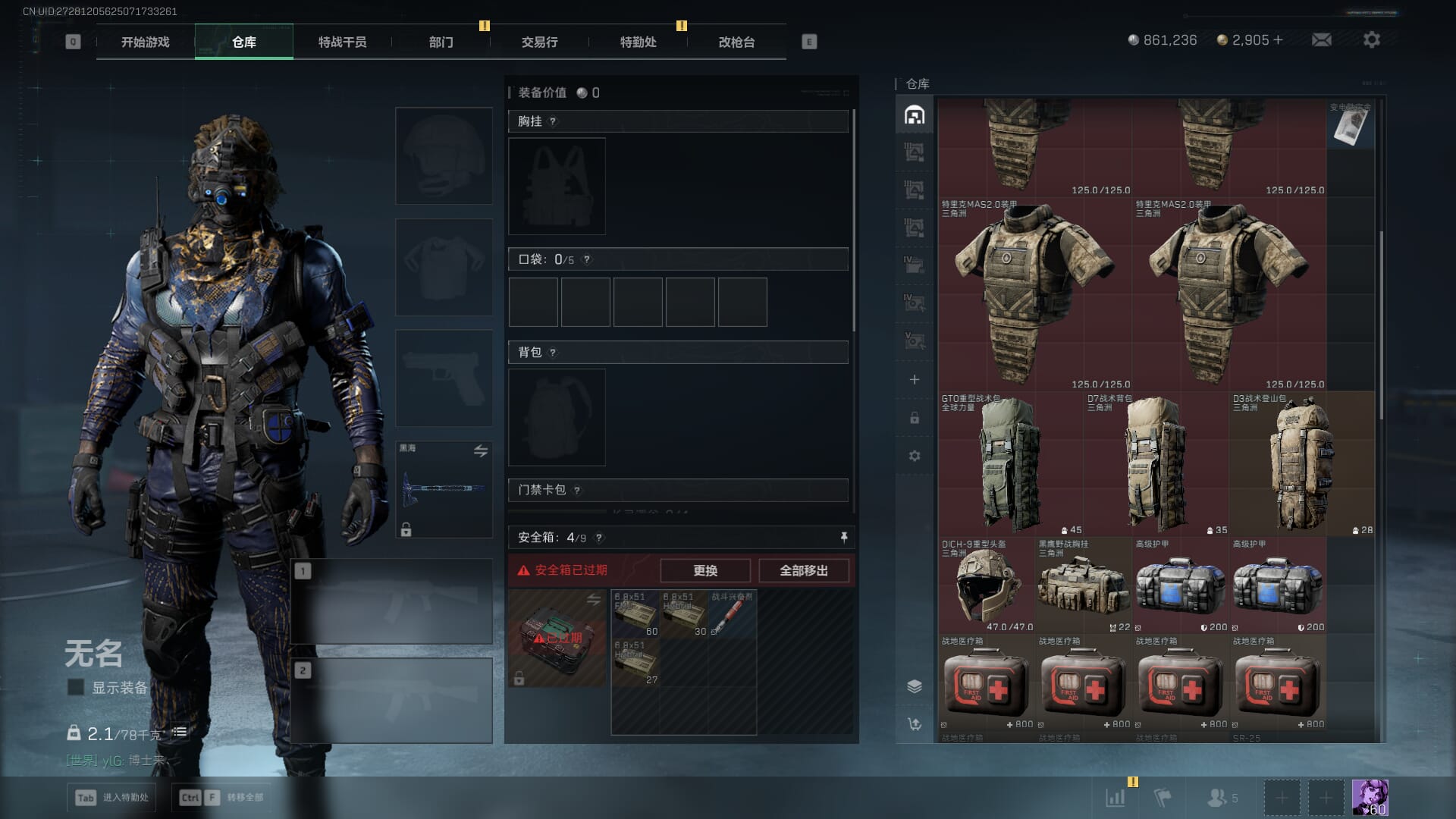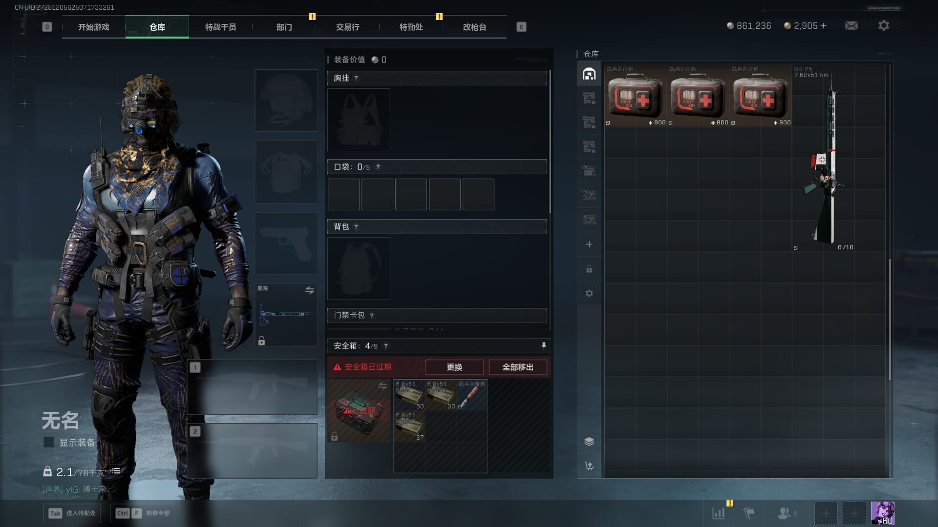 总资产:62.2M,哈夫币:84W,武器皮肤:5,黑鹰_,战场60级:列兵,【安全箱】基础安全箱;【特勤处等级】仓库LV.5,靶场LV.4,训练中心LV.4;【干员皮肤】骇爪维什戴尔,红狼电锯惊魂;【近战武器】近战武器-黑鹰;【步枪皮肤】M4A1突击步枪-阿米娅,SCAR-H战斗步枪-启航,KC17突击步枪-电锯惊魂;【狙击步枪皮肤】R93狙击步枪-维什戴尔;