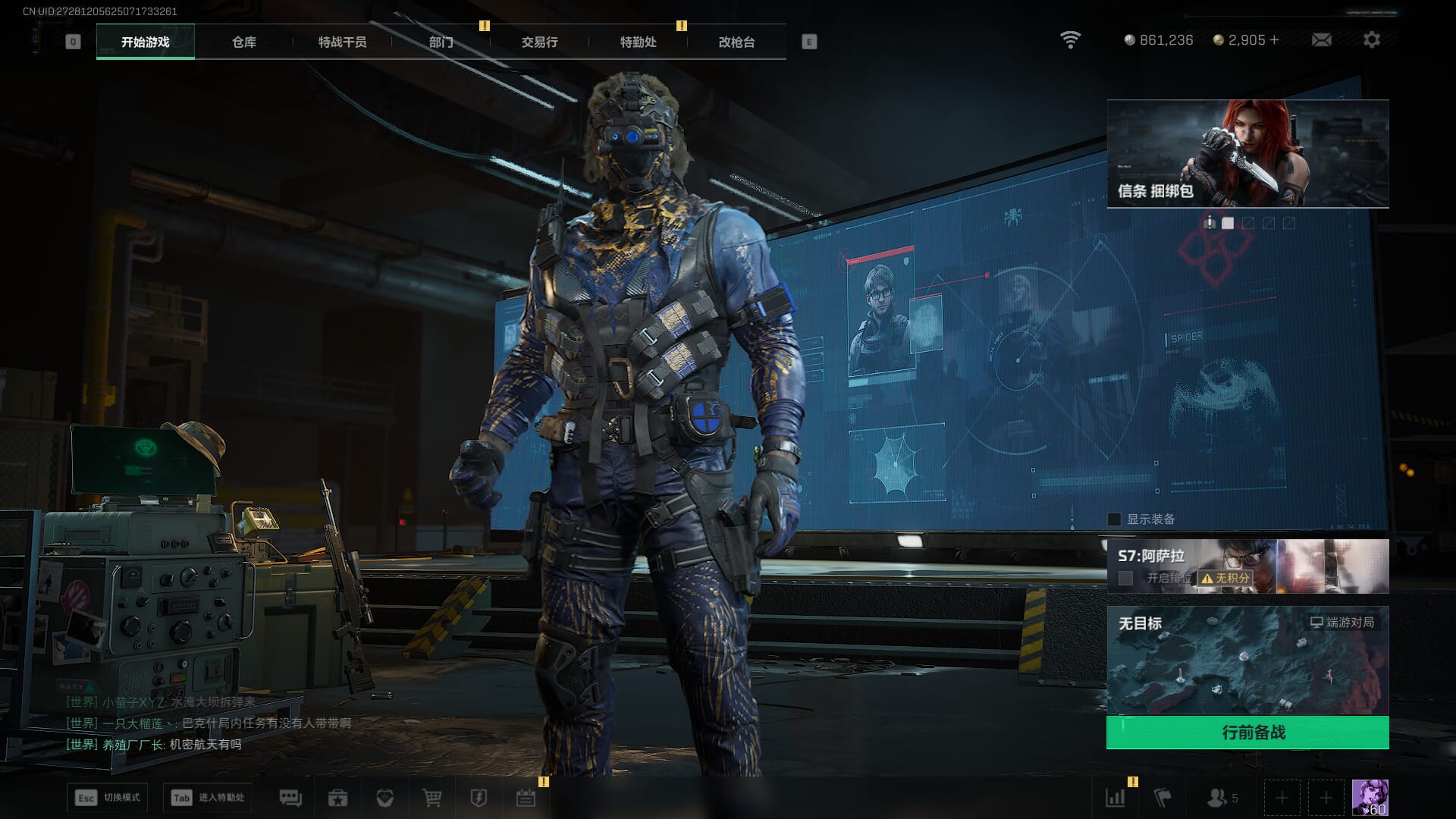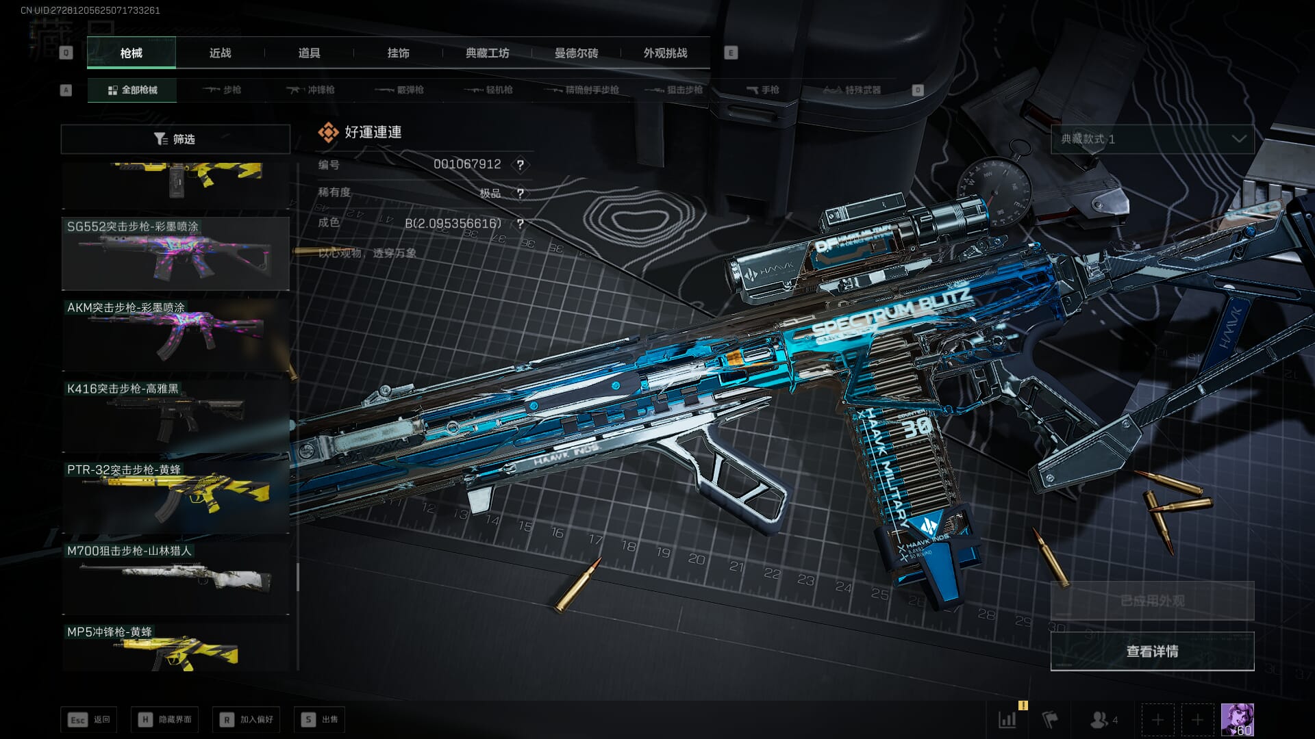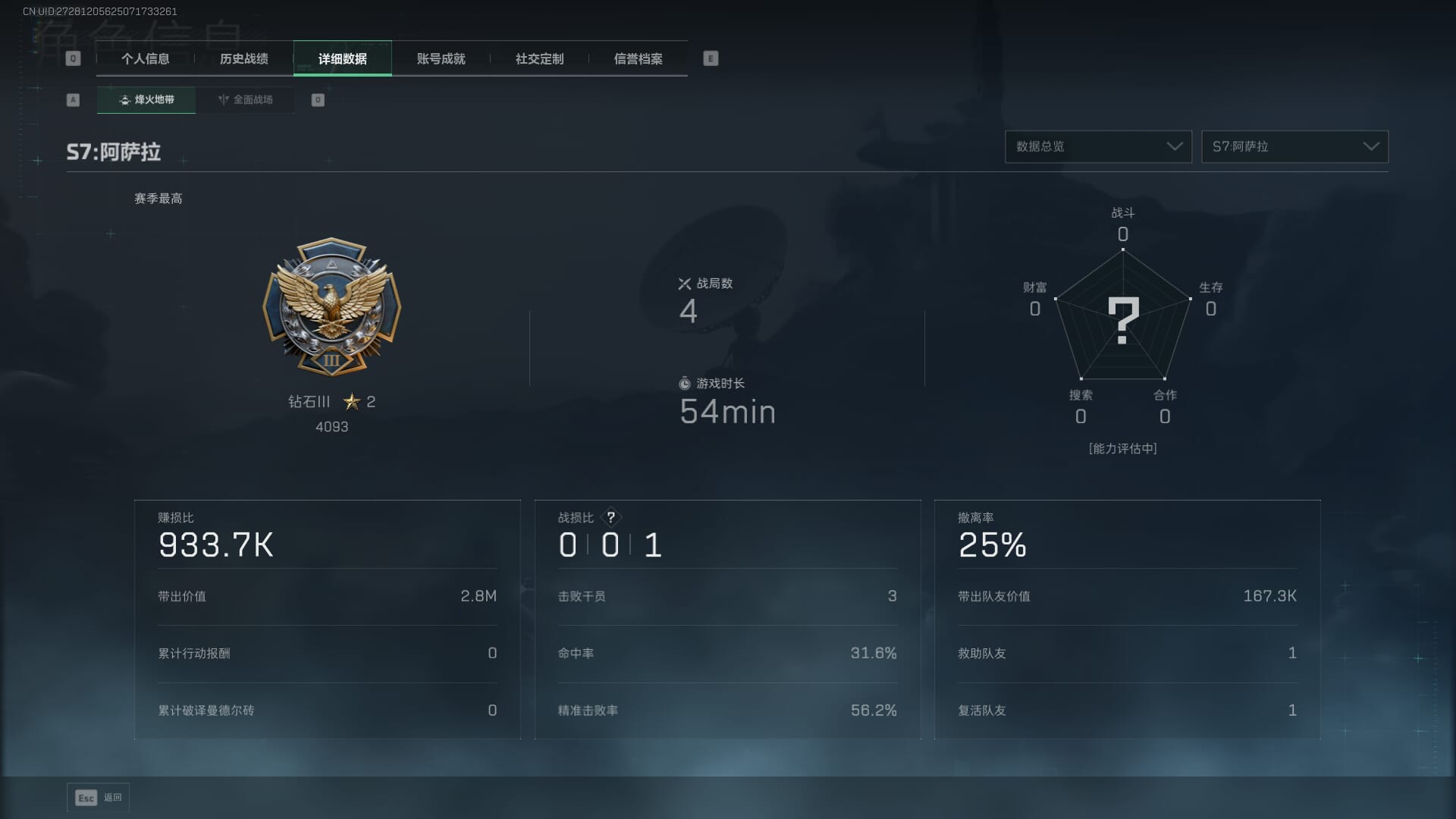 总资产:62.2M,哈夫币:84W,武器皮肤:5,黑鹰_,战场60级:列兵,【安全箱】基础安全箱;【特勤处等级】仓库LV.5,靶场LV.4,训练中心LV.4;【干员皮肤】骇爪维什戴尔,红狼电锯惊魂;【近战武器】近战武器-黑鹰;【步枪皮肤】M4A1突击步枪-阿米娅,SCAR-H战斗步枪-启航,KC17突击步枪-电锯惊魂;【狙击步枪皮肤】R93狙击步枪-维什戴尔;