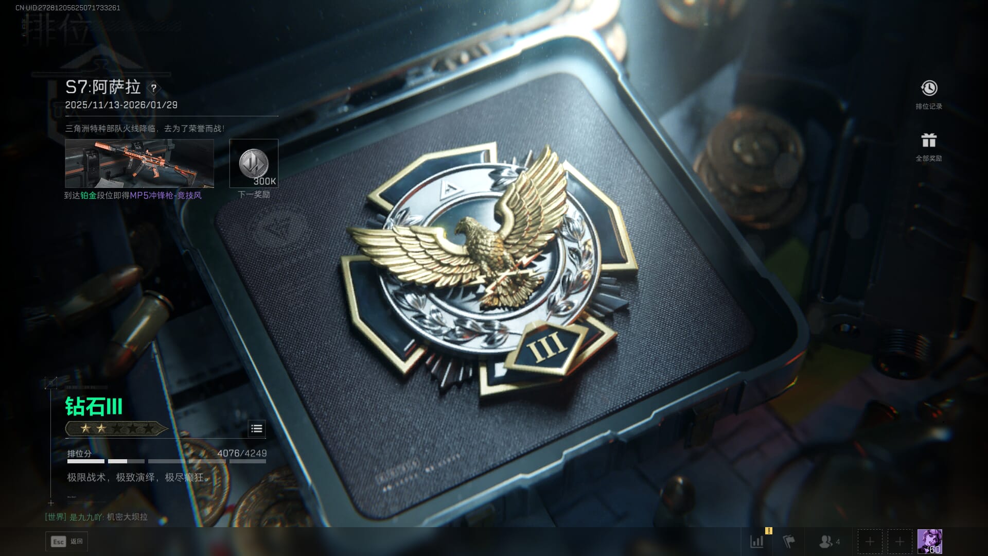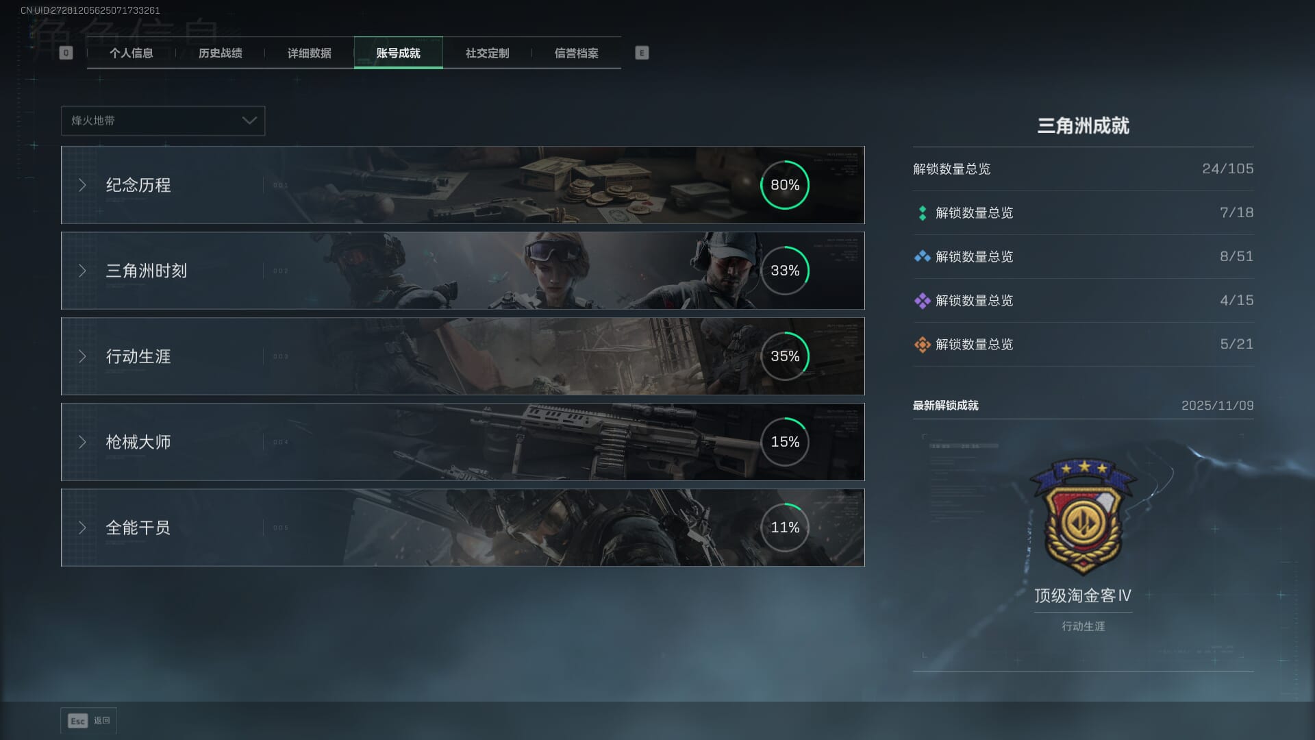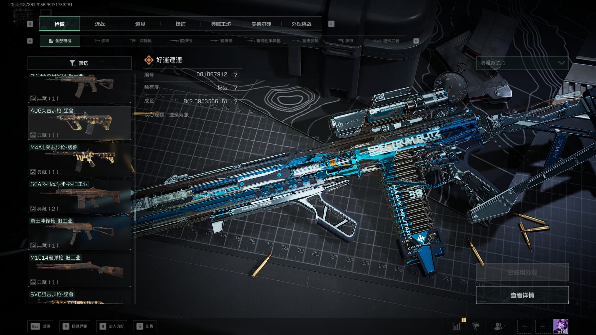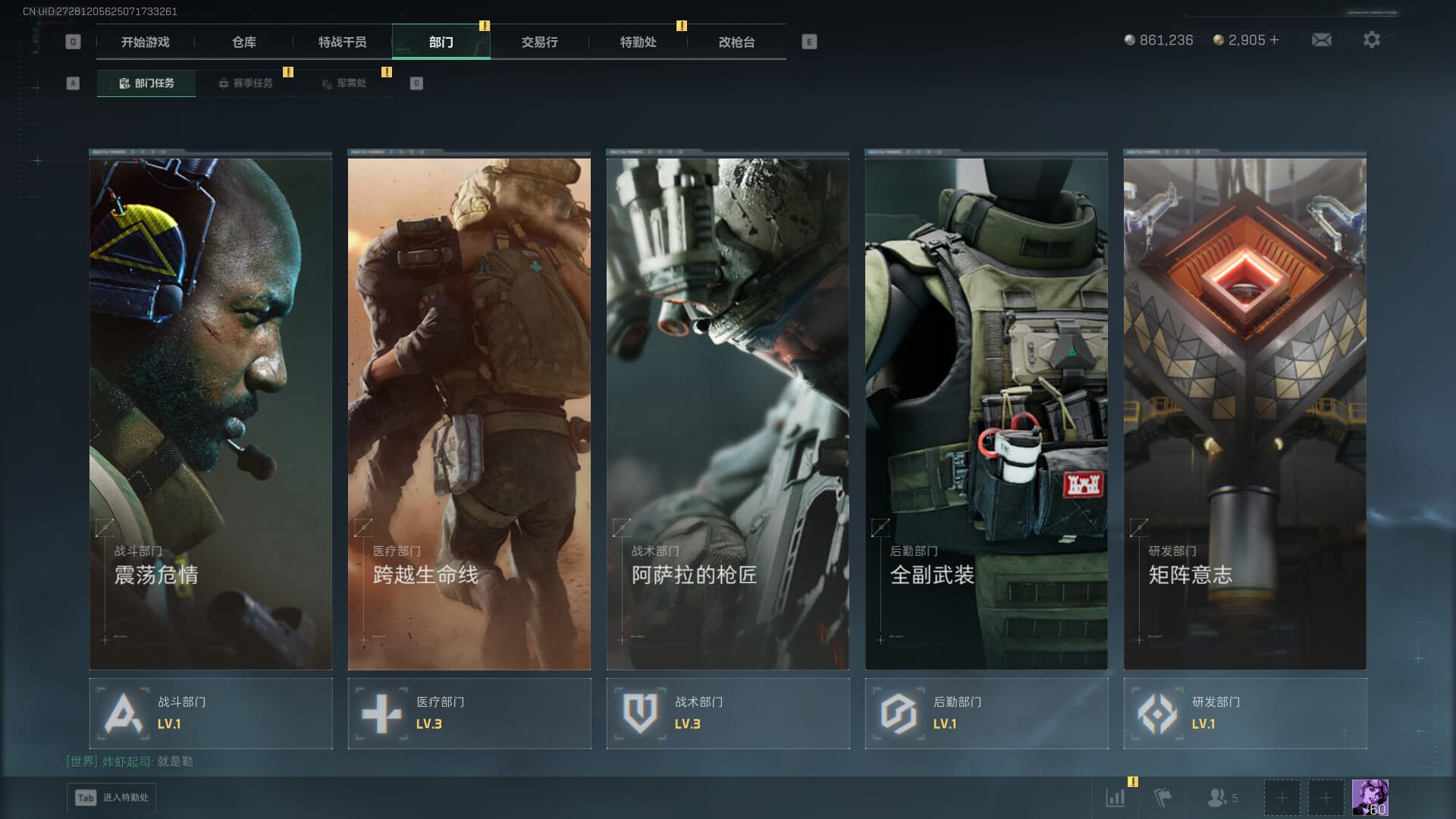 总资产:62.2M,哈夫币:84W,武器皮肤:5,黑鹰_,战场60级:列兵,【安全箱】基础安全箱;【特勤处等级】仓库LV.5,靶场LV.4,训练中心LV.4;【干员皮肤】骇爪维什戴尔,红狼电锯惊魂;【近战武器】近战武器-黑鹰;【步枪皮肤】M4A1突击步枪-阿米娅,SCAR-H战斗步枪-启航,KC17突击步枪-电锯惊魂;【狙击步枪皮肤】R93狙击步枪-维什戴尔;