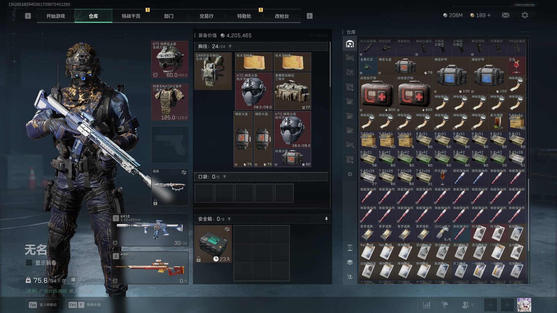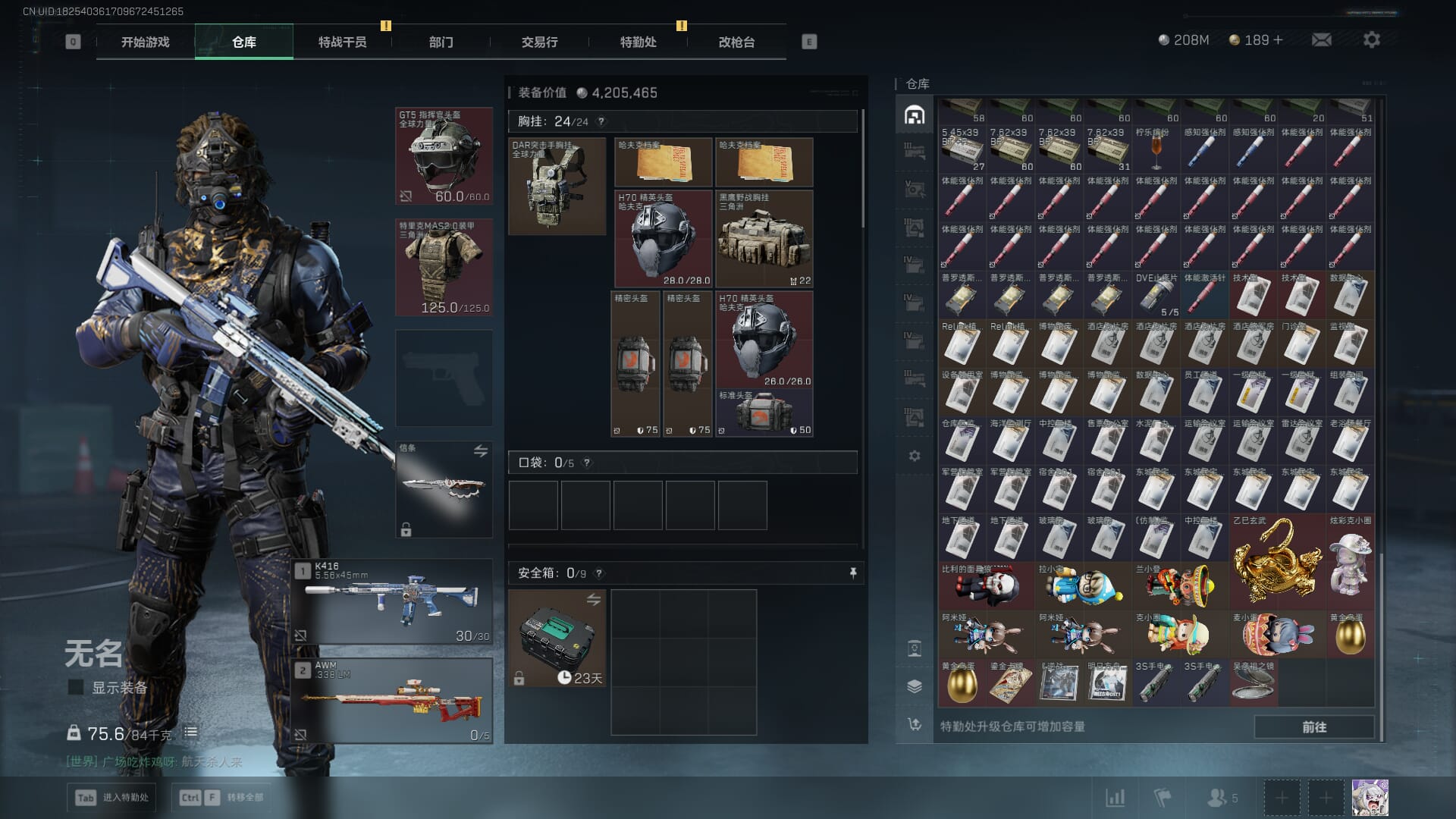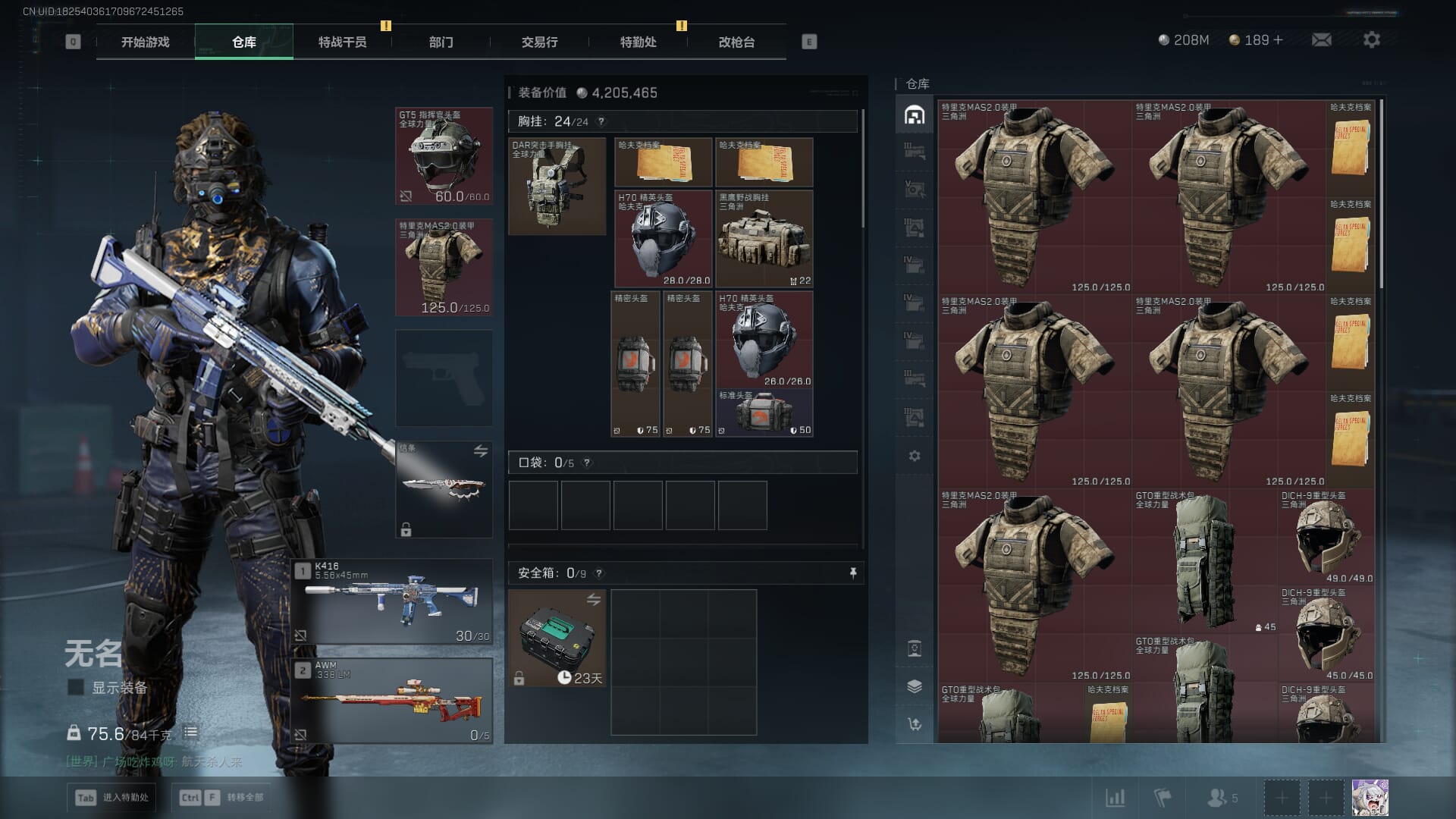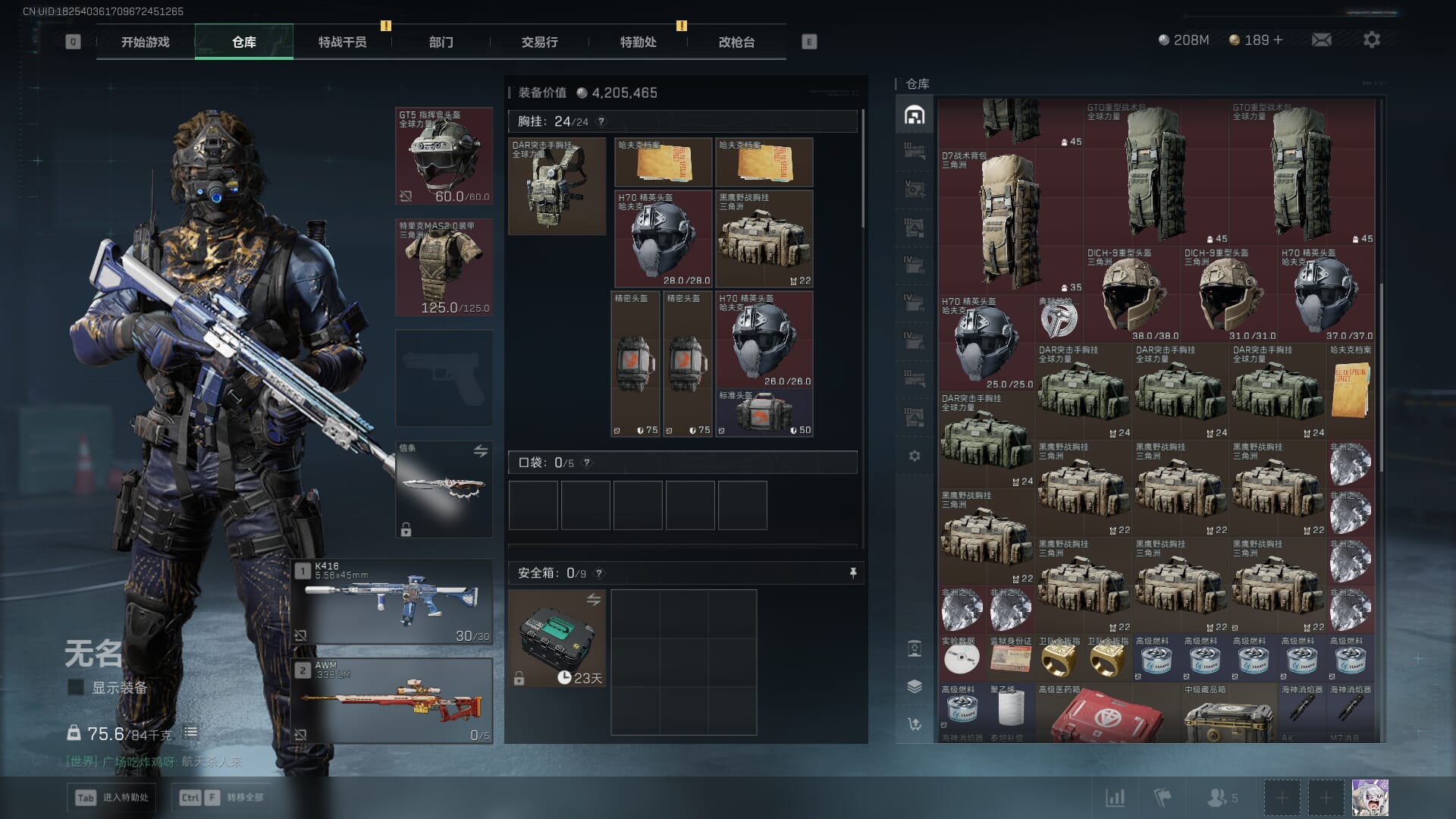 总资产:62.2M,哈夫币:84W,武器皮肤:5,黑鹰_,战场60级:列兵,【安全箱】基础安全箱;【特勤处等级】仓库LV.5,靶场LV.4,训练中心LV.4;【干员皮肤】骇爪维什戴尔,红狼电锯惊魂;【近战武器】近战武器-黑鹰;【步枪皮肤】M4A1突击步枪-阿米娅,SCAR-H战斗步枪-启航,KC17突击步枪-电锯惊魂;【狙击步枪皮肤】R93狙击步枪-维什戴尔;
