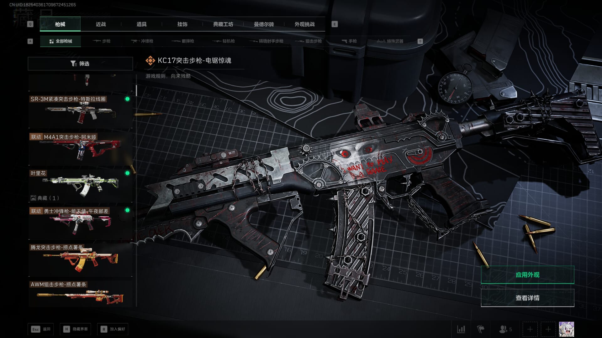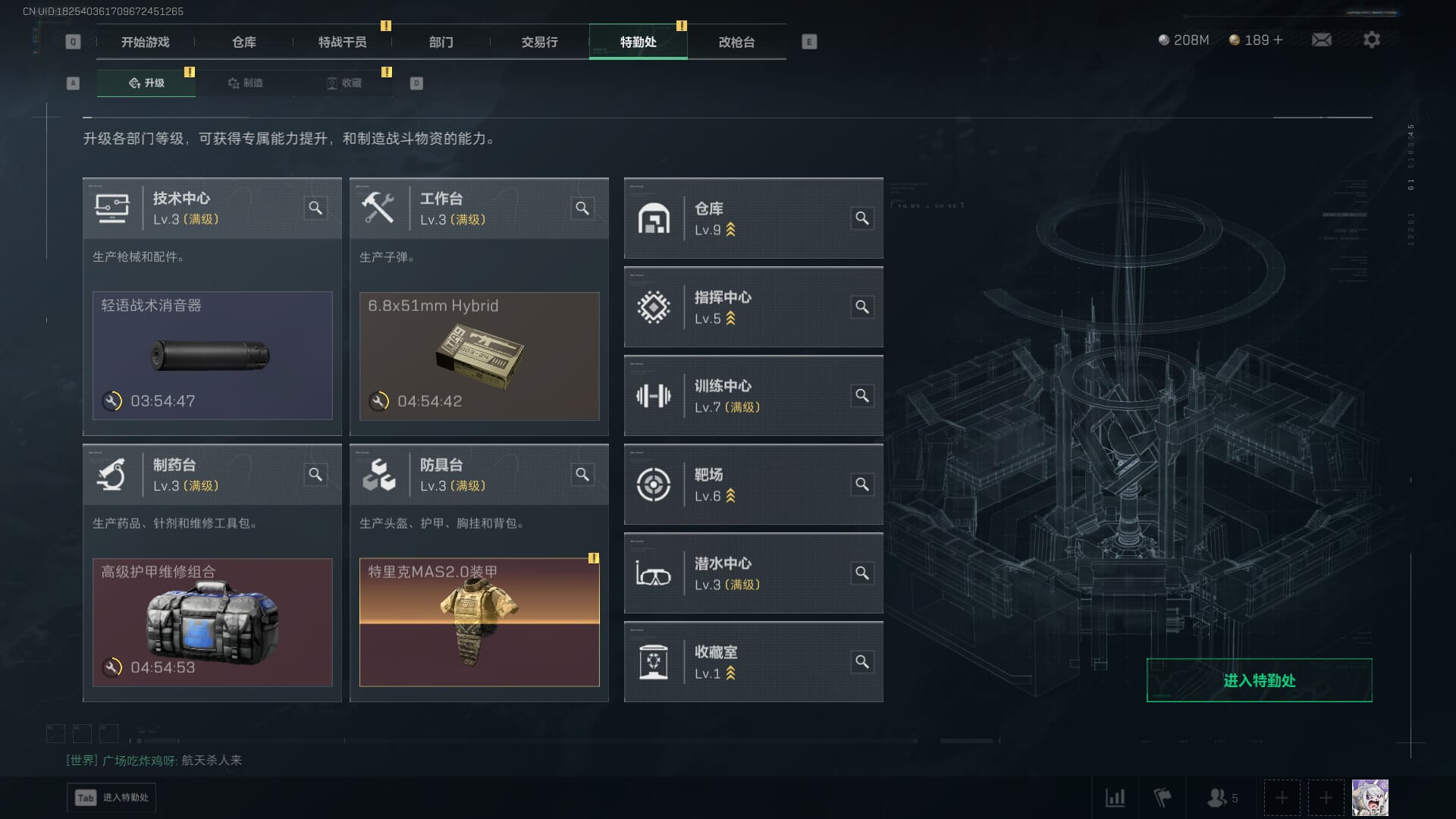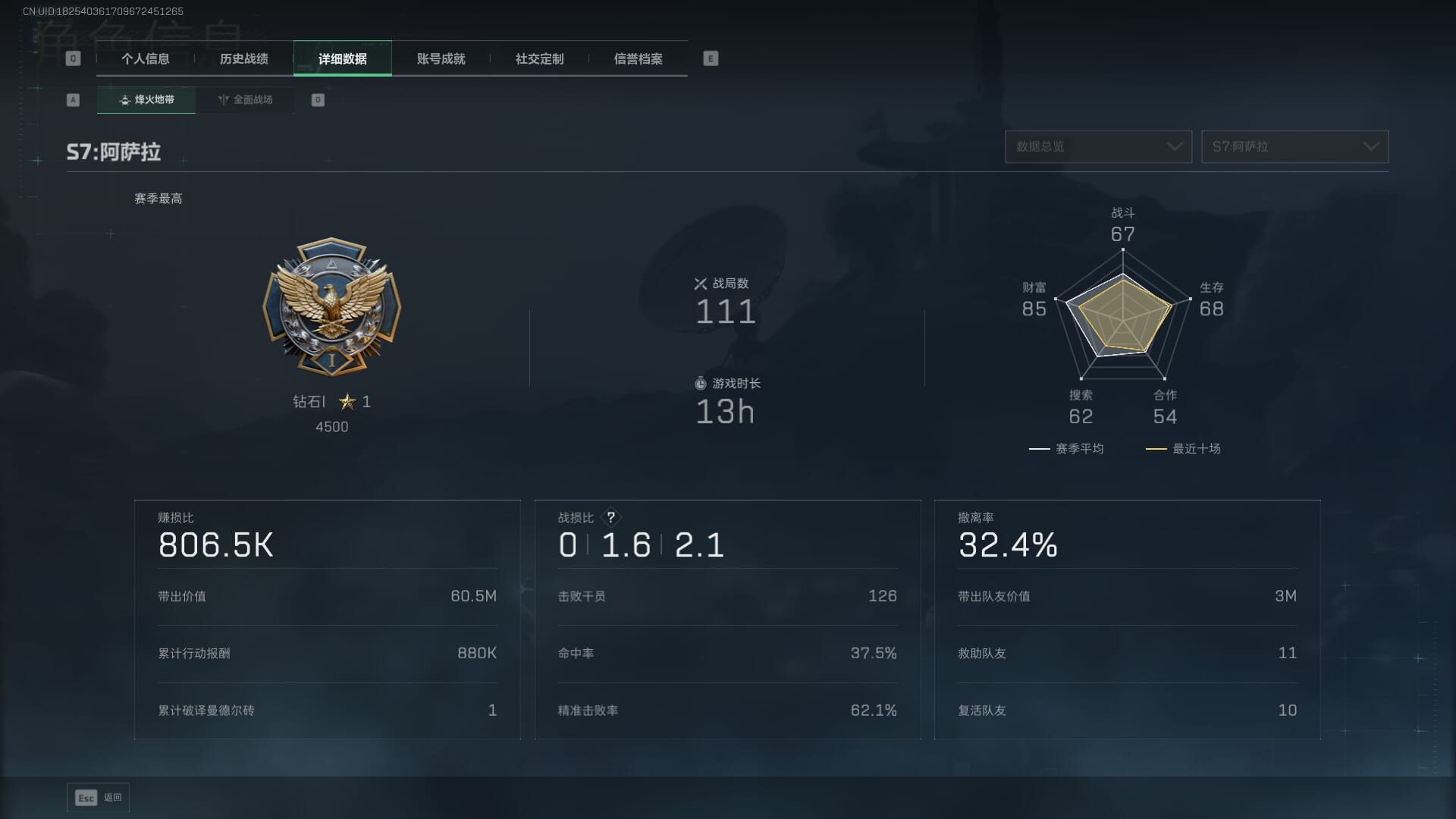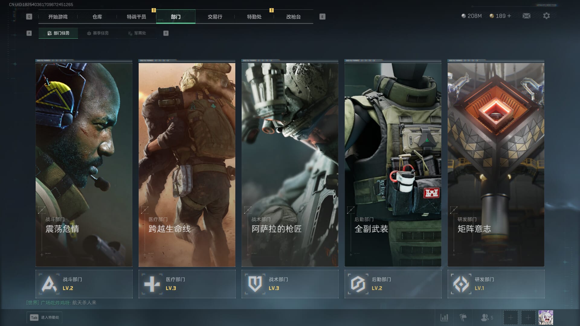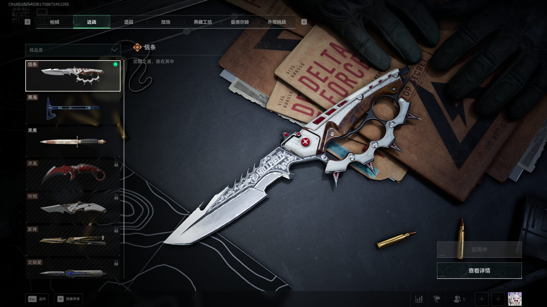 总资产:62.2M,哈夫币:84W,武器皮肤:5,黑鹰_,战场60级:列兵,【安全箱】基础安全箱;【特勤处等级】仓库LV.5,靶场LV.4,训练中心LV.4;【干员皮肤】骇爪维什戴尔,红狼电锯惊魂;【近战武器】近战武器-黑鹰;【步枪皮肤】M4A1突击步枪-阿米娅,SCAR-H战斗步枪-启航,KC17突击步枪-电锯惊魂;【狙击步枪皮肤】R93狙击步枪-维什戴尔;