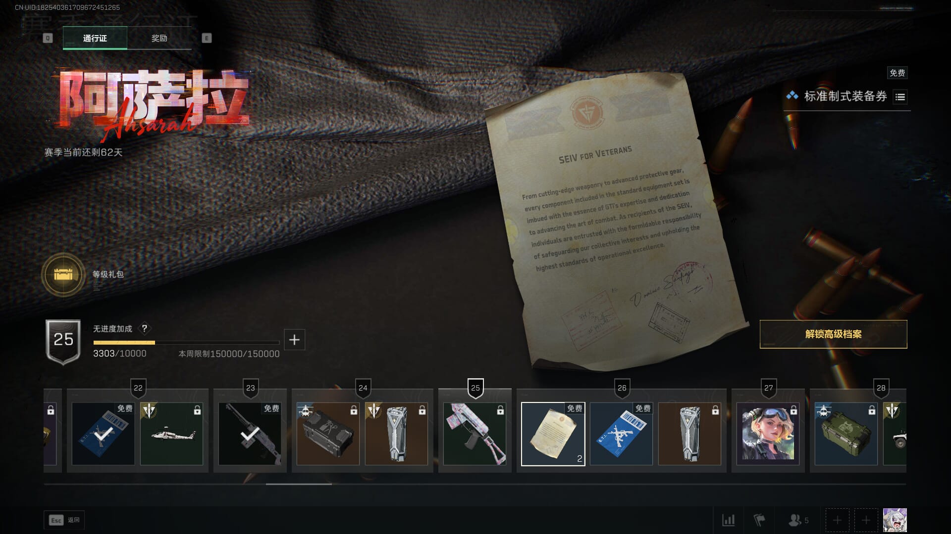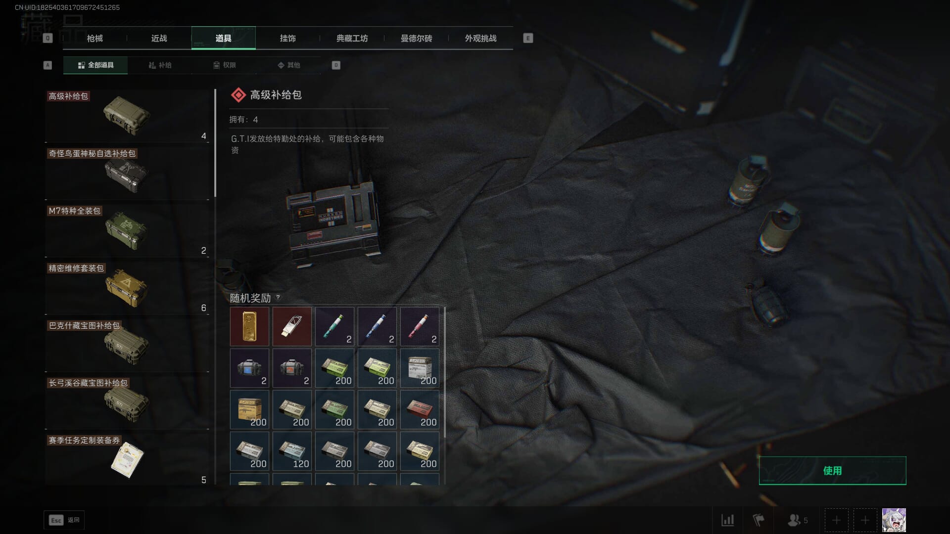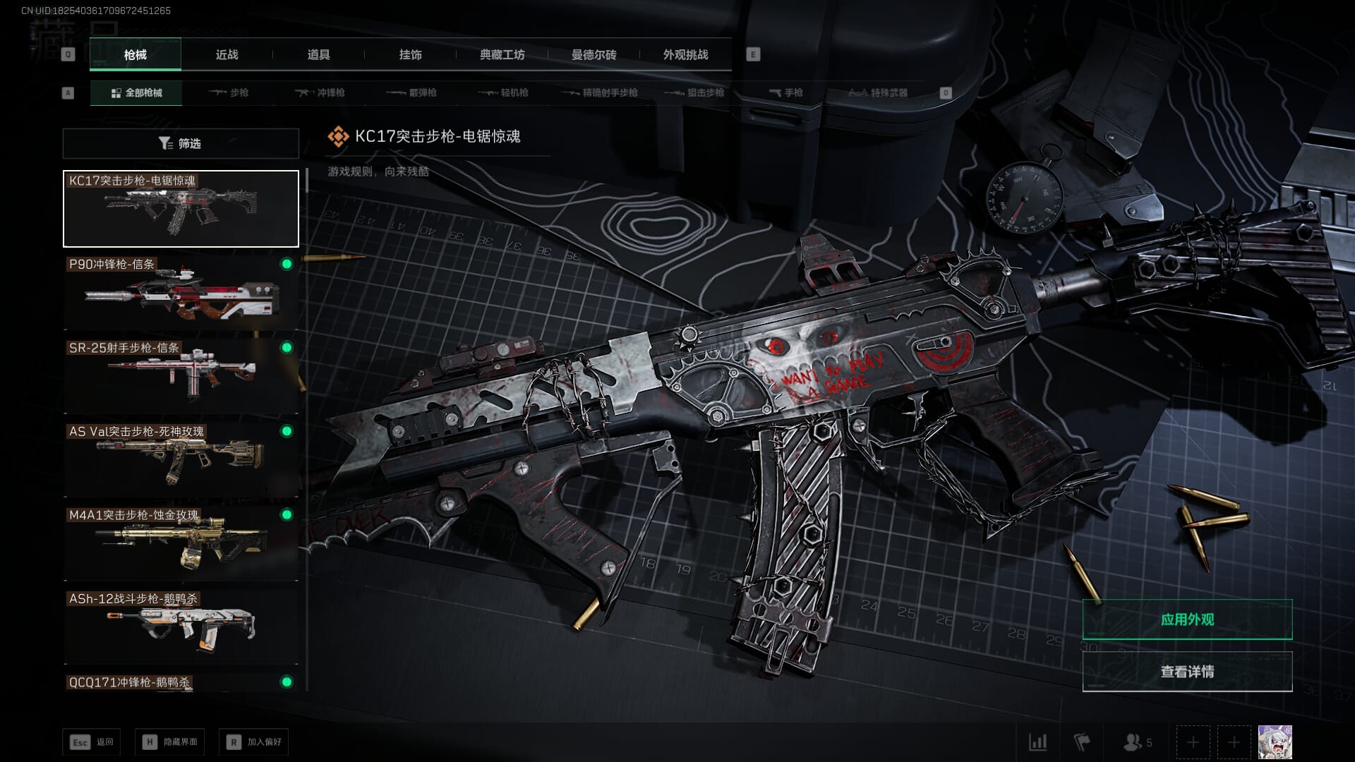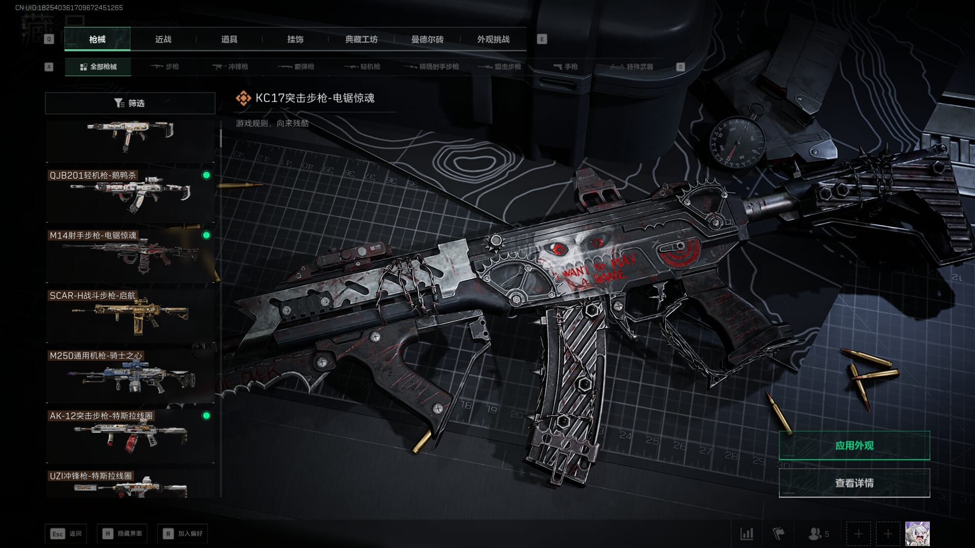 总资产:62.2M,哈夫币:84W,武器皮肤:5,黑鹰_,战场60级:列兵,【安全箱】基础安全箱;【特勤处等级】仓库LV.5,靶场LV.4,训练中心LV.4;【干员皮肤】骇爪维什戴尔,红狼电锯惊魂;【近战武器】近战武器-黑鹰;【步枪皮肤】M4A1突击步枪-阿米娅,SCAR-H战斗步枪-启航,KC17突击步枪-电锯惊魂;【狙击步枪皮肤】R93狙击步枪-维什戴尔;