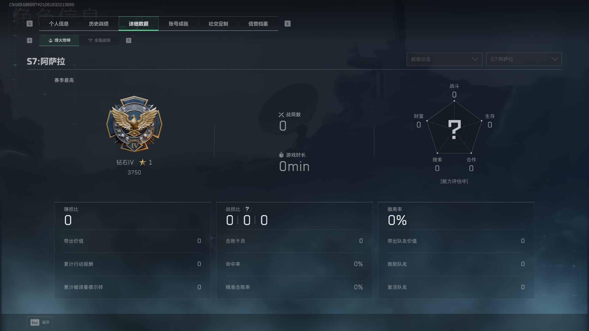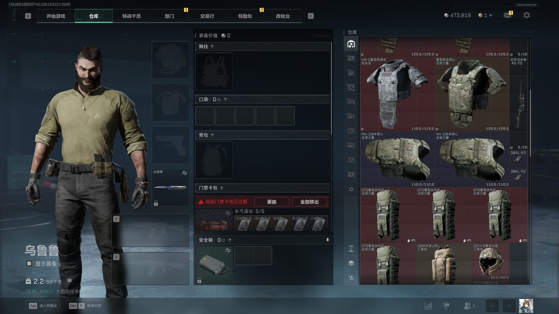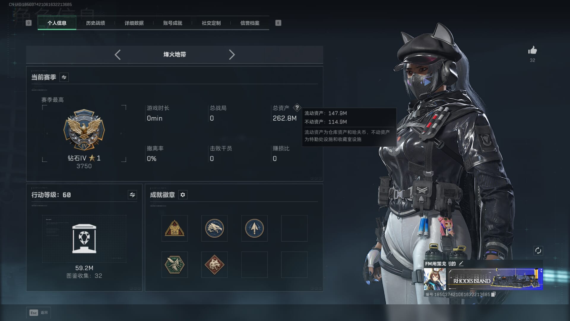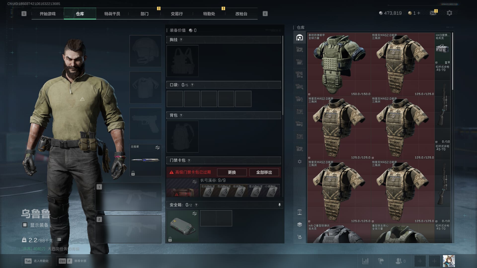 总资产:62.2M,哈夫币:84W,武器皮肤:5,黑鹰_,战场60级:列兵,【安全箱】基础安全箱;【特勤处等级】仓库LV.5,靶场LV.4,训练中心LV.4;【干员皮肤】骇爪维什戴尔,红狼电锯惊魂;【近战武器】近战武器-黑鹰;【步枪皮肤】M4A1突击步枪-阿米娅,SCAR-H战斗步枪-启航,KC17突击步枪-电锯惊魂;【狙击步枪皮肤】R93狙击步枪-维什戴尔;