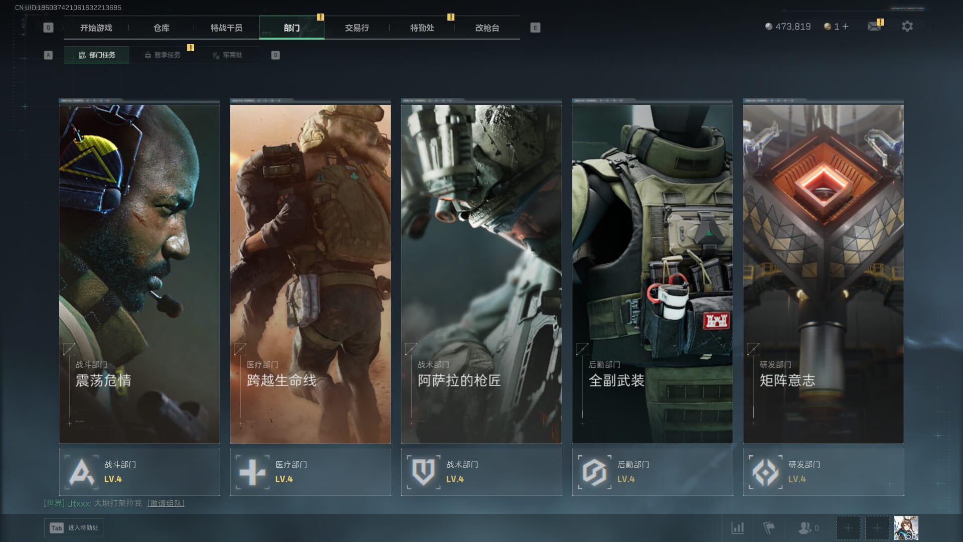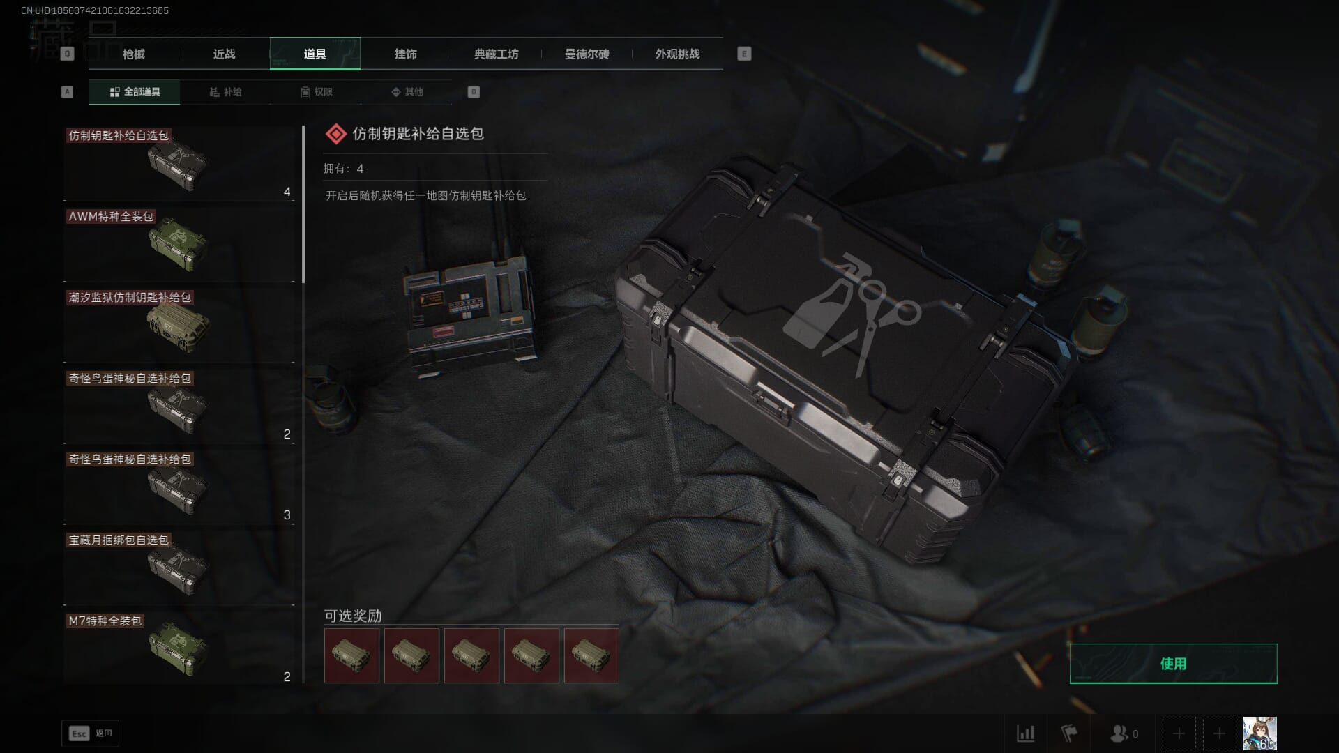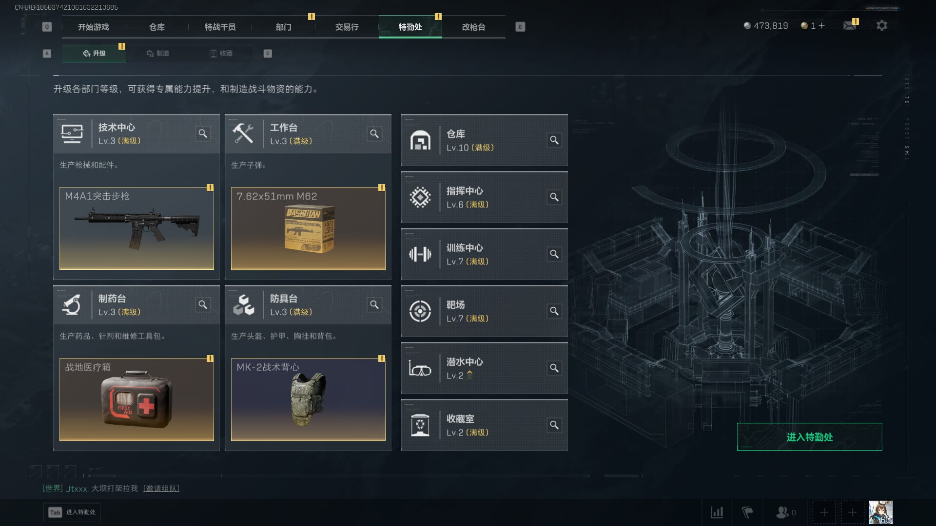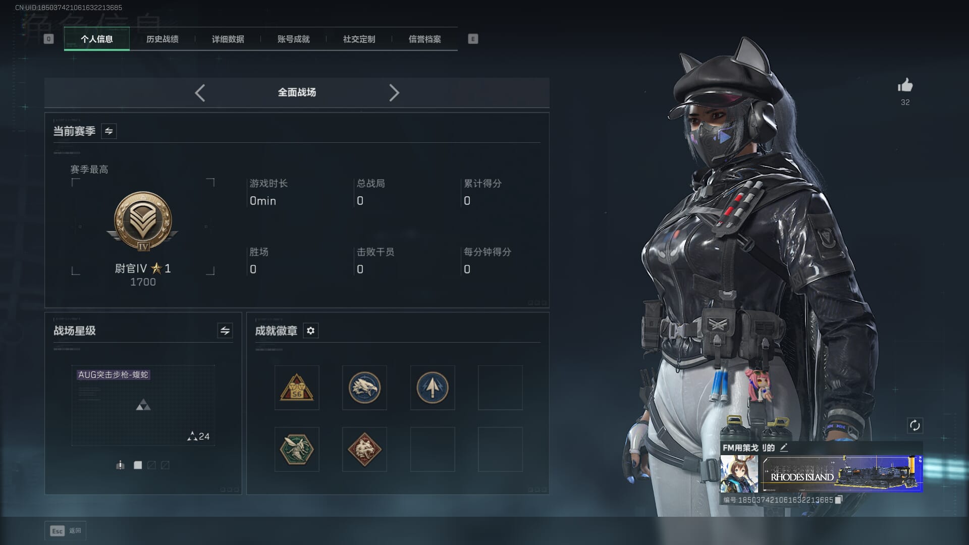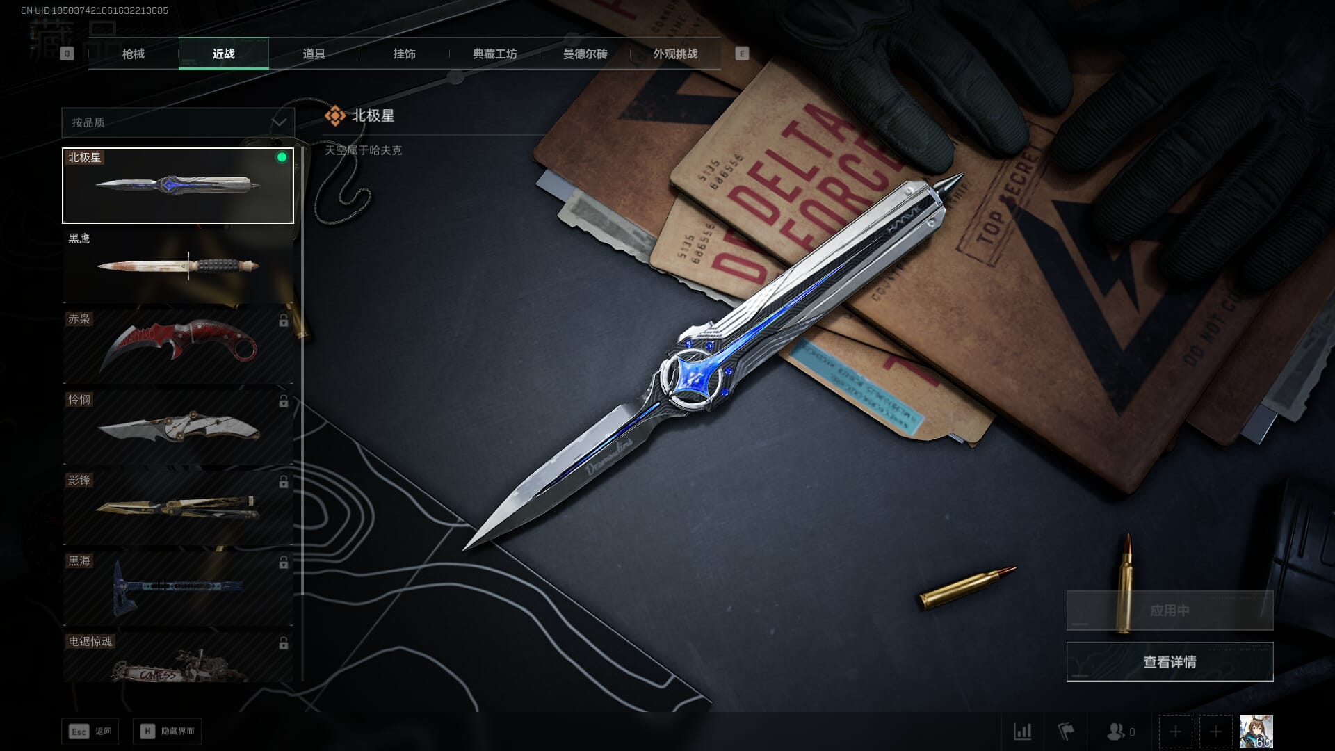 总资产:62.2M,哈夫币:84W,武器皮肤:5,黑鹰_,战场60级:列兵,【安全箱】基础安全箱;【特勤处等级】仓库LV.5,靶场LV.4,训练中心LV.4;【干员皮肤】骇爪维什戴尔,红狼电锯惊魂;【近战武器】近战武器-黑鹰;【步枪皮肤】M4A1突击步枪-阿米娅,SCAR-H战斗步枪-启航,KC17突击步枪-电锯惊魂;【狙击步枪皮肤】R93狙击步枪-维什戴尔;