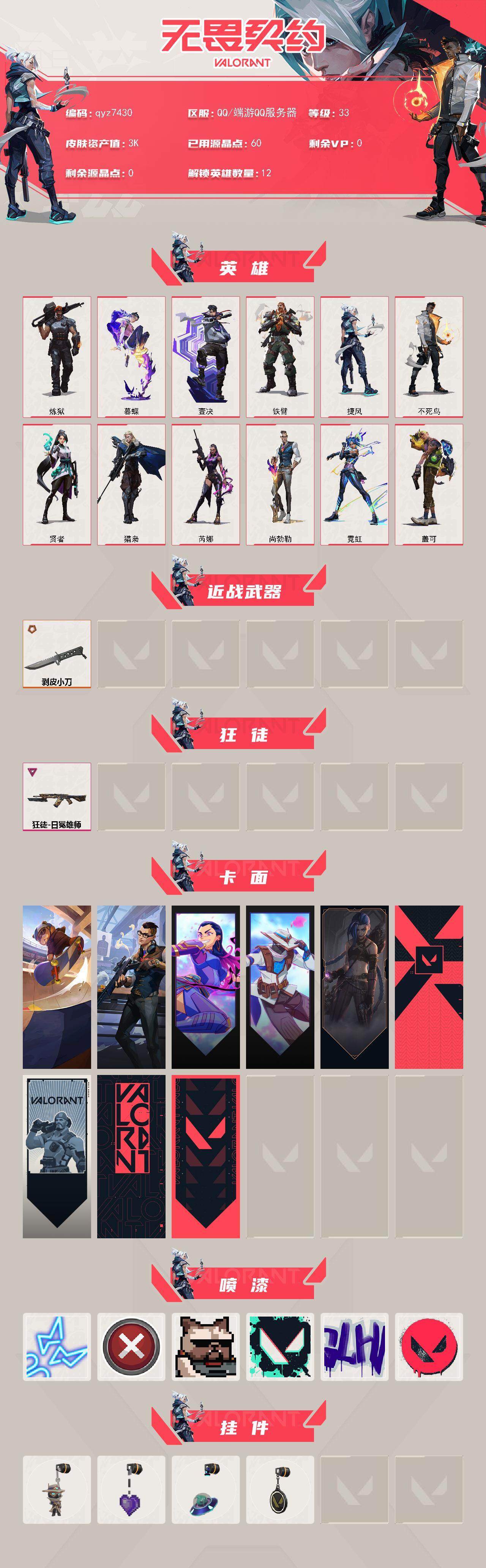 【QYZ795】卓越*2/皮肤*3/等级*40/段位:黑铁/幻棱/炼狱/暮蝶/壹决/捷风/不死鸟/贤者/猎枭/芮娜/尚勃勒/霓虹/狂徒-盖亚的复仇/鬼魅-天界神兵/纤云弄巧 卡面/无畏契约GO!第一卷:芮娜 卡面/无畏契约GO!第一卷:零 卡面/钢锁vs盖可 卡面/代号红色 卡面/新兵报到 卡面/V契约 卡面/无畏契约 卡面/买装还是存钱 喷漆/无畏契约GO!第一卷:贤者 喷漆/暴走萝莉 喷漆/胜利属于无畏契约 喷漆/GLHF 喷漆/无畏契约 喷漆/天外飞客 挂饰/无畏契约 纪念币 挂饰