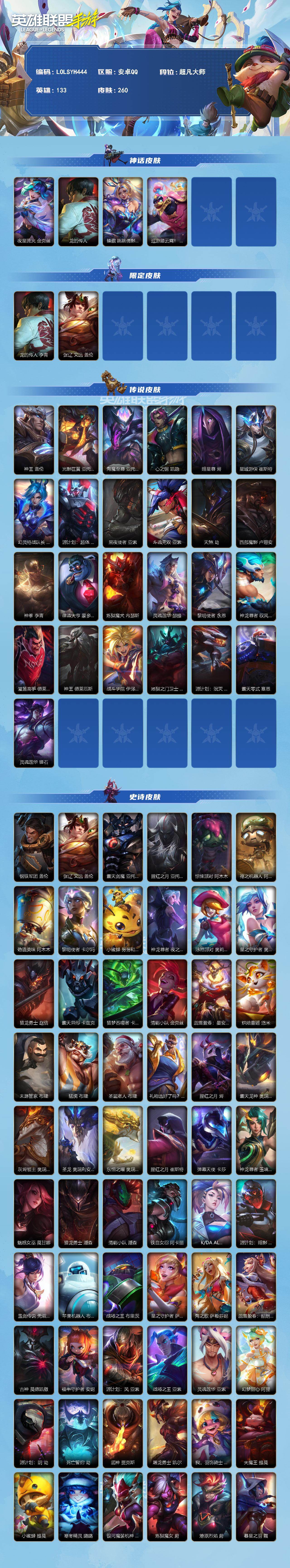 商品描述:【LOLSYH444】133英雄/260皮肤/4神话/25传说/超凡大师/夜星流火 金克丝/龙的传人 李青/臻藏 跳跳倩影 厄运小姐/巡游踏云霄! 墨菲特/张辽 文远 盖伦/神王 盖伦/光影巨翼 亚托克斯/海魔至尊 亚托克斯/心之钢 凯隐/暗星尊 烬/星域游侠 崔斯特/幻灵特战队长 菲奥娜/源计划:超体 莫德凯撒/黑夜使者 亚索/斗魂无双 亚索/天煞 劫/西部魔影 卢锡安/神拳 李青/律政大亨 蒙多医生/炼狱魔犬 内瑟斯/灵魂莲华 瑟提/黎明使者 永恩/神龙尊者 驭风啸龙 易/灌篮高手 德莱厄斯/神王 德莱厄斯/战斗学院 伊泽瑞尔/地狱之门卫士 加里奥/源计划:泯灭 雷克顿/霸天零式 赛恩/