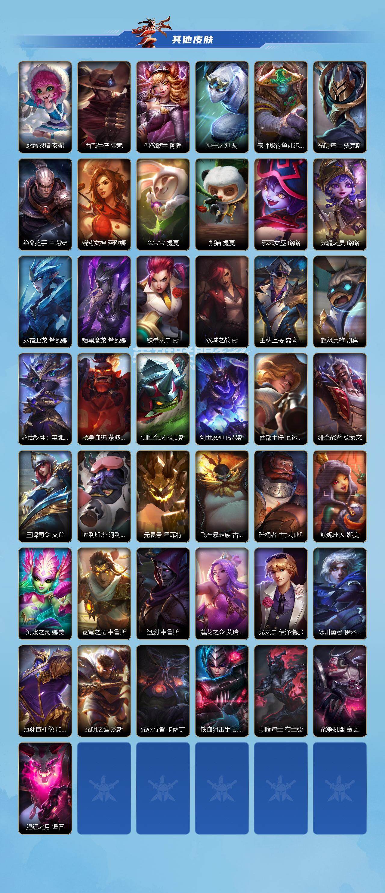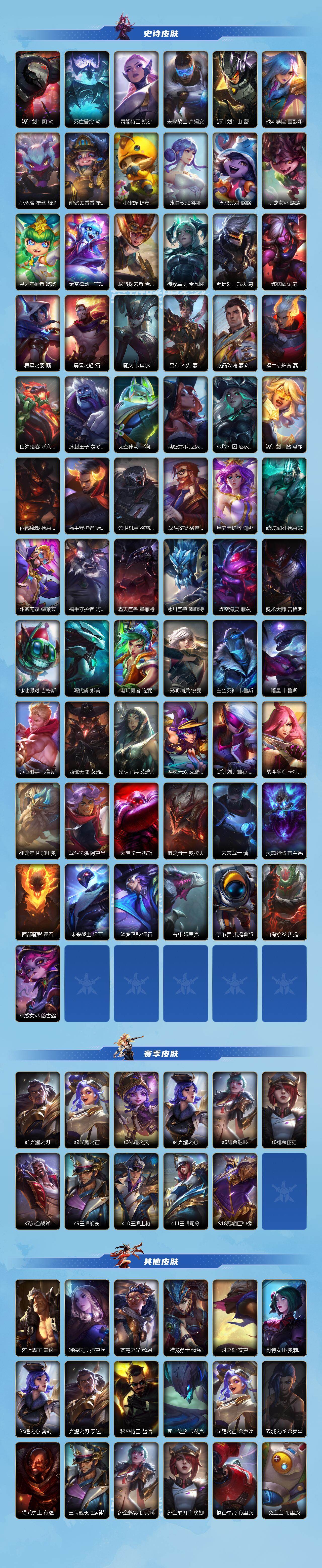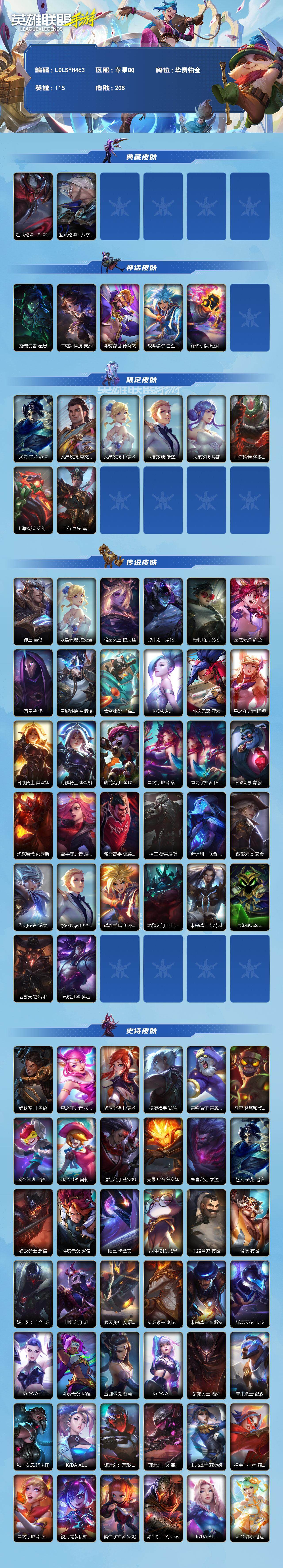 商品描述:【LOLSYH463】115英雄/208皮肤/华贵铂金/超武乾坤:虹影 劫/超武乾坤:孤拳 瑟提/摄魂使者 薇恩/海克斯科技 安妮/斗魂耀世 德莱文/战斗学院 白金学长 伊泽瑞尔/涂鸦小队 斑斓艺术 布兰德/赵云 子龙 赵信/水晶玫瑰 嘉文四世/水晶玫瑰 拉克丝/水晶玫瑰 伊泽瑞尔/水晶玫瑰 娑娜/山海绘卷 诺提勒斯/山海绘卷 沃利贝尔/吕布 奉先 嘉文四世/神王 盖伦/暗星女王 拉克丝/源计划:净化 薇恩/光明哨兵 薇恩/星之守护者 金克丝/暗星尊 烬/星域游侠 崔斯特/太空律动 “猫猫”布里和里茨 布里茨/K/DA ALL OUT 萨勒芬妮/斗魂无双 亚索/星之守护者 阿狸/日蚀骑士 蕾