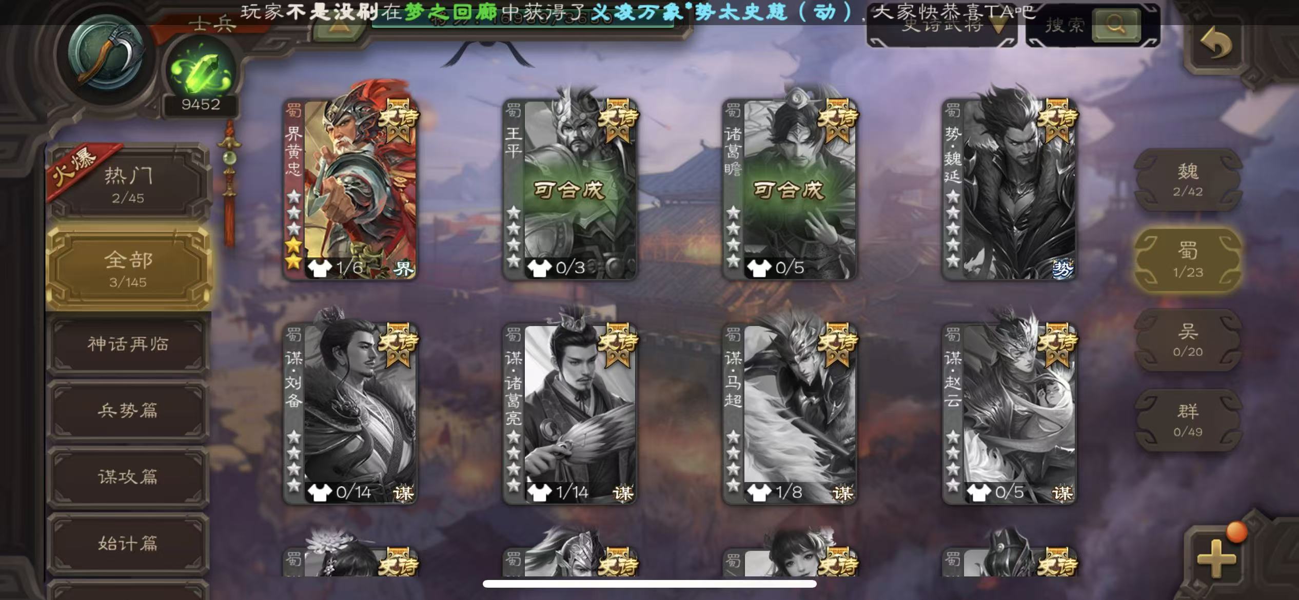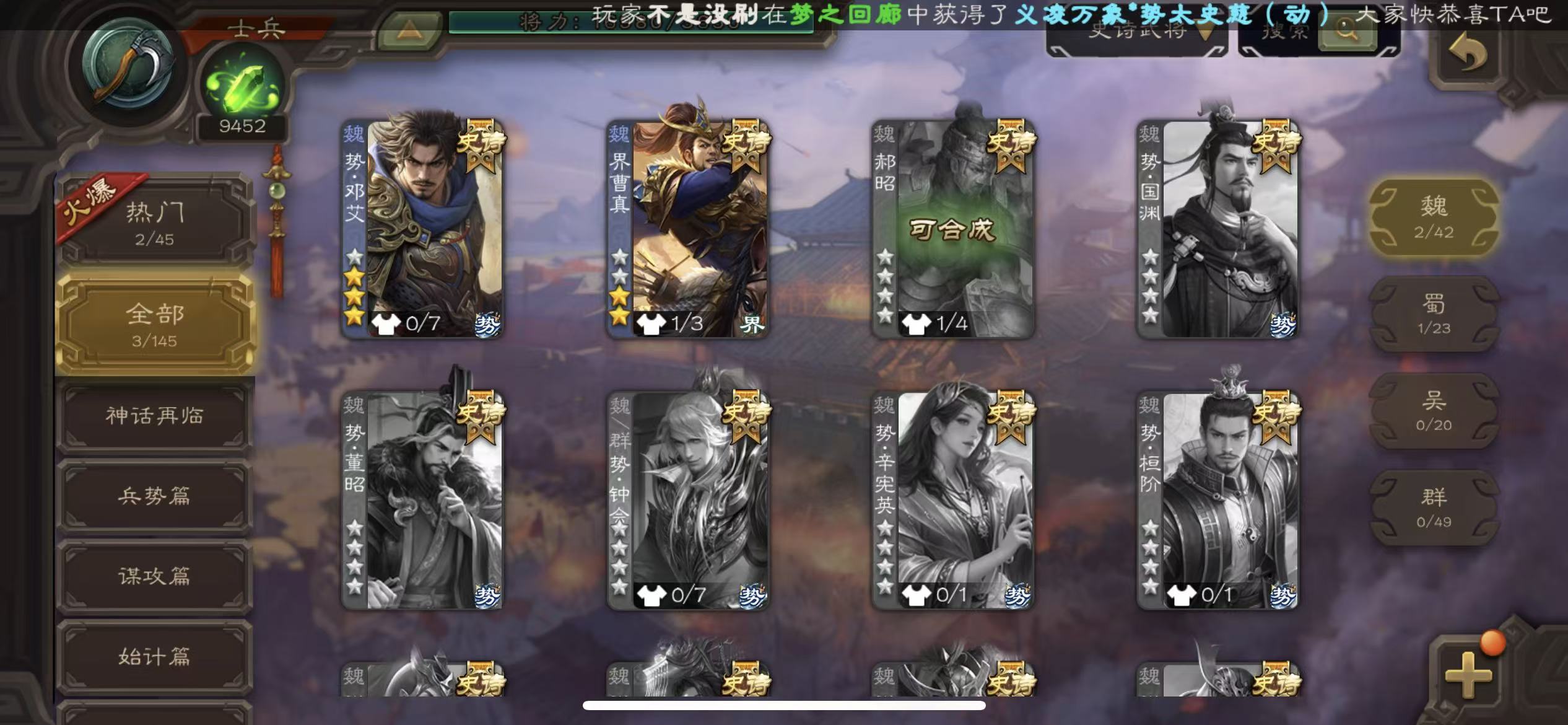 士兵火龙果势魏延5史诗8万羽毛8500将魂125招募令三卡