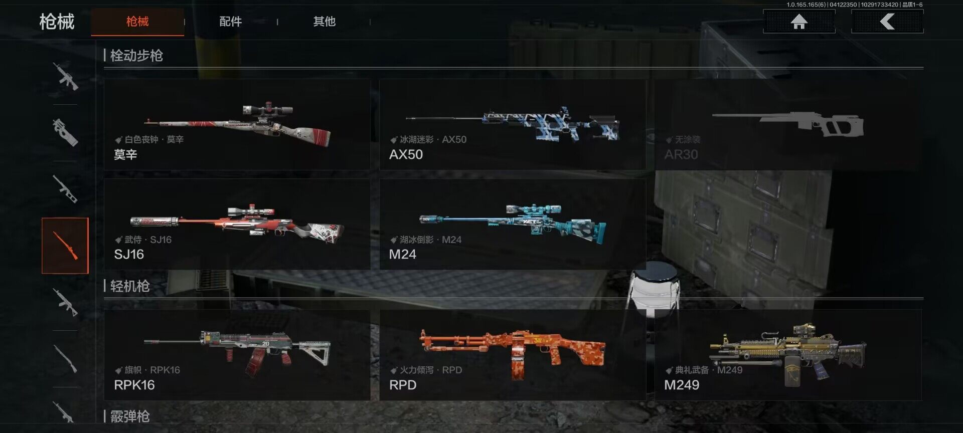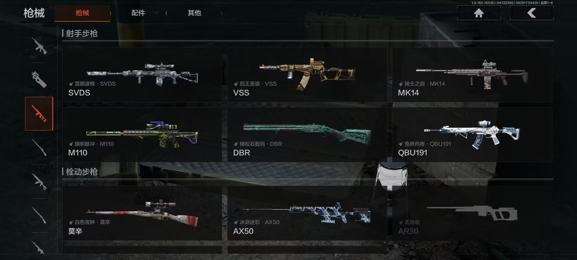 【AQD346】段位:新锐/仓库价值(百万):12/下弦月/收割者/地脉深处FAL/镀火熔金H416/告丧夜曲AR57/旧王圣谕QBZ191/利齿风暴MPX【AQZG2152】等级:30/段位:专家/仓库价值(百万):189.4/柯恩币:100000000/急袭弯刀/下弦月/寒牙手刺/裁决手杖剑/幽燕钛玄/苍穹利爪/盘牙彻甲短刃/深潜行者II/黑卡蒂/冥河/蝮蛇/白蔷薇斯黛拉/危崖魅影作战服/苍白隐者伪装服/长缨风擎AX50/棱光裂变QBU191/冰河碎影MK14/千炼铁阵MK14/黑金弹头P90/利齿风暴MPX/浮鳞影青QBZ192/旧王圣谕QBZ191/玉擎天工AN94/林中人FAL/竞技FAL/天工炉火A545/冲刺极限QBZ192