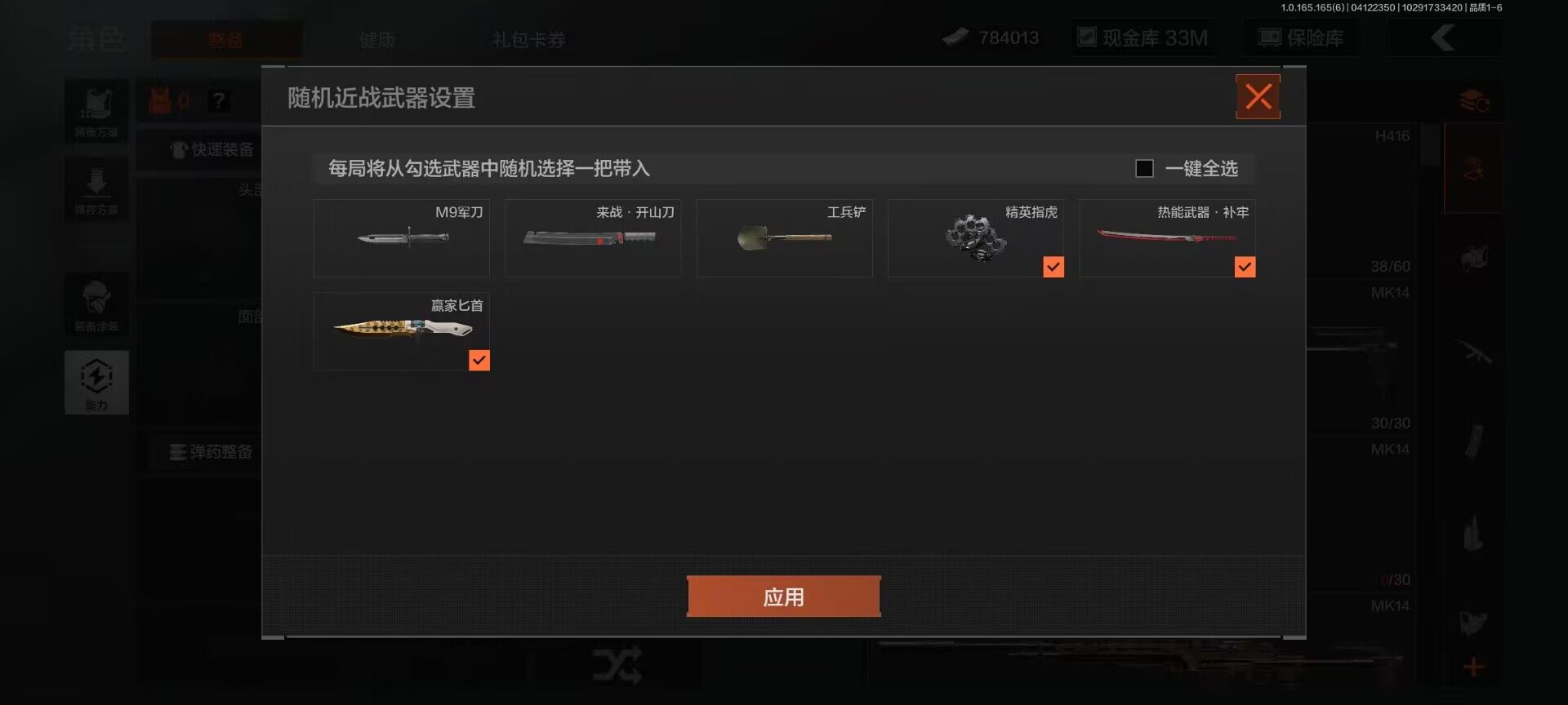 【AQQH1183】段位:新锐/仓库价值(百万):69/掠影马来剑/赤火炉心/工兵铲/秘密任务艾薇塔/镀火熔金H416/竞技风潮M4A1/百锻铁骑AEK/旗帜AEK/赤帽要塞AR57/千炼铁阵MK14/利齿风暴MPX/近卫荣誉RPK16/长夜千军武将/冲刺极限QBZ192