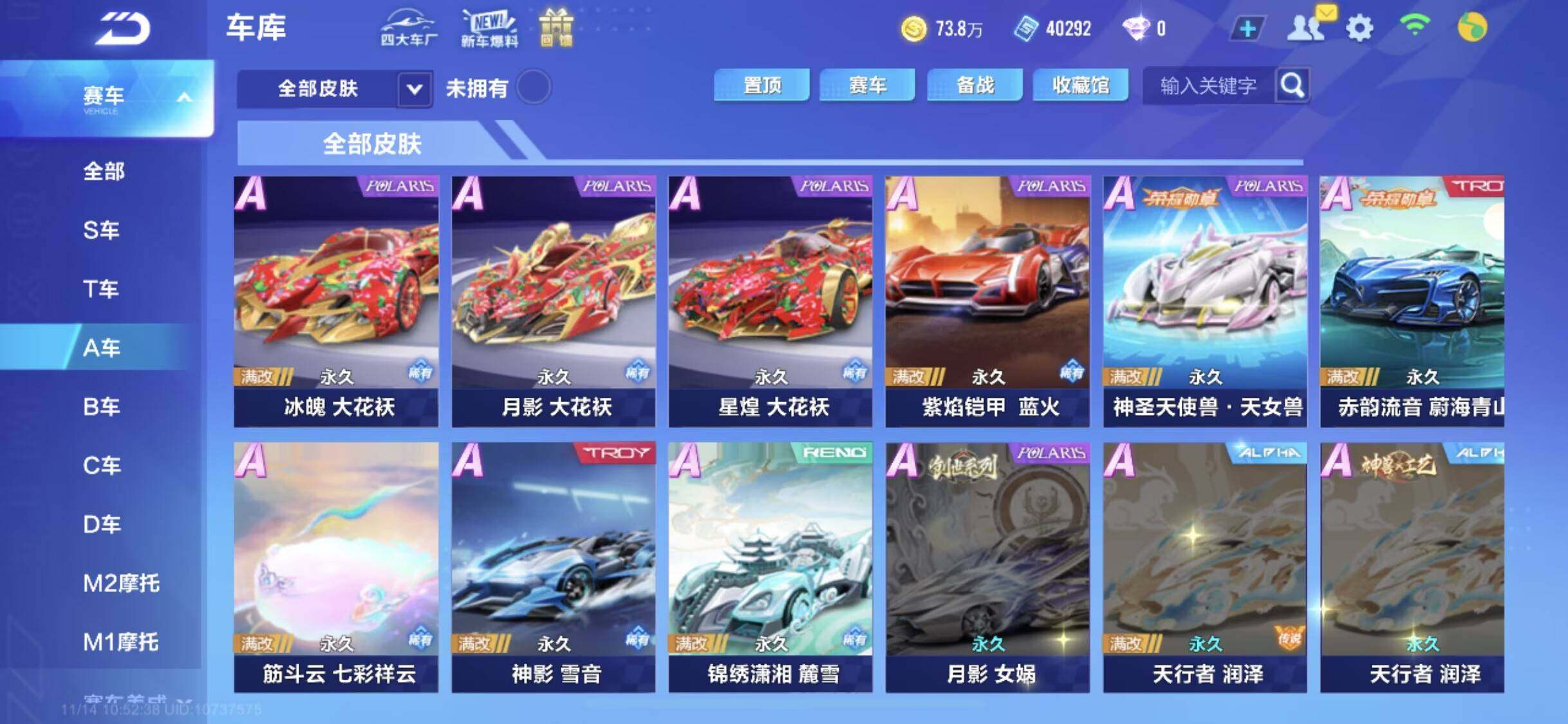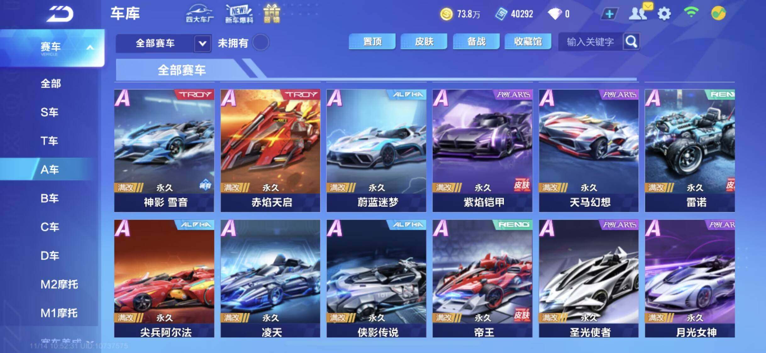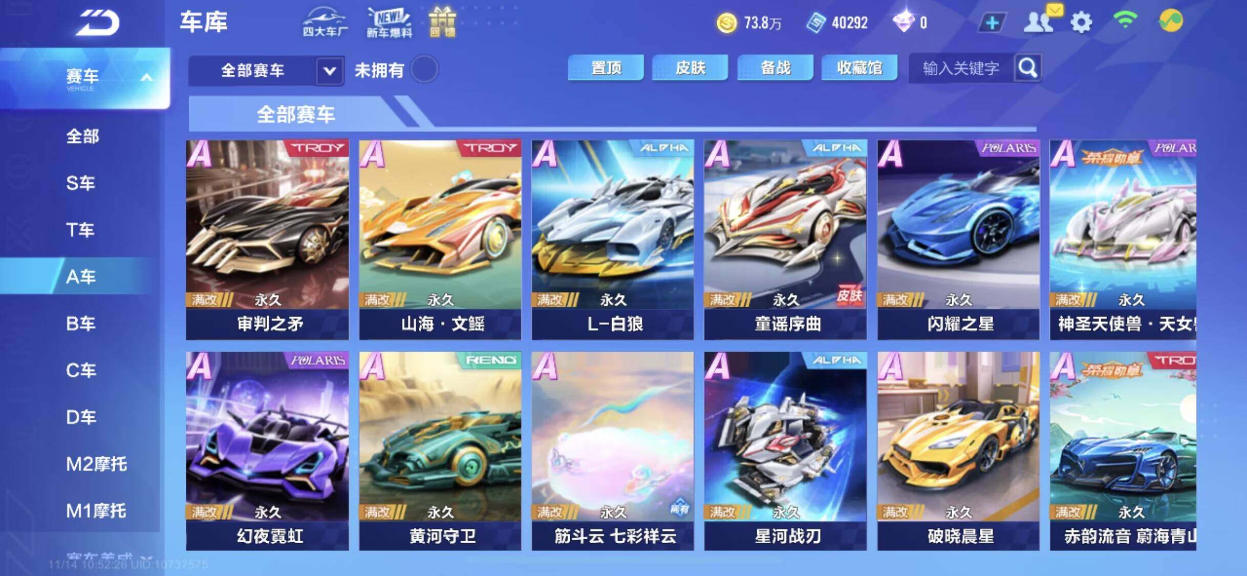 [14043231]【永久T车】:源极之星EXA,序列未来LYR,孙悟空,奥莉娜,哈雷特【联赛A车】:S-裁决者,S-冰魄,S-流火,S-时序使者,S-天行者,S-逐星者【时装】:创世之神套装,死神套装,幻蝶套装,倾世之礼套装,明日之诗套装,鲸徊夜梦套装,水龙吟套装,沧海梦境套装【宠物】:帝皇魂狮,火狱龙息,瑞泽祥麟