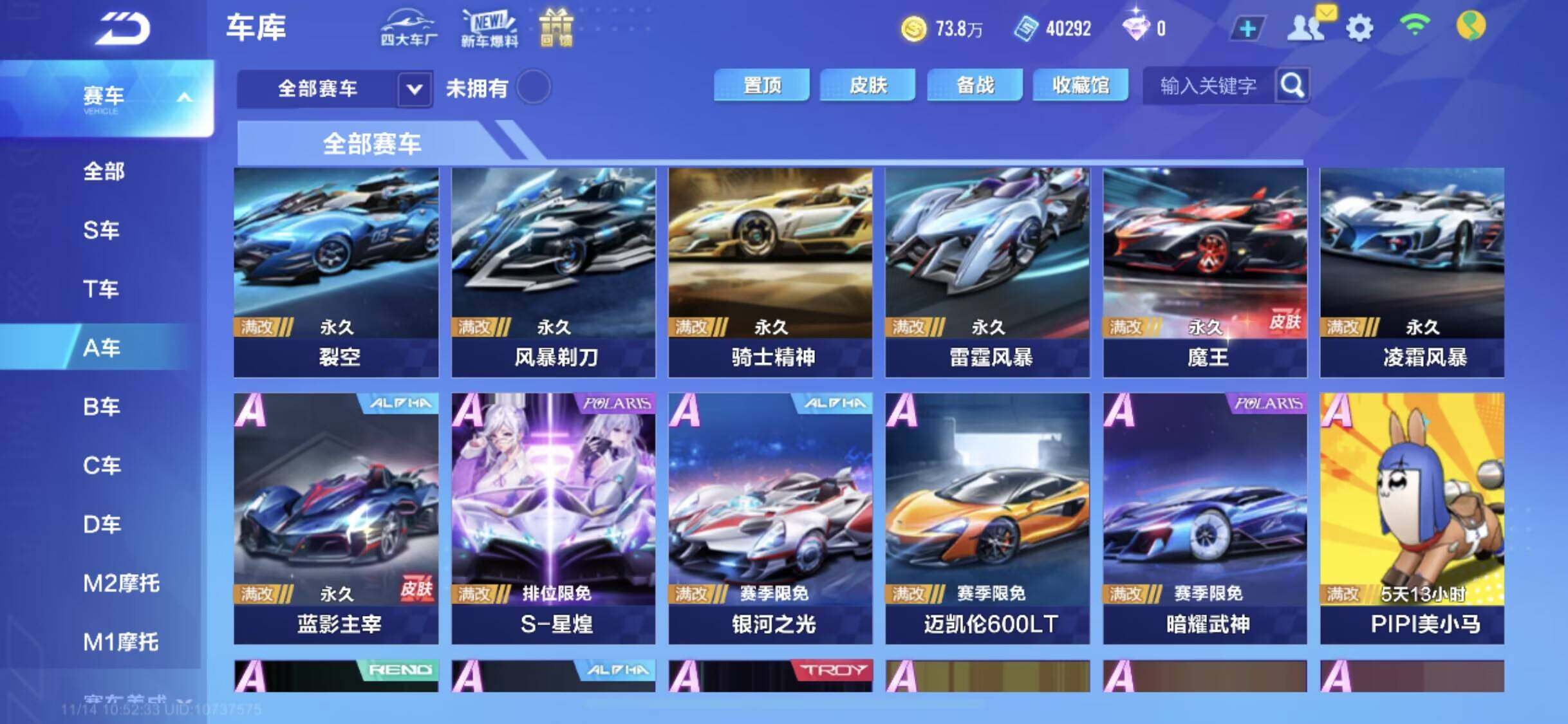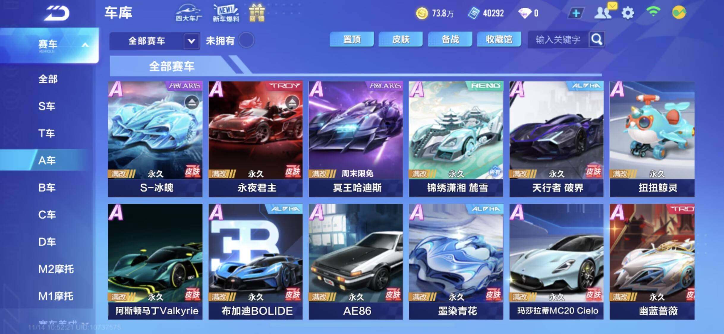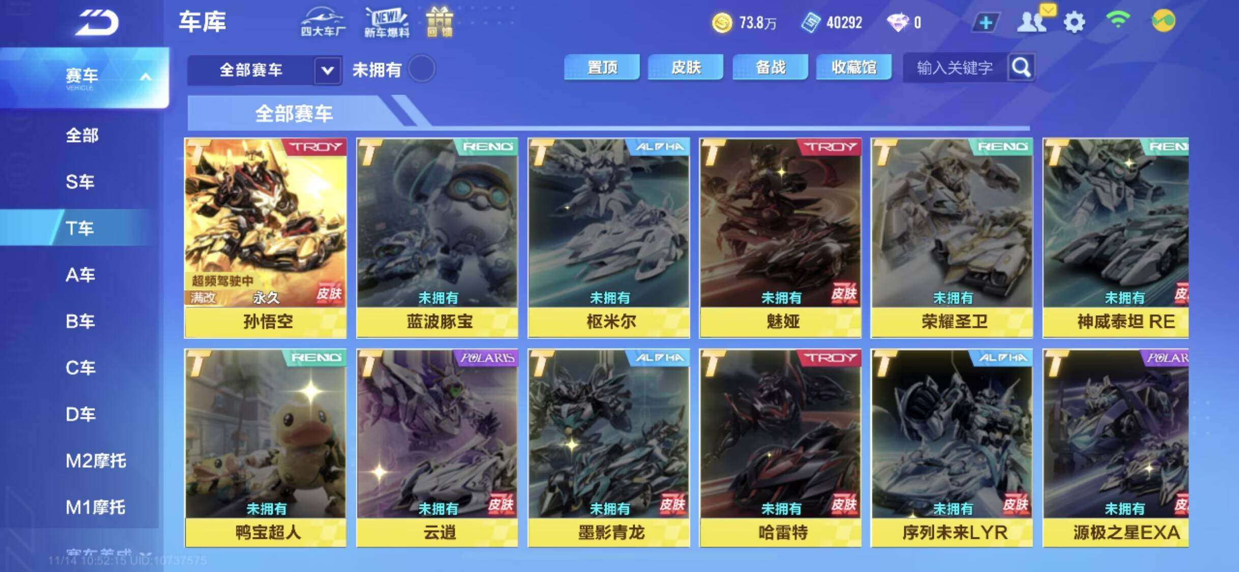 [14043231]【永久T车】:源极之星EXA,序列未来LYR,孙悟空,奥莉娜,哈雷特【联赛A车】:S-裁决者,S-冰魄,S-流火,S-时序使者,S-天行者,S-逐星者【时装】:创世之神套装,死神套装,幻蝶套装,倾世之礼套装,明日之诗套装,鲸徊夜梦套装,水龙吟套装,沧海梦境套装【宠物】:帝皇魂狮,火狱龙息,瑞泽祥麟