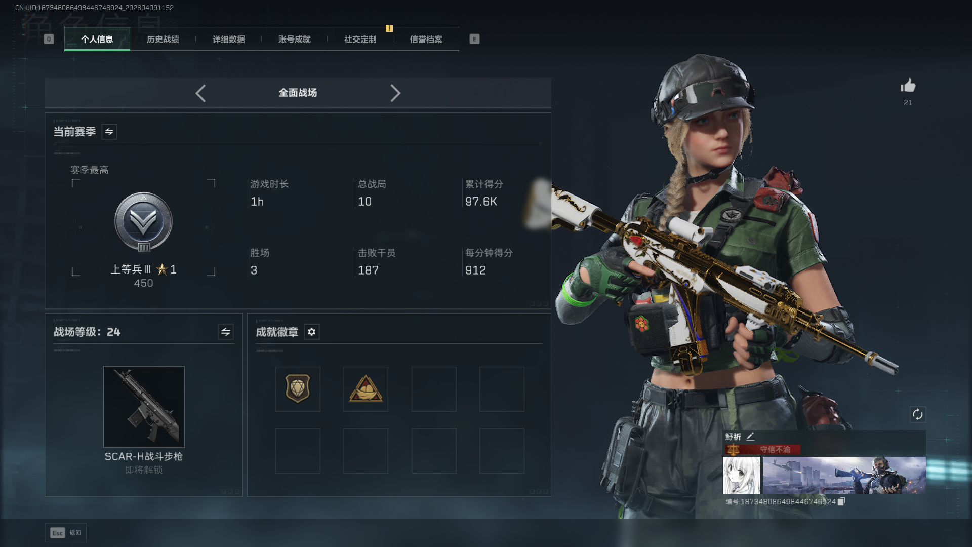 44m总资产-40490k哈伏币-36烽火等级-青铜-1战场等级-无军衔