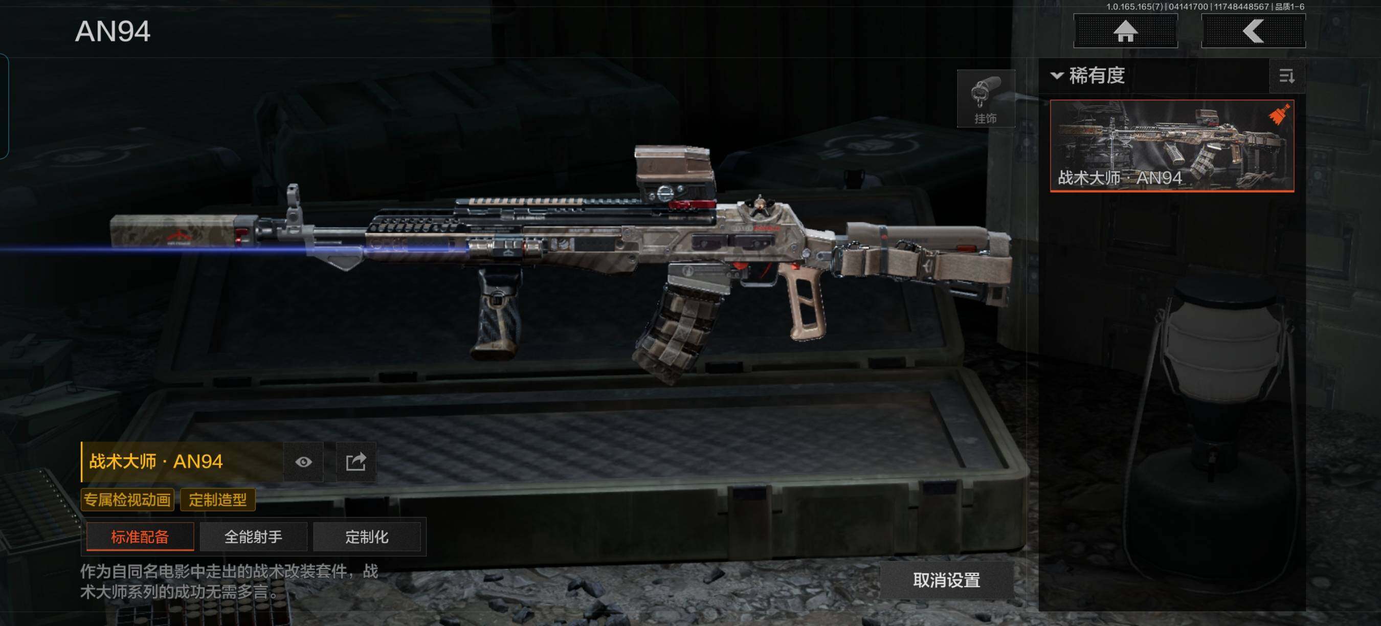 商品描述:【AQD360】段位:专家/仓库价值(百万):25/战术大师AN94