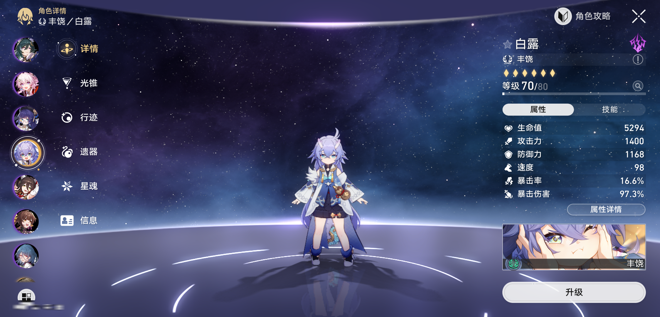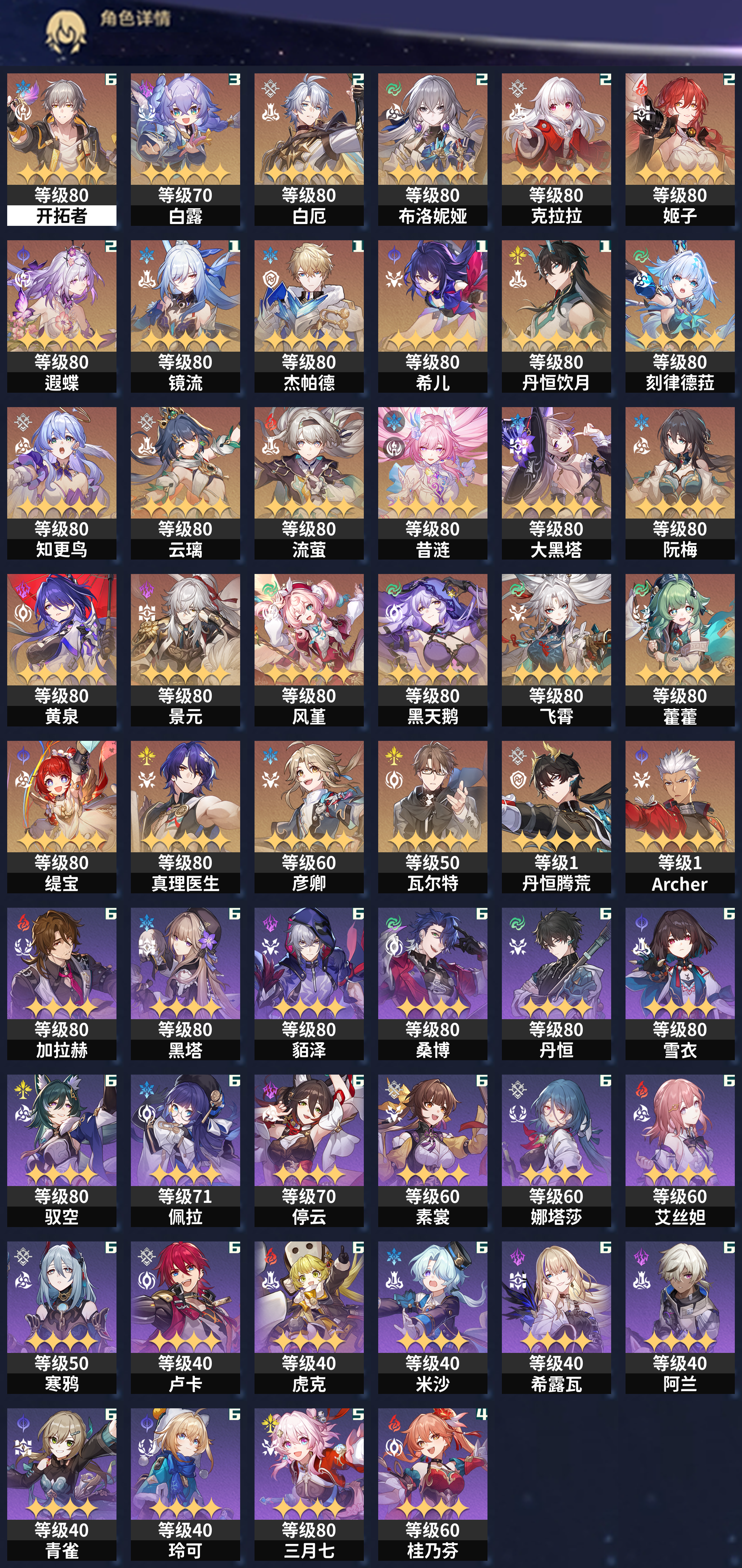 【崩坏·星穹铁道】【LYXQ6871】冒险等级:70,女主,五星数量:36,绑定情况:邮箱__五星角色:杰帕德 * 2命|白露 * 2命|姬子 * 2命|遐蝶 * 1命|布洛妮娅 * 1命|风堇|缇宝|长夜月|丹恒·腾荒|白厄|波提欧|银枝|忘归人|阮·梅|阿格莱雅|乱破|丹恒·饮月|罗刹|云璃|刻律德菈|Archer|瓦尔特|彦卿|希儿|真理医生__五星光锥:记一位星神的陨落 * 5精|比阳光更明亮的|驶向第二次生命|忍法帖·缭乱破魔|金血铭刻的时代|制胜的瞬间|让告别,更美一些|但战斗还未结束|星海巡航|以世界之名|银河铁道之夜,【邮箱未实名】