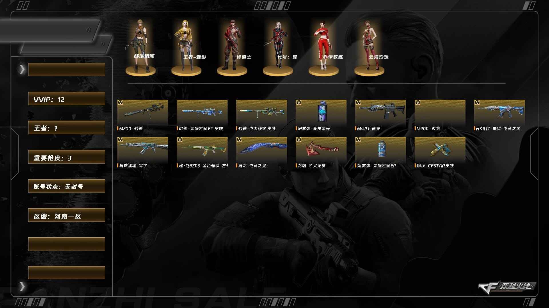 FWX5424/西部/陕西一区/可排位/102V/幻神/王者幻神/6修罗/COP堕天神/破空枪刃夜魔/4烈龙/2盘龙/朱雀/QBZ金色蔷薇/裁决/雷神/火麒麟/毁灭/黑骑士/黑龙/黑武士/火麒麟绝迹/火麒麟灵狐/王者春/【四防】/王者葵貂蝉/【四防】/凌霄/零/审判者/炫/王者救世主/新海豹突击队/修道士/职业选手/绝迹语音包/黑骑士音/火麒麟音效卡/毁灭音效卡/极光音效卡/黑龙音效卡/毁灭AG/火麒麟CFS2018/雷神宠儿/黑龙361/荣耀之锋/雷神荣耀之魄/火麒麟冠军之心/火麒麟AG无影霓裳/详情看下图