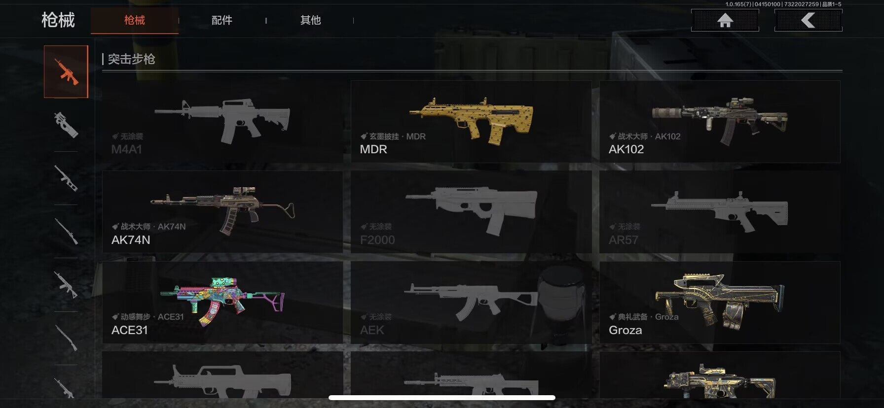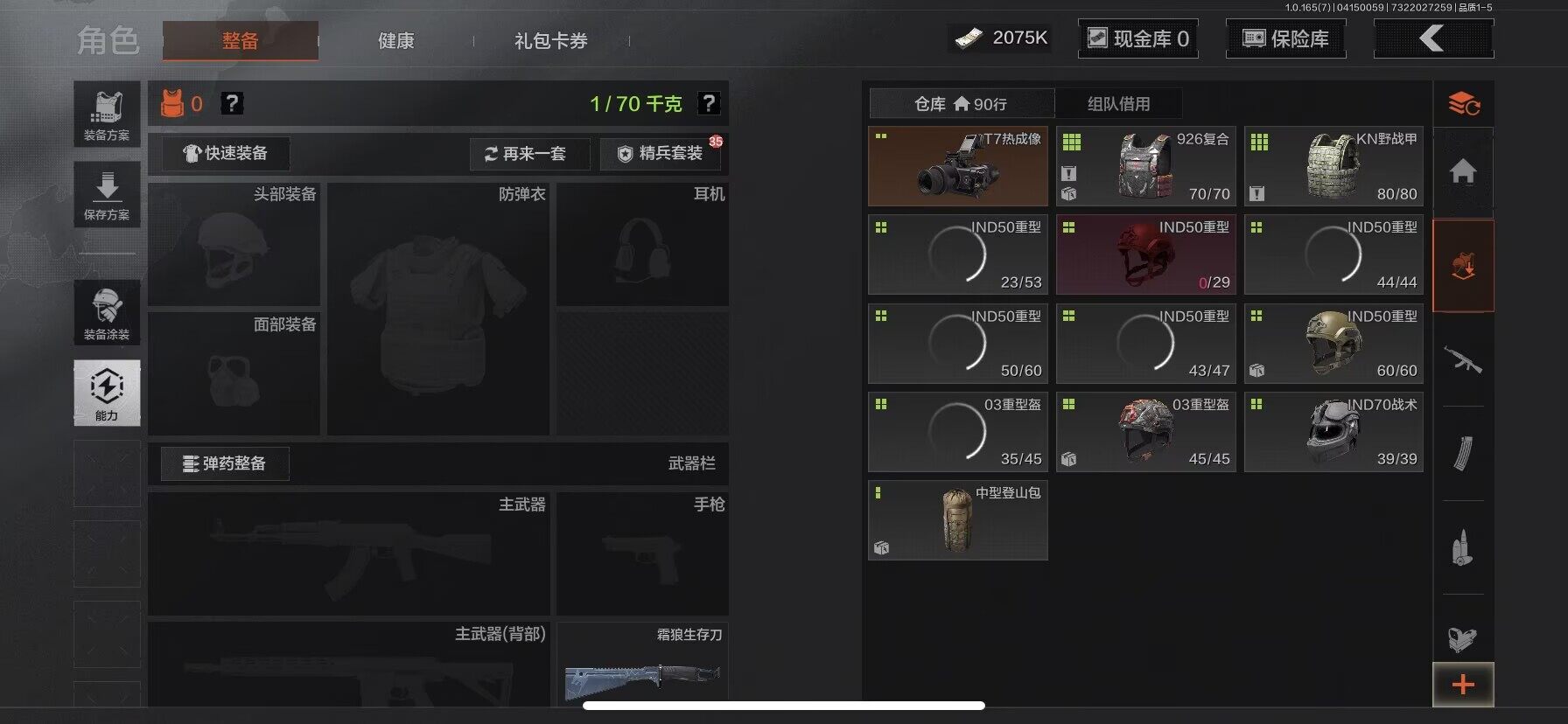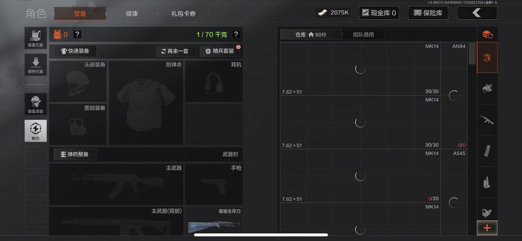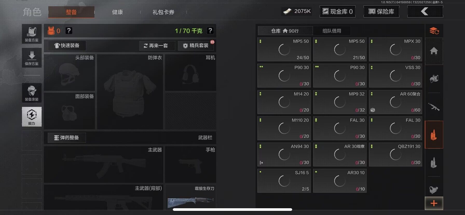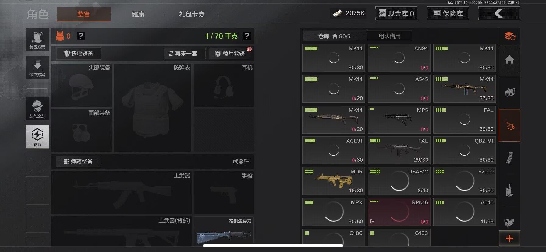 【AQD346】段位:新锐/仓库价值(百万):12/下弦月/收割者/地脉深处FAL/镀火熔金H416/告丧夜曲AR57/旧王圣谕QBZ191/利齿风暴MPX【AQZG2152】等级:30/段位:专家/仓库价值(百万):189.4/柯恩币:100000000/急袭弯刀/下弦月/寒牙手刺/裁决手杖剑/幽燕钛玄/苍穹利爪/盘牙彻甲短刃/深潜行者II/黑卡蒂/冥河/蝮蛇/白蔷薇斯黛拉/危崖魅影作战服/苍白隐者伪装服/长缨风擎AX50/棱光裂变QBU191/冰河碎影MK14/千炼铁阵MK14/黑金弹头P90/利齿风暴MPX/浮鳞影青QBZ192/旧王圣谕QBZ191/玉擎天工AN94/林中人FAL/竞技FAL/天工炉火A545/冲刺极限QBZ192