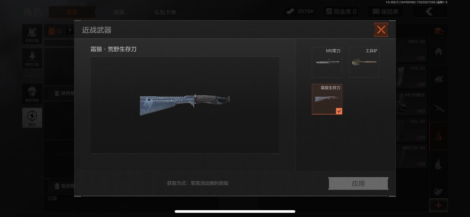 【AQQH1183】段位:新锐/仓库价值(百万):69/掠影马来剑/赤火炉心/工兵铲/秘密任务艾薇塔/镀火熔金H416/竞技风潮M4A1/百锻铁骑AEK/旗帜AEK/赤帽要塞AR57/千炼铁阵MK14/利齿风暴MPX/近卫荣誉RPK16/长夜千军武将/冲刺极限QBZ192