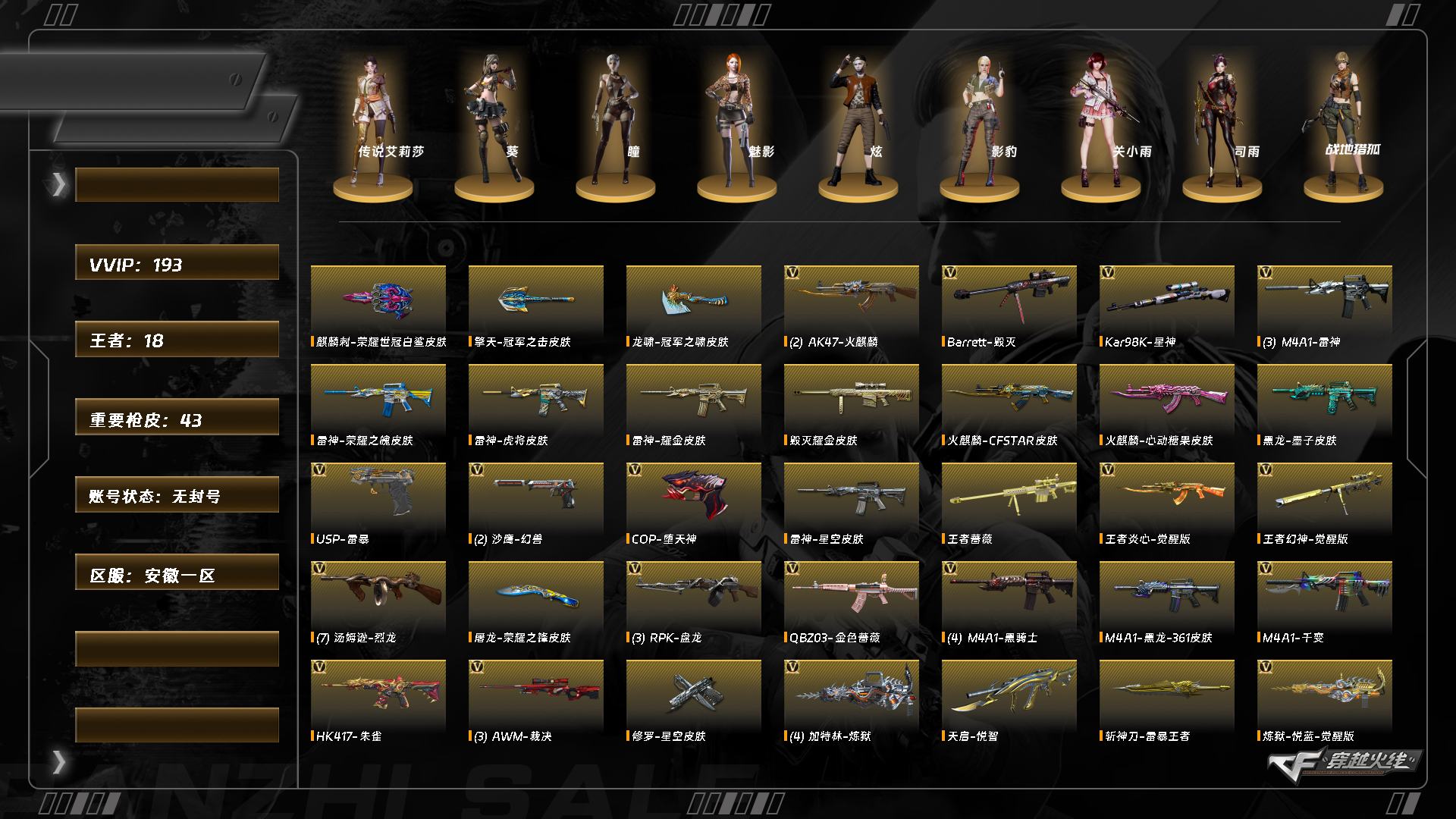 FWX5424/西部/陕西一区/可排位/102V/幻神/王者幻神/6修罗/COP堕天神/破空枪刃夜魔/4烈龙/2盘龙/朱雀/QBZ金色蔷薇/裁决/雷神/火麒麟/毁灭/黑骑士/黑龙/黑武士/火麒麟绝迹/火麒麟灵狐/王者春/【四防】/王者葵貂蝉/【四防】/凌霄/零/审判者/炫/王者救世主/新海豹突击队/修道士/职业选手/绝迹语音包/黑骑士音/火麒麟音效卡/毁灭音效卡/极光音效卡/黑龙音效卡/毁灭AG/火麒麟CFS2018/雷神宠儿/黑龙361/荣耀之锋/雷神荣耀之魄/火麒麟冠军之心/火麒麟AG无影霓裳/详情看下图