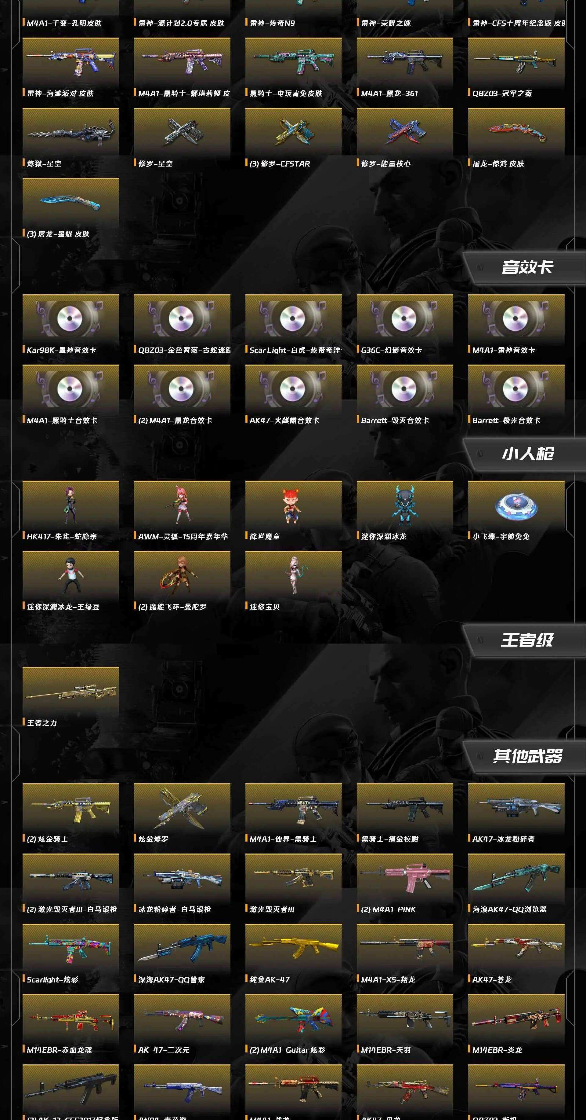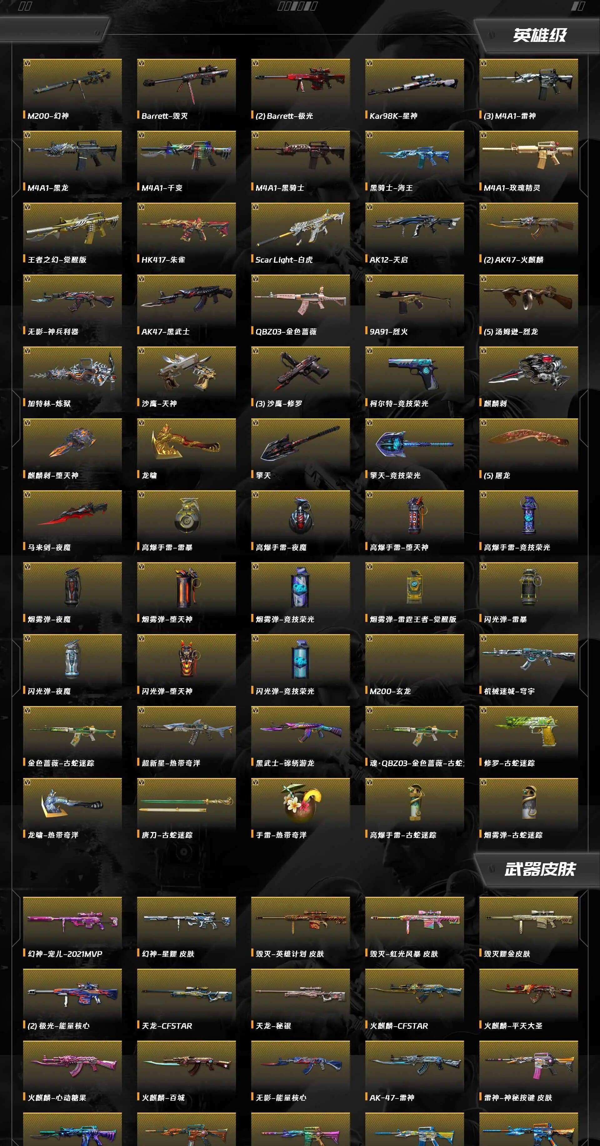 商品描述:[17756221]实名: 不可修改 V武器: AK47-火麒麟,AK47-黑武士,M4A1-雷神,M4A1-黑骑士,M4A1-黑龙,M4A1-千变,M4A1-玫瑰精灵,Barrett-毁灭,Barrett-极光,M200-幻神,Kar98k-星神,AK12-天启,HK417-朱雀,QBZ03-金色蔷薇,Scar Light-白虎,9A91-烈火,汤姆逊-烈龙,加特林-炼狱,沙鹰-修罗,沙鹰-天神,屠龙,龙啸,麒麟刺,擎天,黑骑士-海王,柯尔特-竞技荣光,擎天-竞技荣光,AK47-黑武士-锦绣游龙,麒麟刺-堕天神,龙啸-热带奇洋,超新星-热带奇洋,马来剑-夜魔,无影-神兵利器,金色蔷薇-古蛇迷踪,修罗-古蛇迷踪,M4A1-赤狱骑士,机械迷城-穹宇,金色蔷薇-狼王,魂·裁决-胜者为王,Colt1911-胜者为王,M4A1-水晶,EVOⅢ-序章,M200-玄龙,G36C-序章,回声刃-荣耀之巅,Colt1911-量子风暴,魂・雷神-蓝风铃 王者武器: 王者之力,王者之幻-觉醒版 炫金武器: 炫金修罗 热门武器: 猫猫手套,降世魔童 狙击枪稀有皮肤: 毁灭耀金皮肤,幻神-星耀 皮肤,毁灭-虹光风暴 英雄角色: 王者樱-热浪之夏,王者-魅影,王者-瞳-闭月羞花,零,魅影,职业经理,团团 音效道具: AK47-火麒麟音效卡,M4A1-雷神音效卡,Barrett-毁灭音效卡,Barrett-极光音效卡,M4A1-黑骑士音效卡,QBZ03-金色蔷薇-古蛇迷踪音效卡,G36C-幻影音效卡