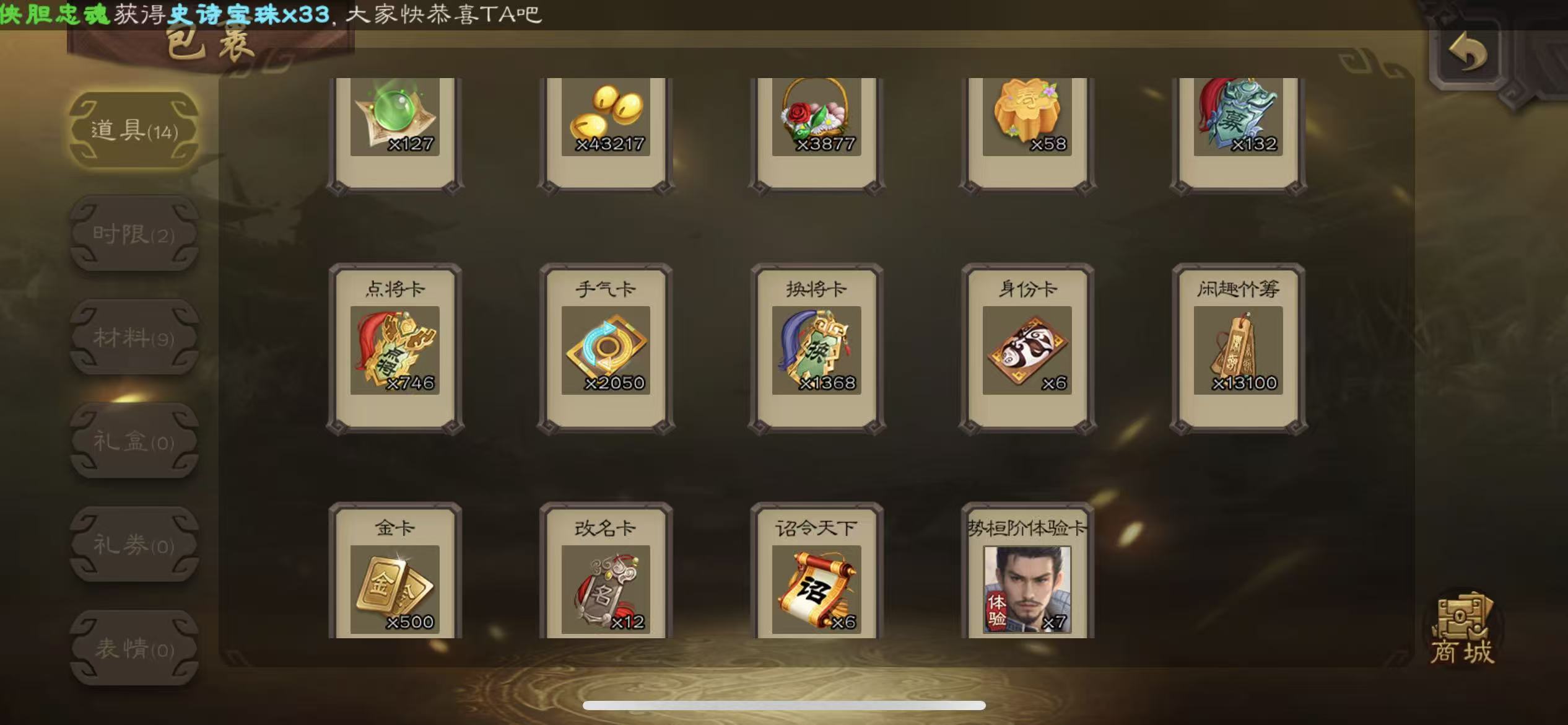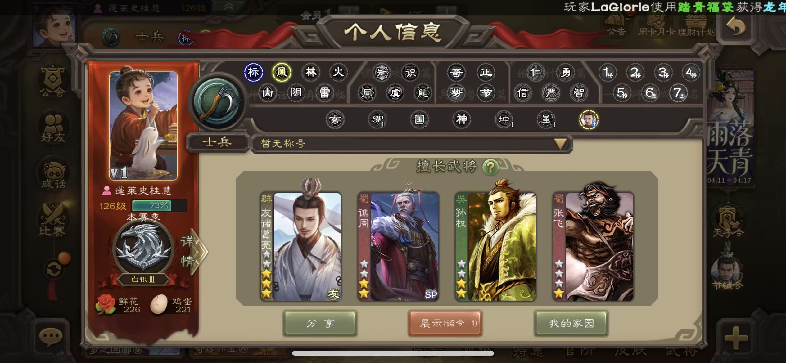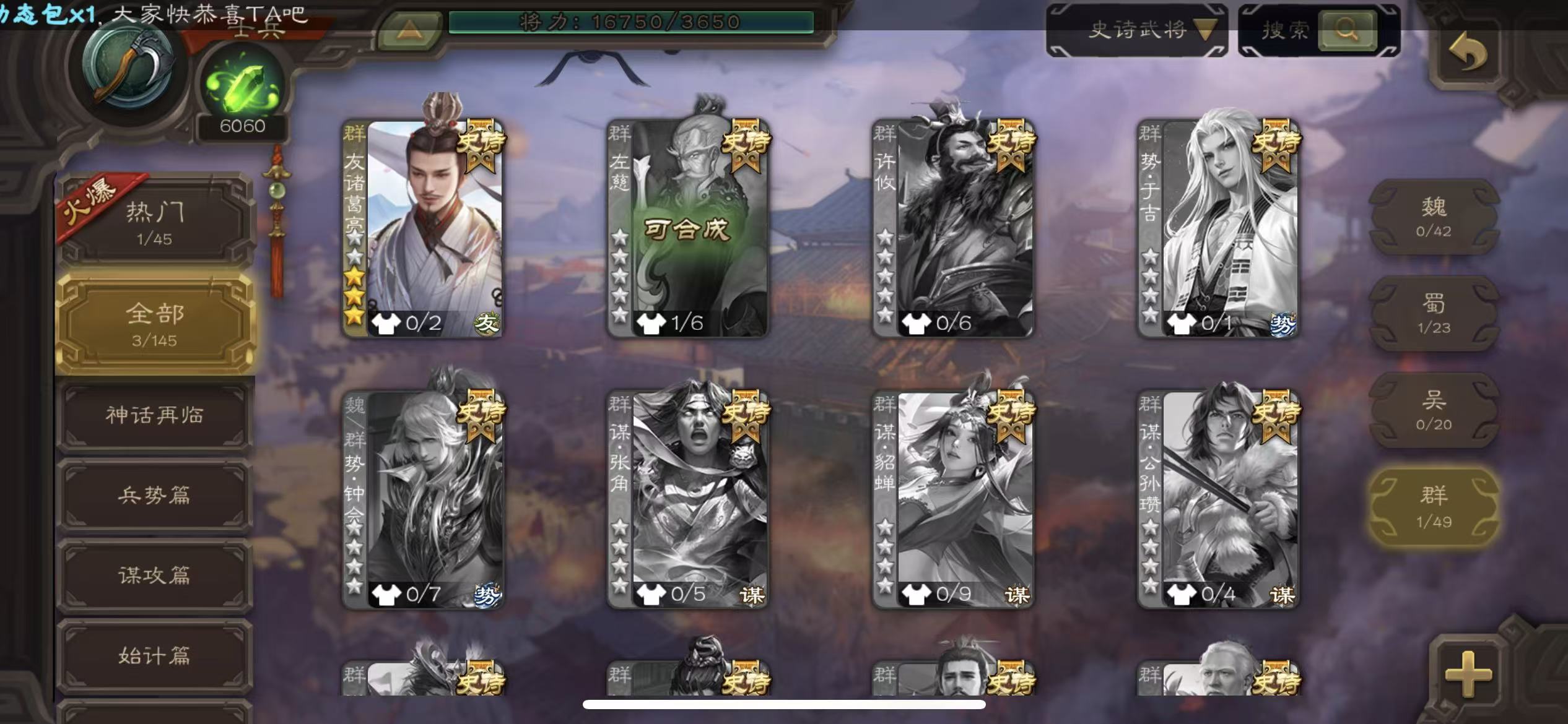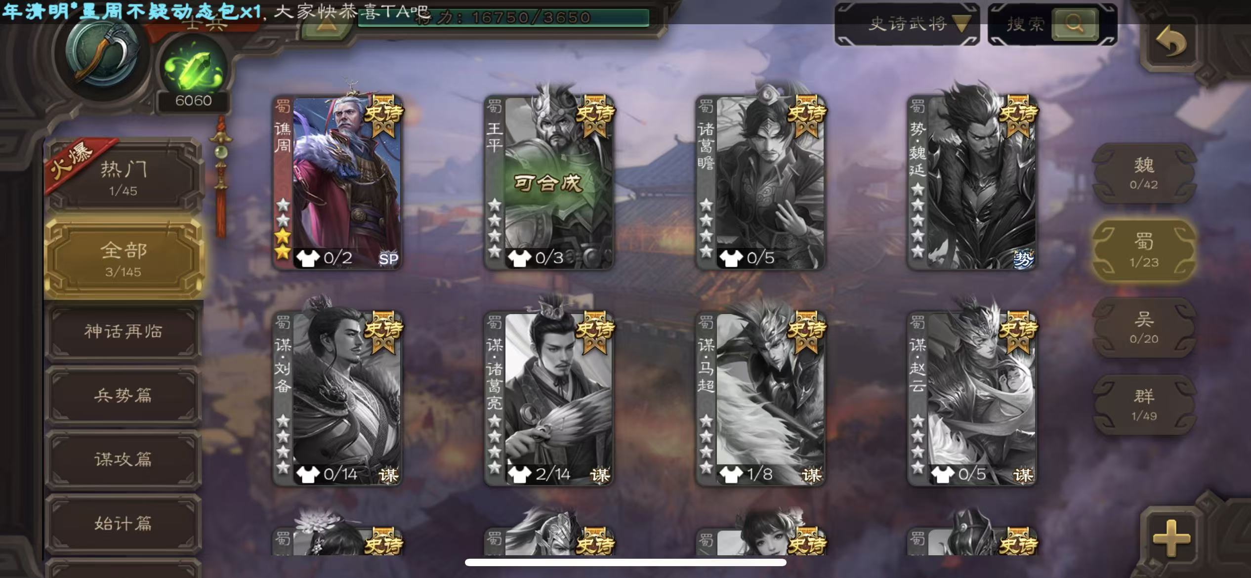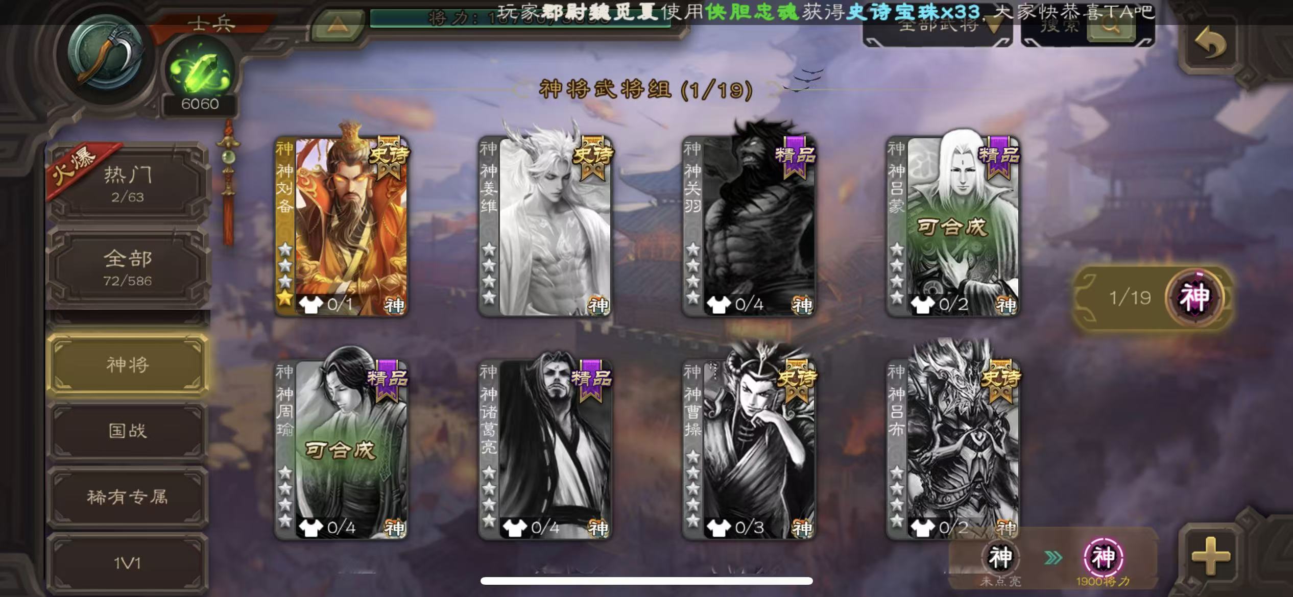 商品描述: 士兵友诸葛亮神刘备谯周6000将魂7万羽毛10宝珠132招募令三卡