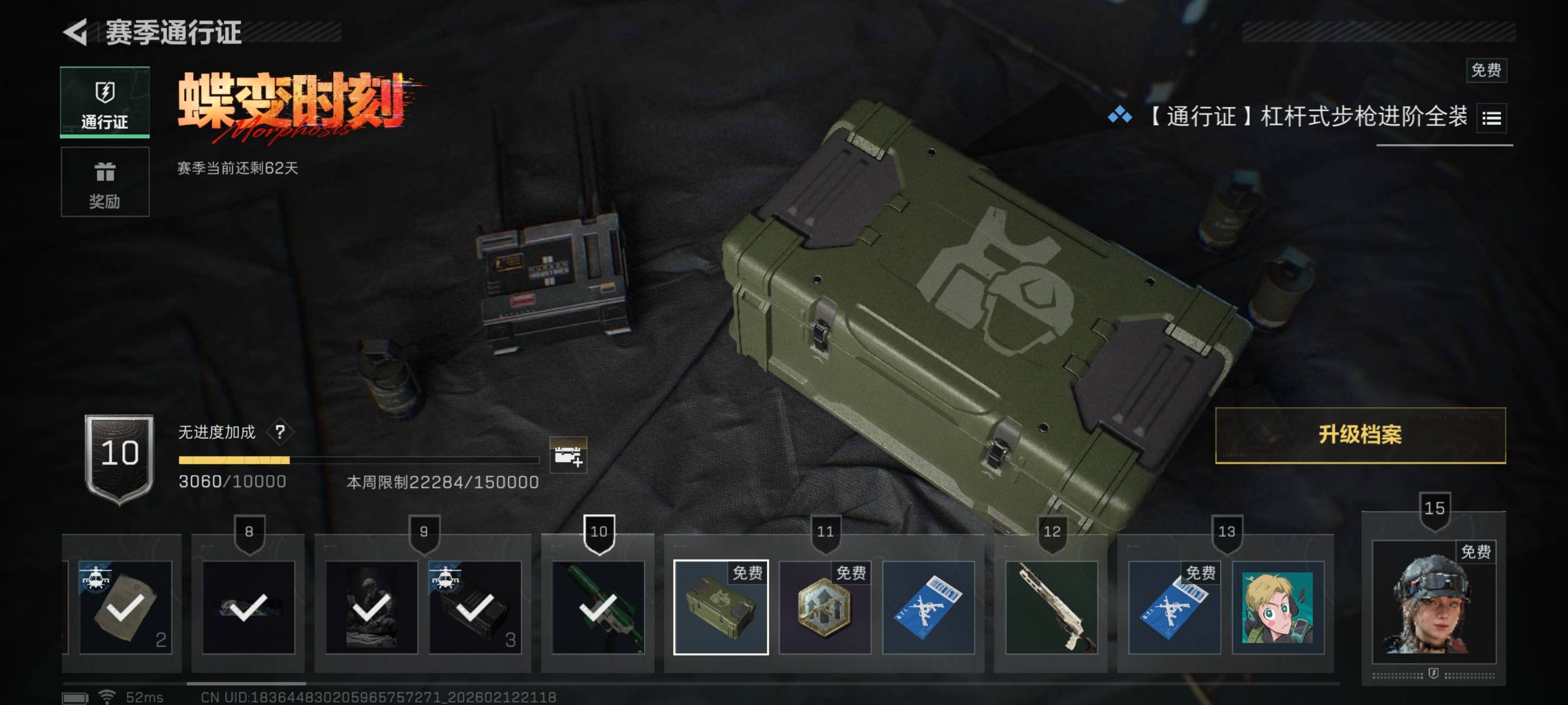 个人信息:战场等级:35 军衔:上等兵2 行动等级:46 烽火段位:白银1哈夫币:11269k总资产:14.9M货币:0三角币 0曼德尔币 382三角券安全箱:基础安全箱通行证:10特勤处:技术中心Lv.2 工作台Lv.2 制药台Lv.2 防具台Lv.2 仓库Lv.4 指挥中心Lv.4 训练中心Lv.4 靶场Lv.3 潜水中心Lv.0 收藏室Lv.0角色皮肤:蛊-午夜邮差 露娜-金牌射手 近战皮肤:黑鹰 典藏外观:k416命运