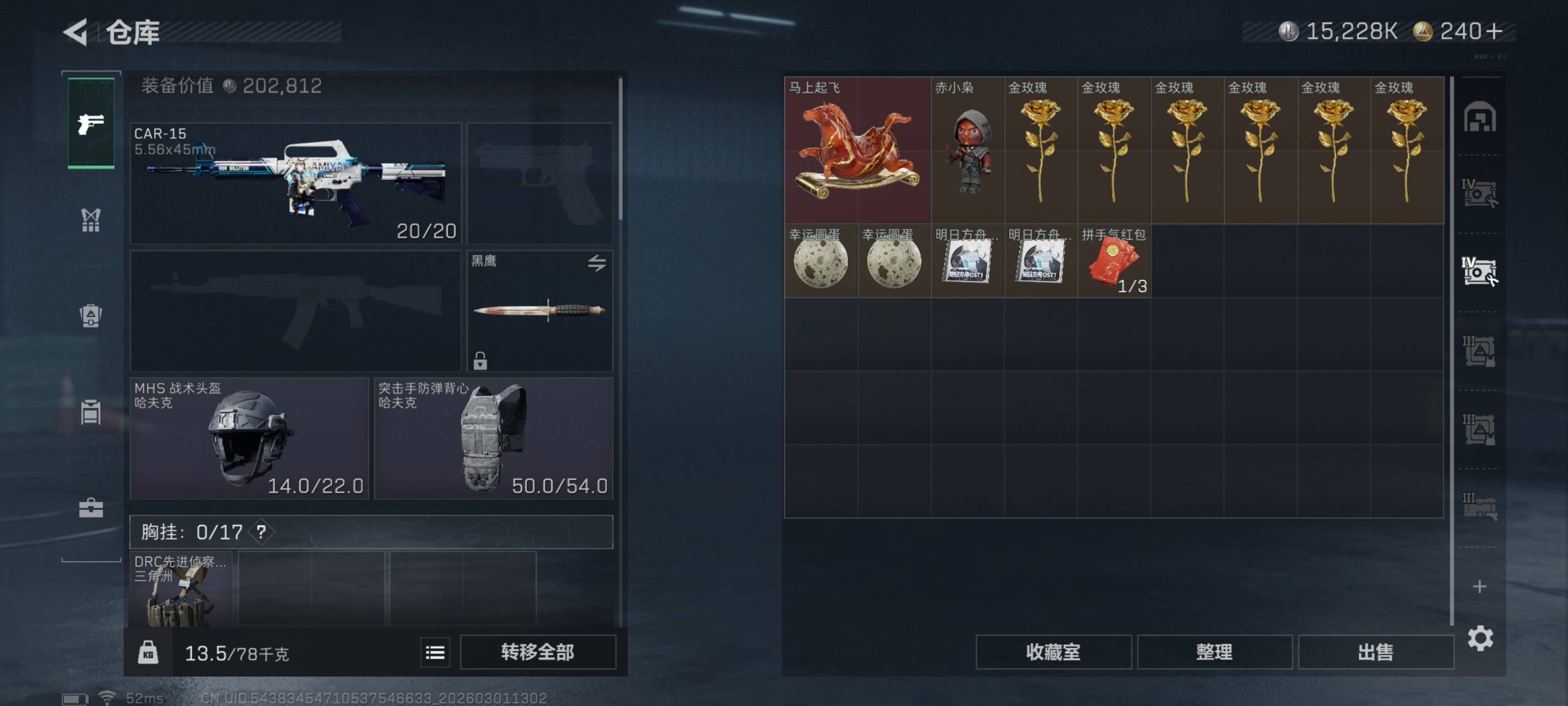 个人信息:战场等级:1 军衔:无军衔 行动等级:54 烽火段位:白银3哈夫币:15228k-1522w总资产:117m货币:0三角币 0曼德尔币 240三角券安全箱:基础安全箱通行证:1特勤处:技术中心Lv.3 工作台Lv.3 制药台Lv.3 防具台Lv.3 仓库Lv.7 指挥中心Lv.5 训练中心Lv.6 靶场Lv.4 潜水中心Lv.2 收藏室Lv.1 角色皮肤:蛊-午夜邮差 近战皮肤:黑鹰
