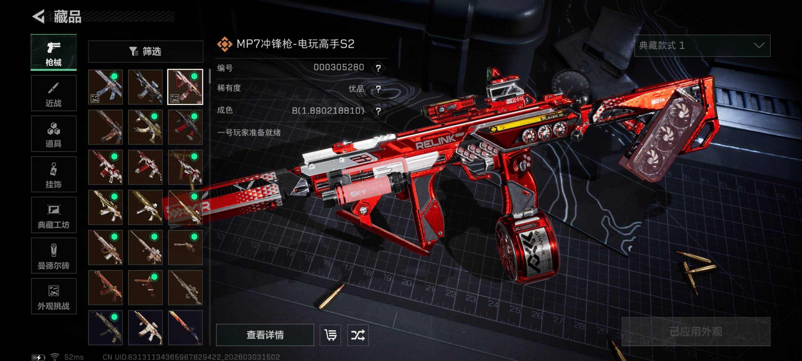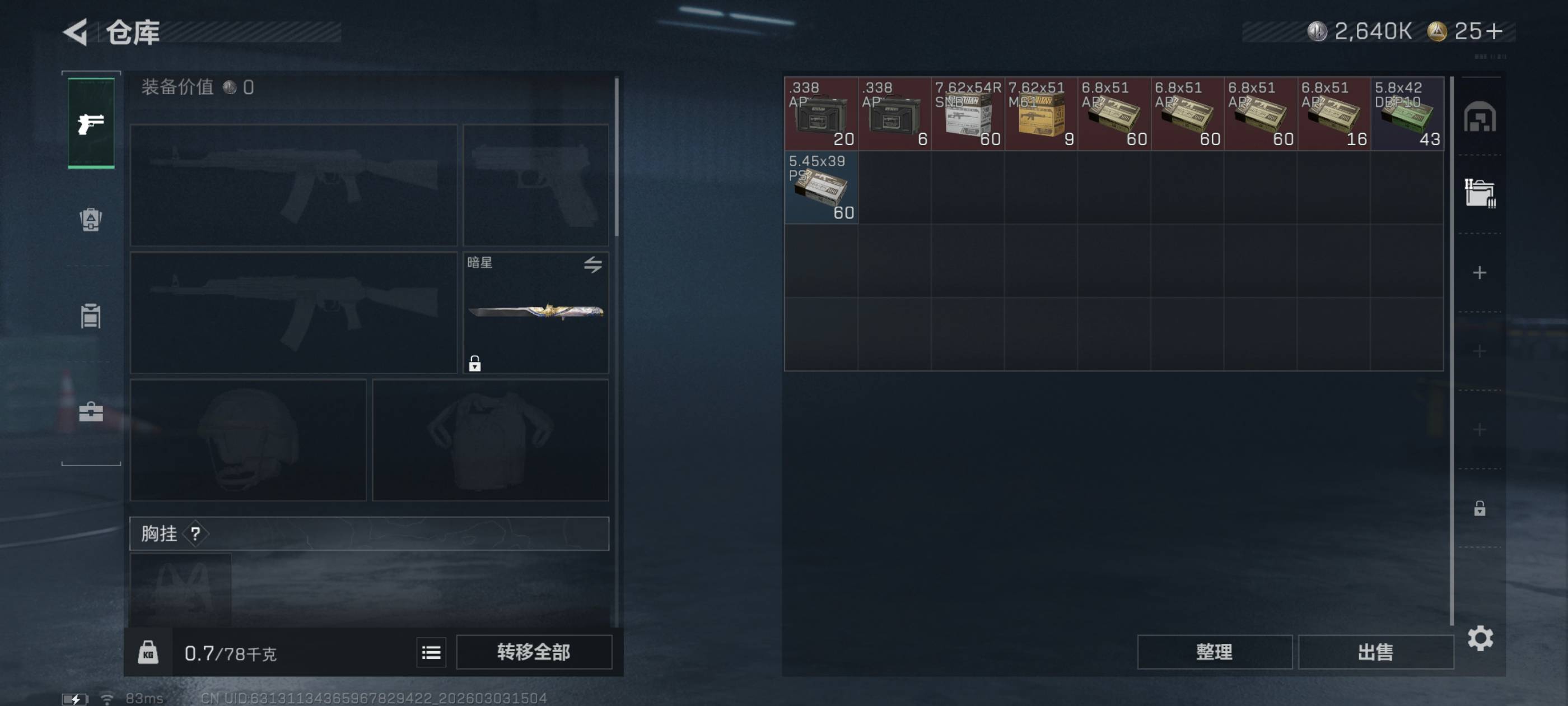 个人信息:战场等级:41 军衔:校官3 行动等级:56 烽火段位:三角洲巅峰哈夫币:2640k总资产:38m货币:0三角币 0曼德尔币 25三角券安全箱:基础安全箱通行证:1特勤处:技术中心Lv.3 工作台Lv.3 制药台Lv.1 防具台Lv.3 仓库Lv.5 指挥中心Lv.2 训练中心Lv.4 靶场Lv.4 潜水中心Lv.1 收藏室Lv.0 角色皮肤:骇爪-水墨云图 近战皮肤:暗星 处刑者 黑鹰 典藏外观:K416突击步枪命运-优品C MP7冲锋枪电玩高手S2-优品B