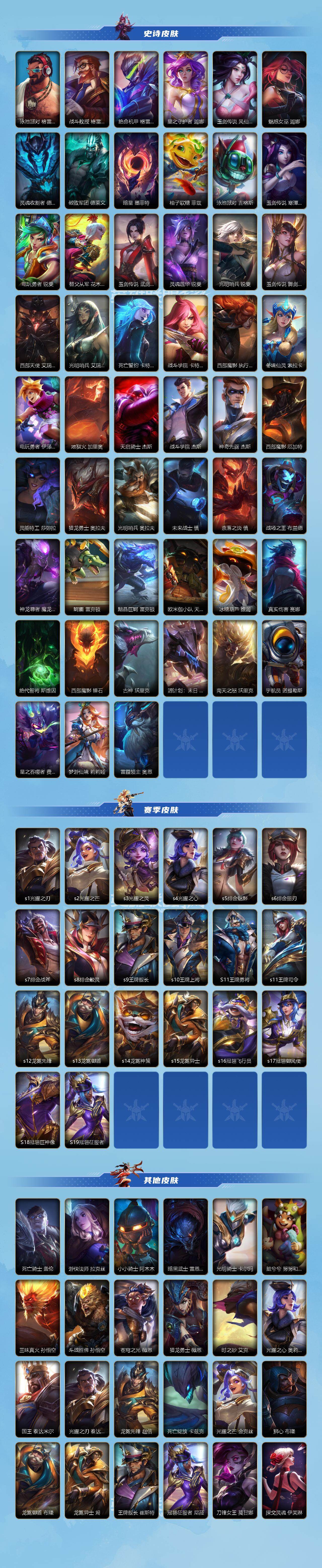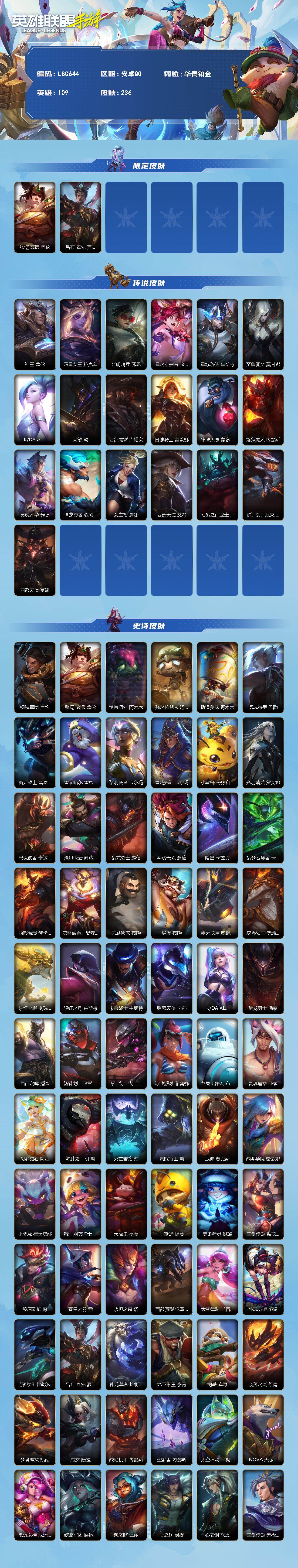商品描述:【LSC644】109英雄/236皮肤/华贵铂金/张辽 文远 盖伦/吕布 奉先 嘉文四世/神王 盖伦/暗星女王 拉克丝/光明哨兵 薇恩/星之守护者 金克丝/星域游侠 崔斯特/至尊魔女 莫甘娜/K/DA ALL OUT 萨勒芬妮/天煞 劫/西部魔影 卢锡安/日蚀骑士 蕾欧娜/律政大亨 蒙多医生/炼狱魔犬 内瑟斯/灵魂莲华 瑟提/神龙尊者 驭风啸龙 易/女主播 迦娜/西部天使 艾希/地狱之门卫士 加里奥/源计划:泯灭 雷克顿/西部天使 赛娜/钢铁军团 盖伦/惊悚派对 阿木木/殇之机器人 阿木木/劲道美味 阿木木/摄魂猎手 凯隐/霸天战士 雷恩加尔/雷喵喵尔 雷恩加尔/黎明使者 卡尔玛/星域先知