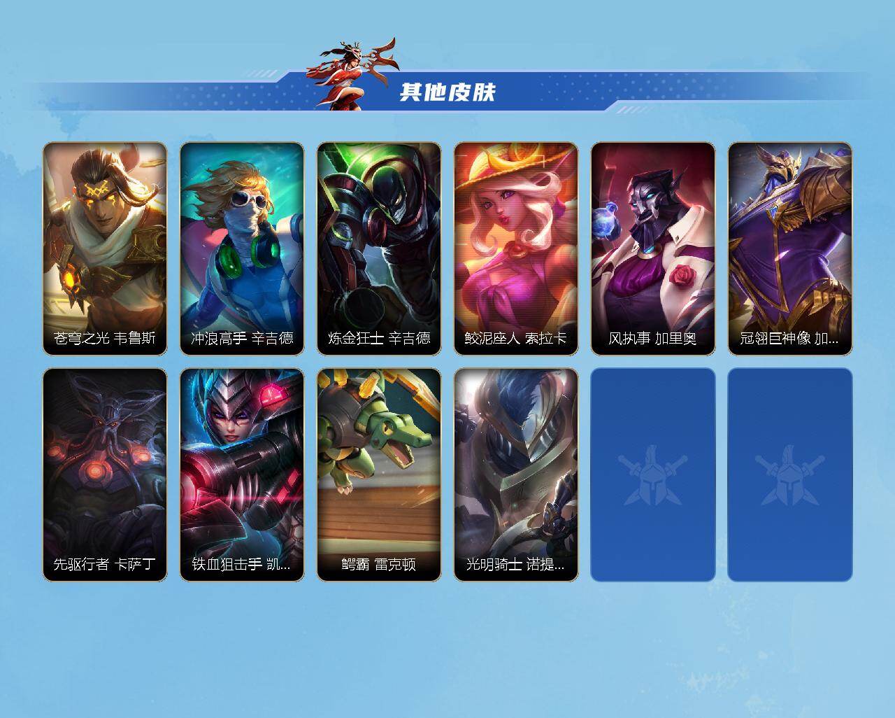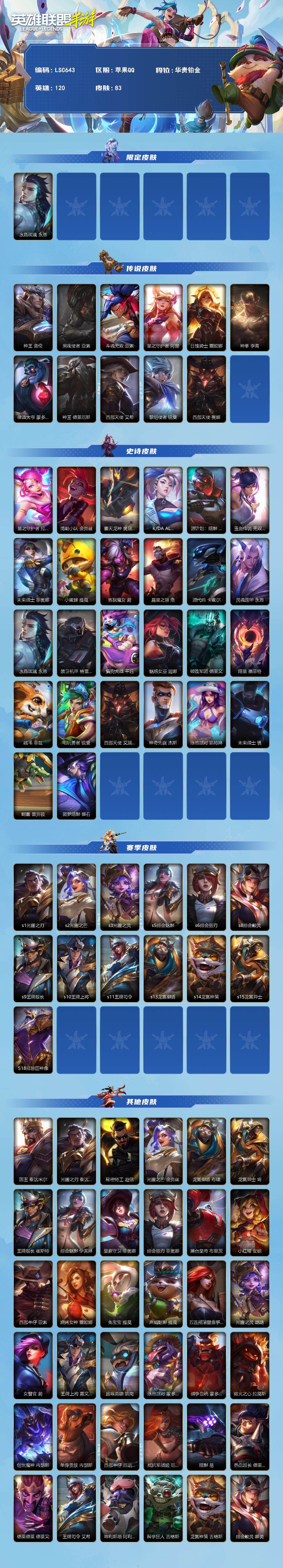 商品描述:【LSC643】120英雄/83皮肤/华贵铂金/水晶玫瑰 永恩/神王 盖伦/黑夜使者 亚索/斗魂无双 亚索/星之守护者 阿狸/日蚀骑士 蕾欧娜/神拳 李青/律政大亨 蒙多医生/神王 德莱厄斯/西部天使 艾希/黎明使者 锐雯/西部天使 赛娜/星之守护者 拉克丝/清剿小队 金克丝/霸天龙神 奥瑞利安·索尔/K/DA ALL OUT 阿卡丽/源计划:暗影 阿卡丽/玉剑传说 无双 菲奥娜/未来战士 菲奥娜/小蜜蜂 提莫/炼狱魔女 蔚/晨星之翎 洛/源代码 卡蜜尔/灵魂莲华 永恩/禁卫机甲 格雷福斯/猫狗大战 千珏/魅惑女巫 迦娜/破败军团 德莱文/暗星 墨菲特/绒毛 菲兹/电玩勇者 锐雯/西部天使