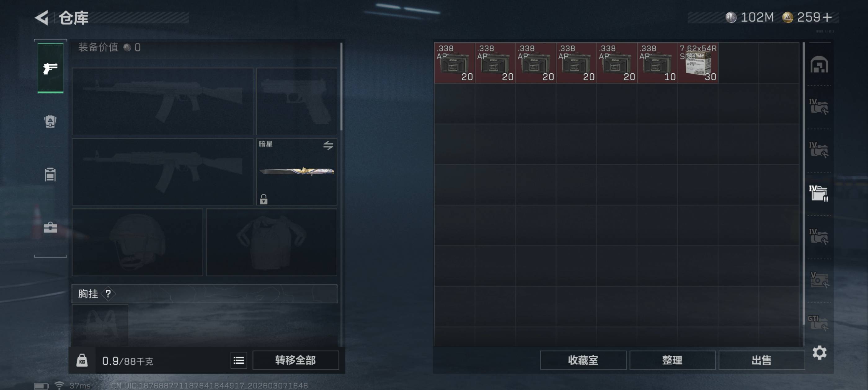 个人信息:战场等级:1 军衔:无军衔 行动等级:60 烽火段位:钻石2哈夫币:102M总资产:304m 货币:0三角币 0曼德尔币 259三角券安全箱:基础安全箱通行证:1特勤处:技术中心Lv.3 工作台Lv.3 制药台Lv.3 防具台Lv.3 仓库Lv.10 指挥中心Lv.6 训练中心Lv.7 靶场Lv.7 潜水中心Lv.3 收藏室Lv.2角色皮肤:露娜-金牌射手 近战皮肤:暗星 处刑者 黑鹰 典藏外观:M4棱镜公式-优品B 腾龙突击步枪气象感应-优品C