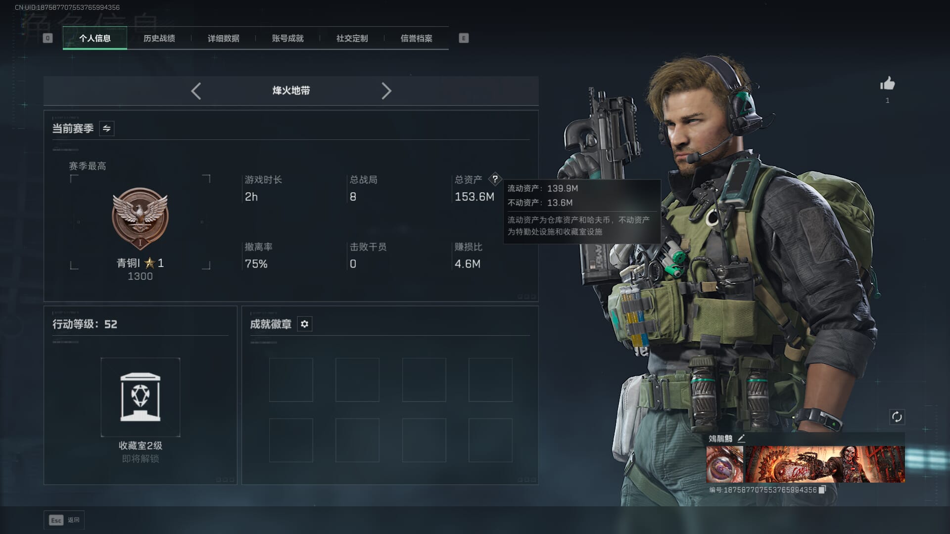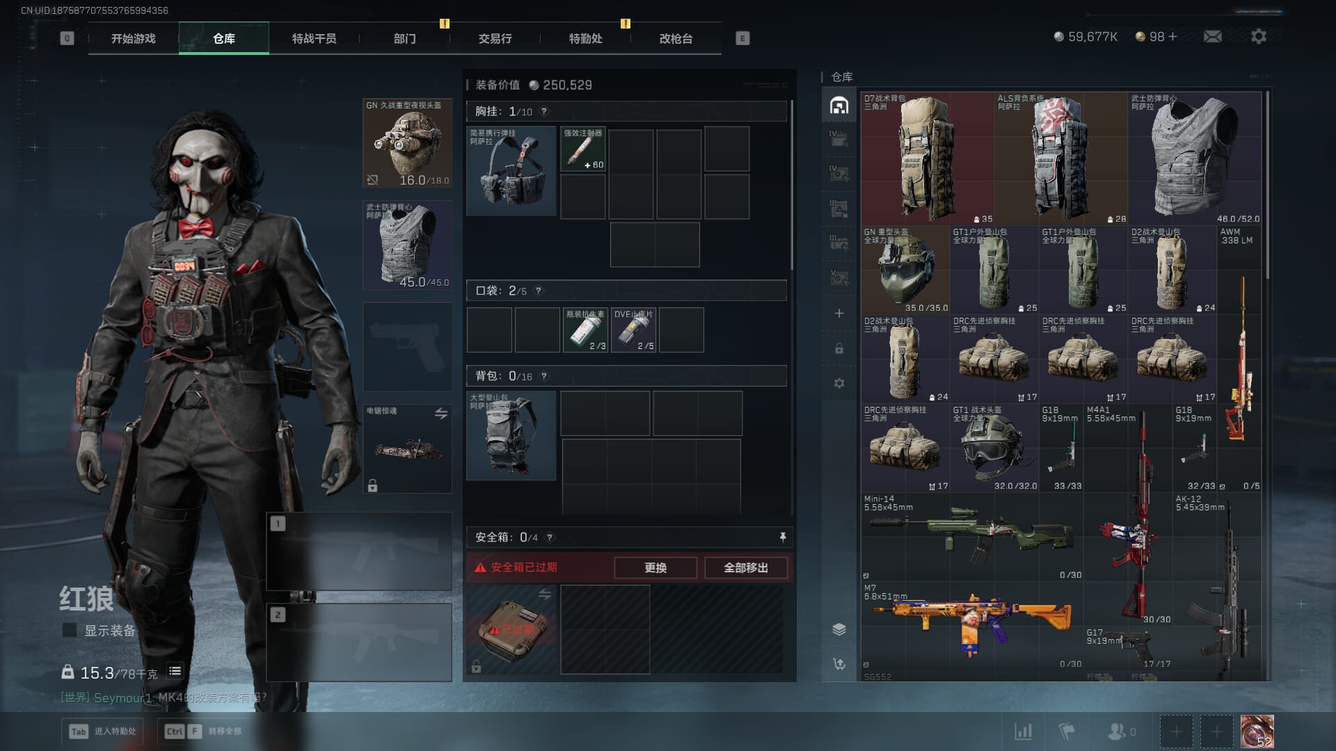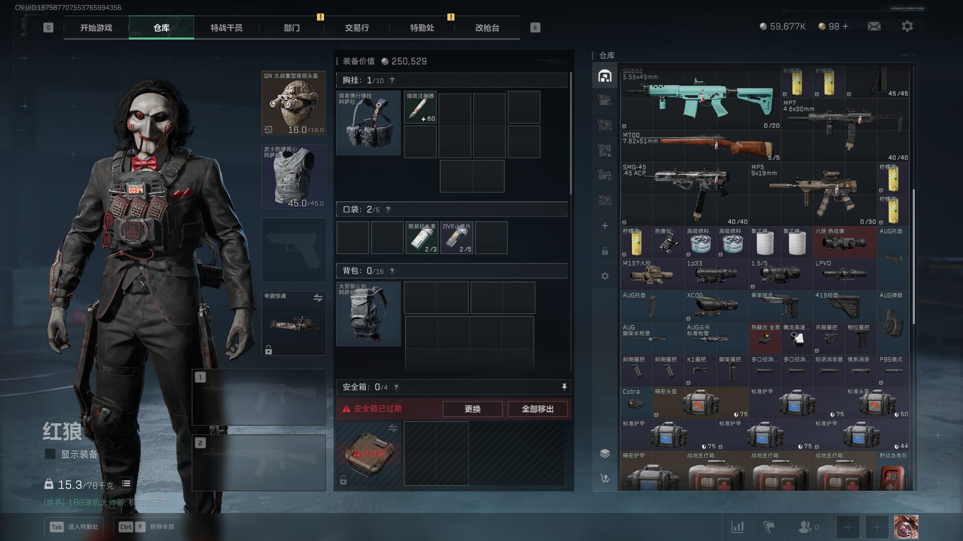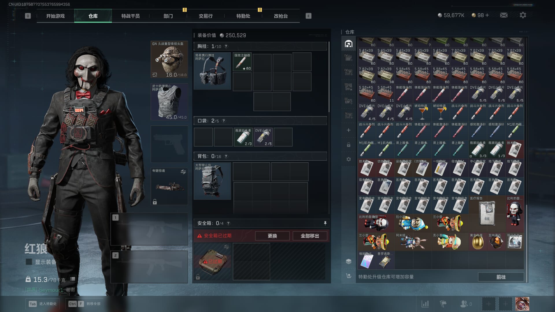 总资产:62.2M,哈夫币:84W,武器皮肤:5,黑鹰_,战场60级:列兵,【安全箱】基础安全箱;【特勤处等级】仓库LV.5,靶场LV.4,训练中心LV.4;【干员皮肤】骇爪维什戴尔,红狼电锯惊魂;【近战武器】近战武器-黑鹰;【步枪皮肤】M4A1突击步枪-阿米娅,SCAR-H战斗步枪-启航,KC17突击步枪-电锯惊魂;【狙击步枪皮肤】R93狙击步枪-维什戴尔;