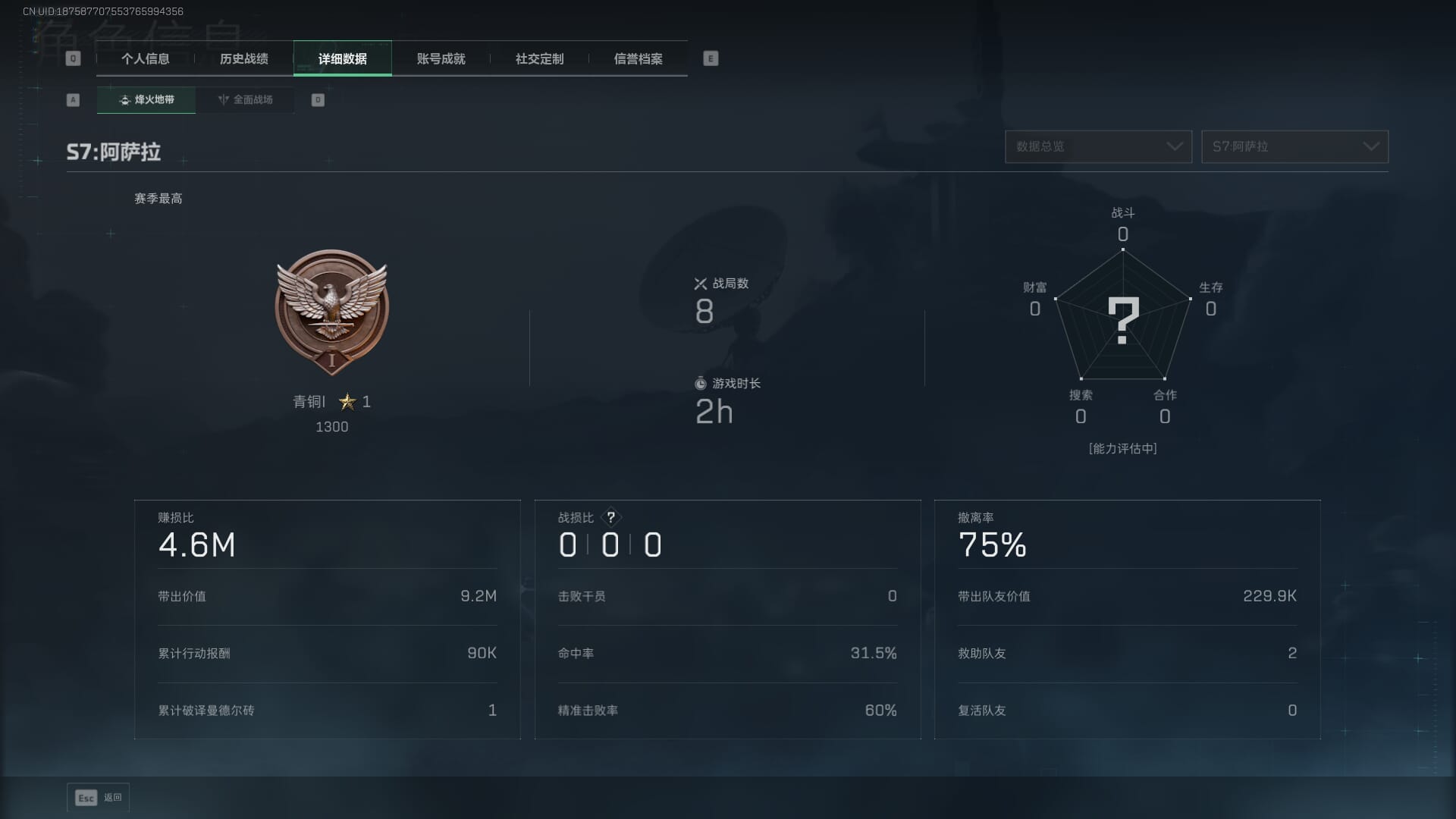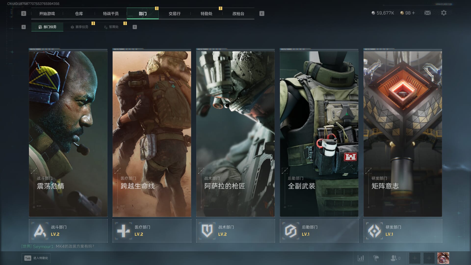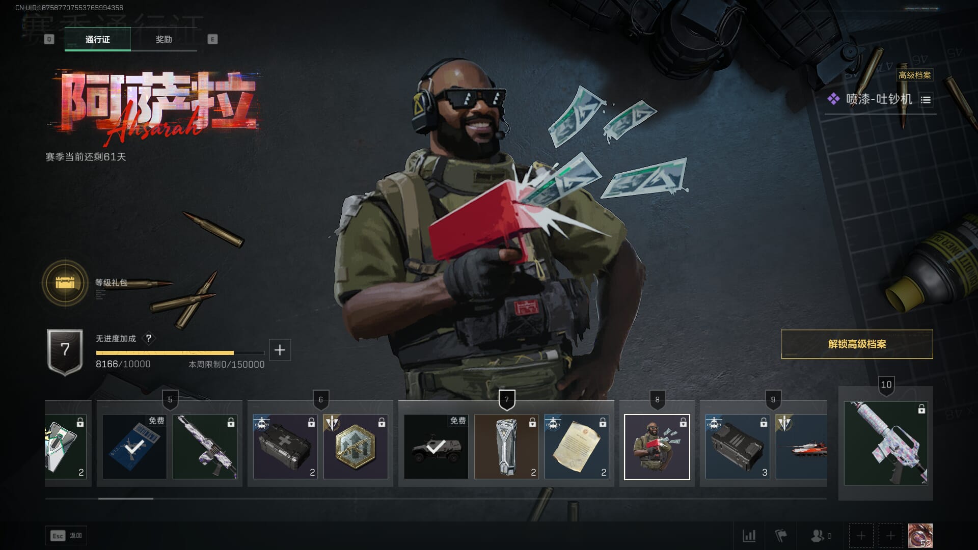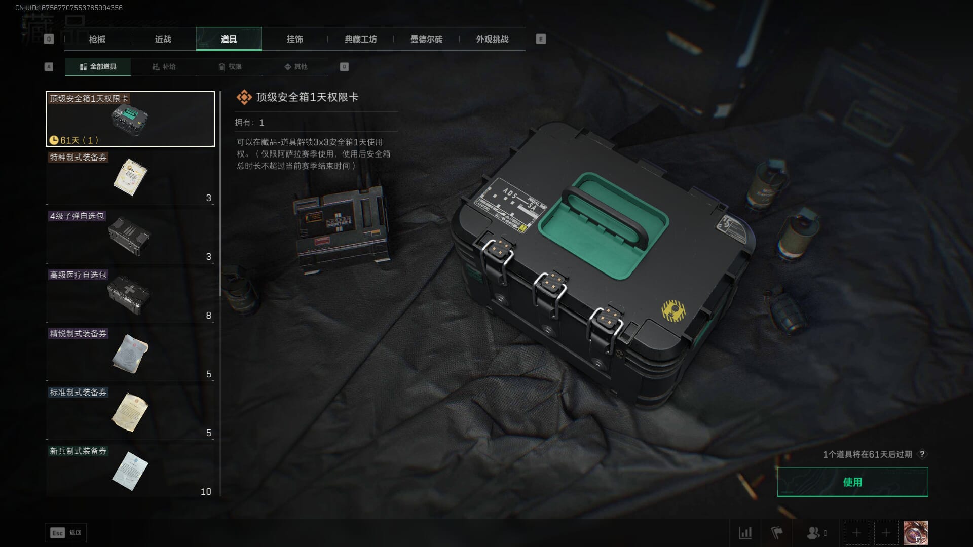 总资产:62.2M,哈夫币:84W,武器皮肤:5,黑鹰_,战场60级:列兵,【安全箱】基础安全箱;【特勤处等级】仓库LV.5,靶场LV.4,训练中心LV.4;【干员皮肤】骇爪维什戴尔,红狼电锯惊魂;【近战武器】近战武器-黑鹰;【步枪皮肤】M4A1突击步枪-阿米娅,SCAR-H战斗步枪-启航,KC17突击步枪-电锯惊魂;【狙击步枪皮肤】R93狙击步枪-维什戴尔;