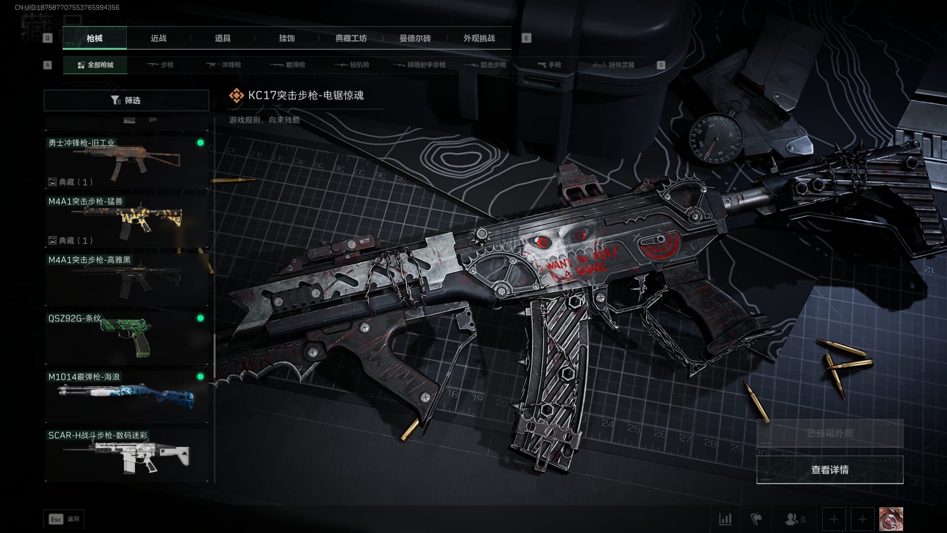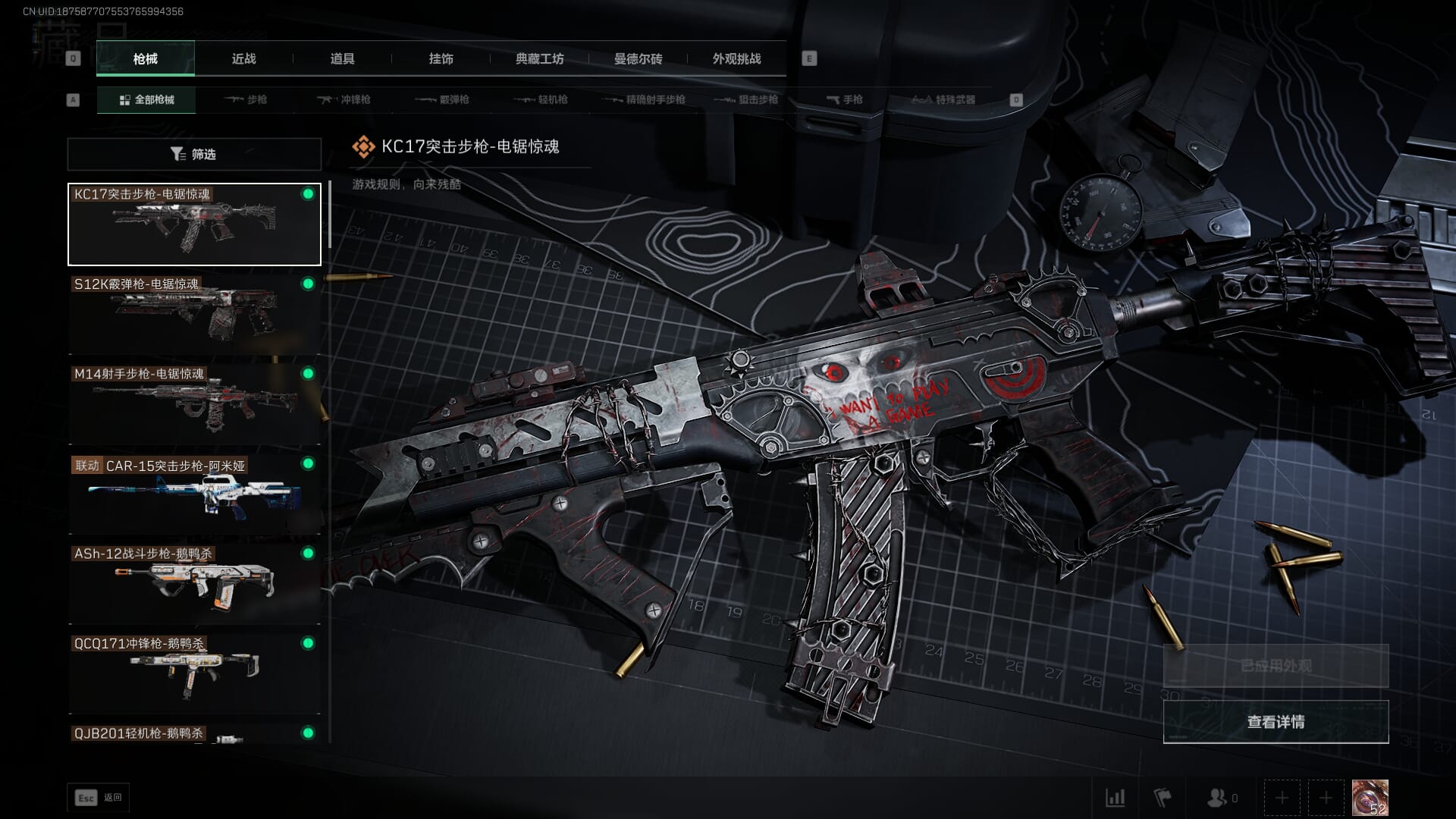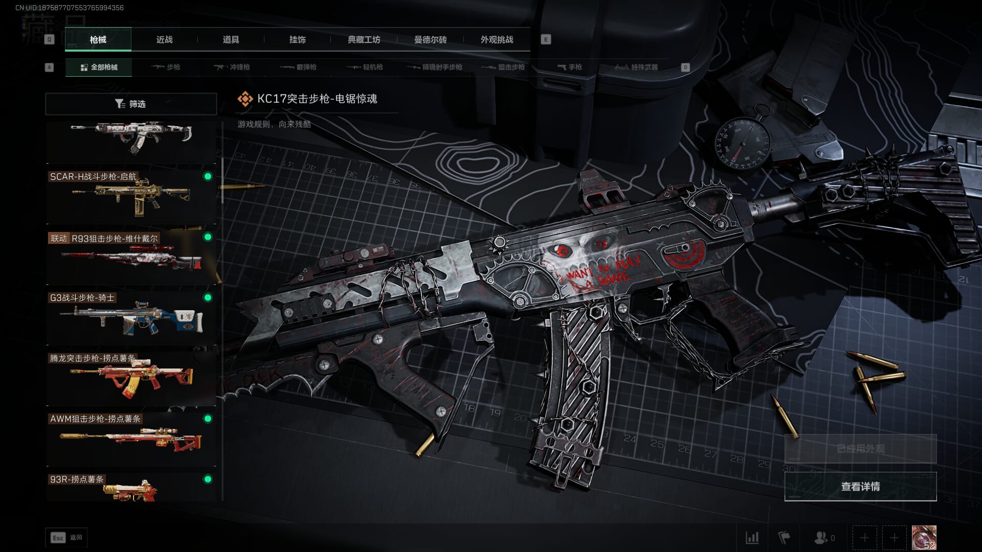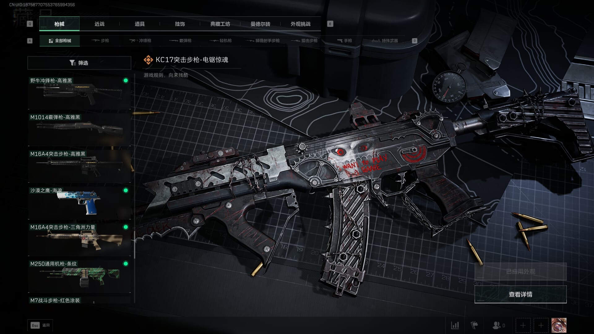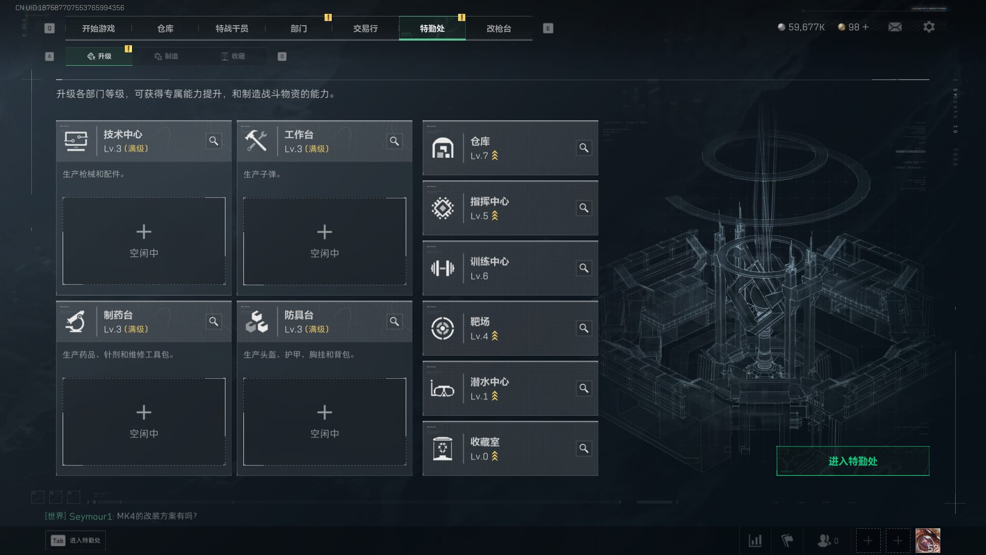 总资产:62.2M,哈夫币:84W,武器皮肤:5,黑鹰_,战场60级:列兵,【安全箱】基础安全箱;【特勤处等级】仓库LV.5,靶场LV.4,训练中心LV.4;【干员皮肤】骇爪维什戴尔,红狼电锯惊魂;【近战武器】近战武器-黑鹰;【步枪皮肤】M4A1突击步枪-阿米娅,SCAR-H战斗步枪-启航,KC17突击步枪-电锯惊魂;【狙击步枪皮肤】R93狙击步枪-维什戴尔;