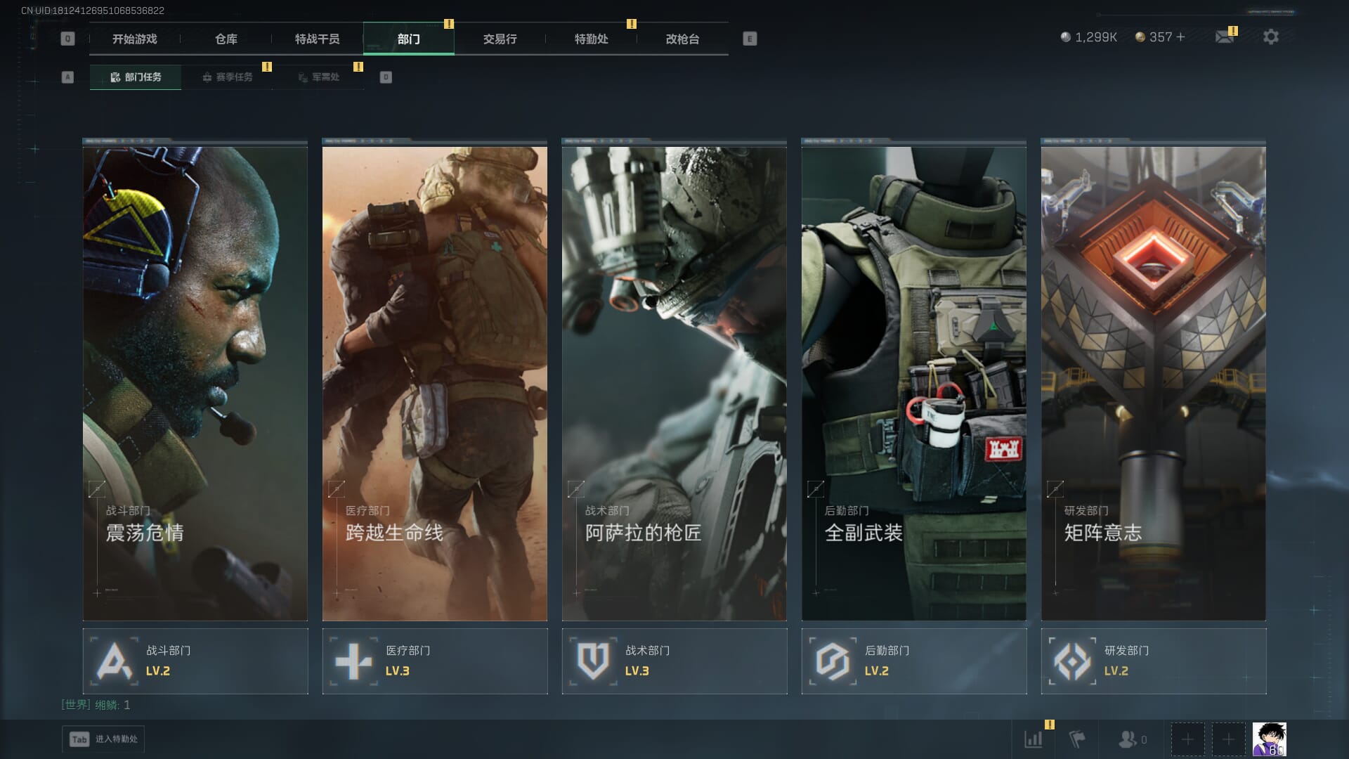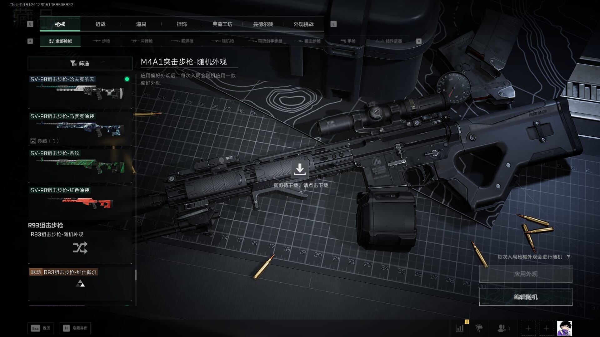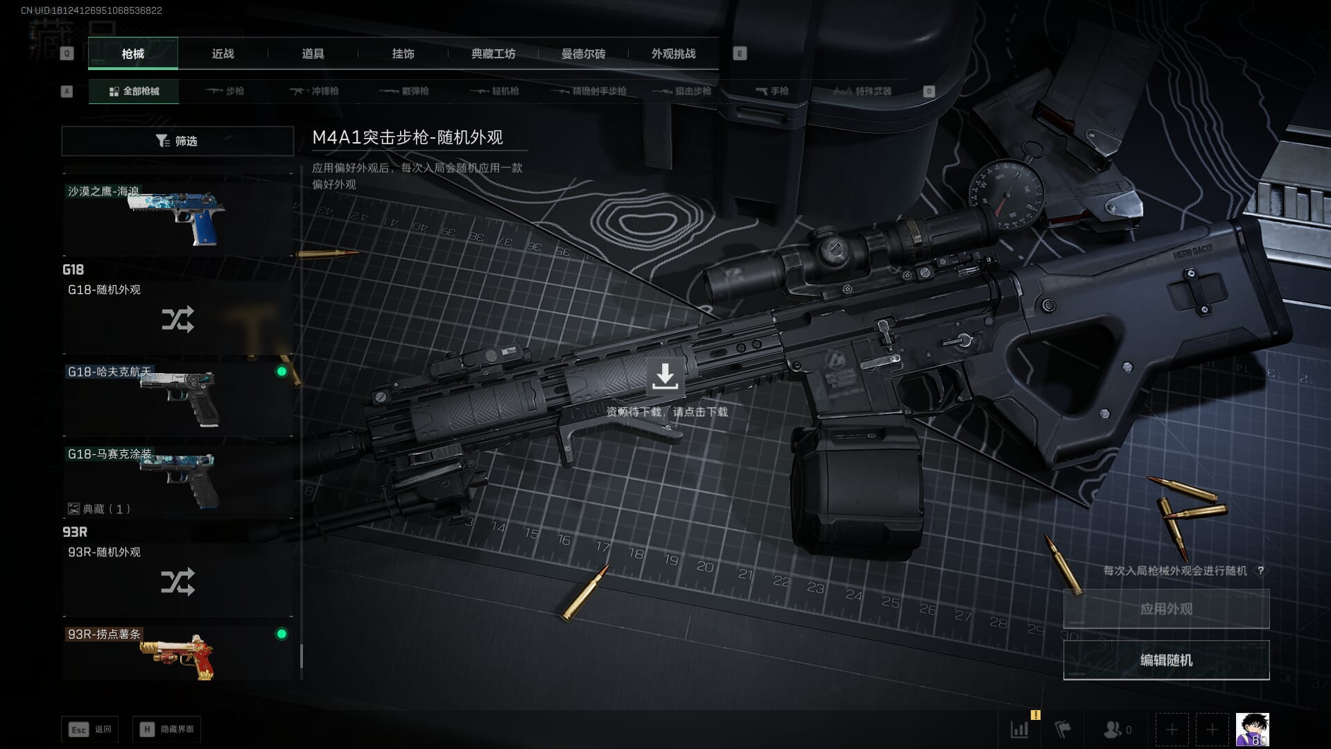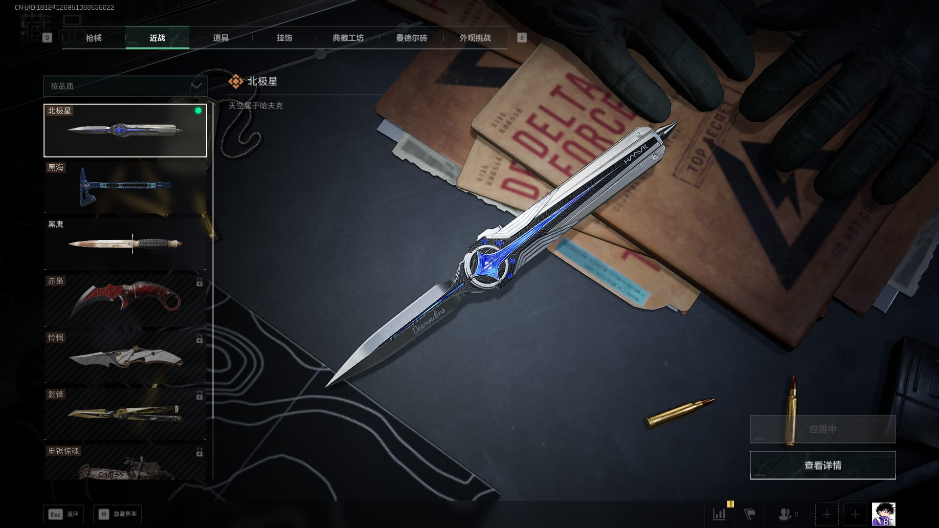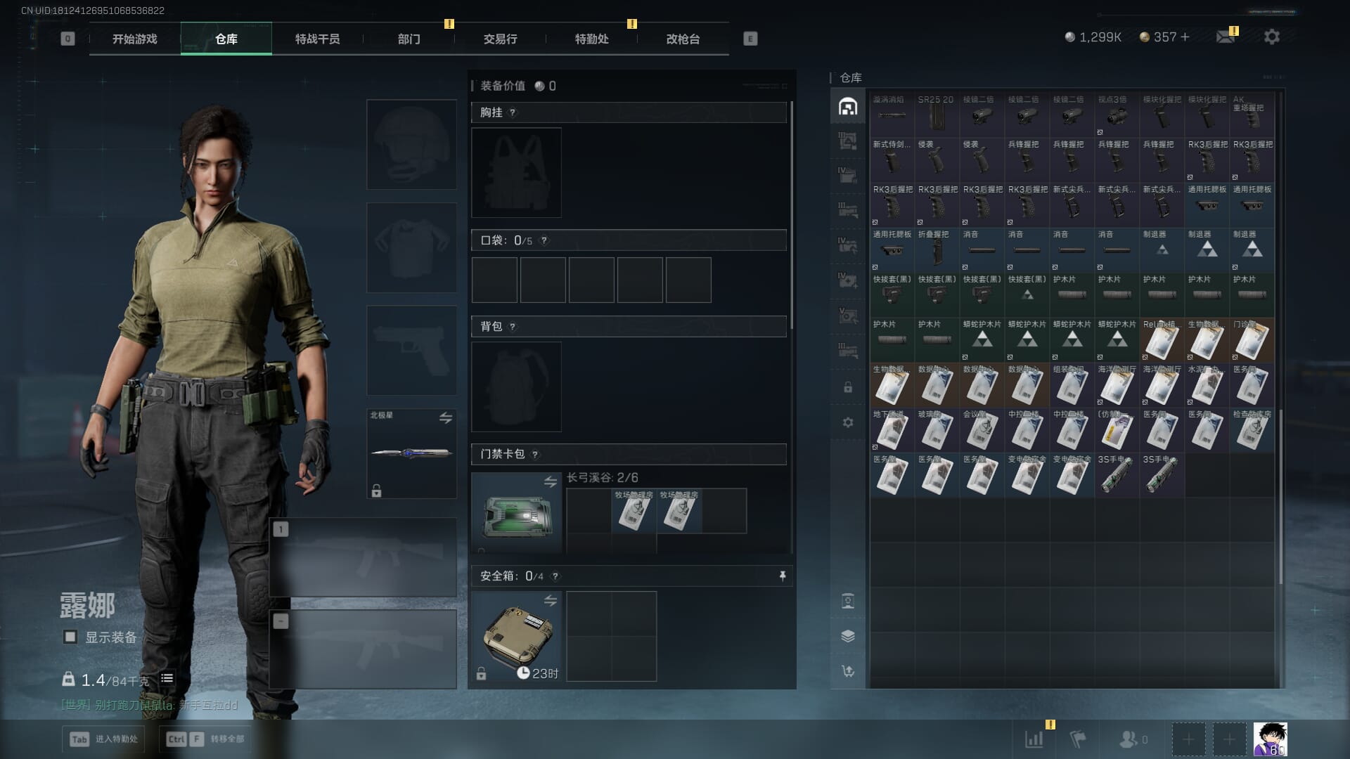 总资产:62.2M,哈夫币:84W,武器皮肤:5,黑鹰_,战场60级:列兵,【安全箱】基础安全箱;【特勤处等级】仓库LV.5,靶场LV.4,训练中心LV.4;【干员皮肤】骇爪维什戴尔,红狼电锯惊魂;【近战武器】近战武器-黑鹰;【步枪皮肤】M4A1突击步枪-阿米娅,SCAR-H战斗步枪-启航,KC17突击步枪-电锯惊魂;【狙击步枪皮肤】R93狙击步枪-维什戴尔;