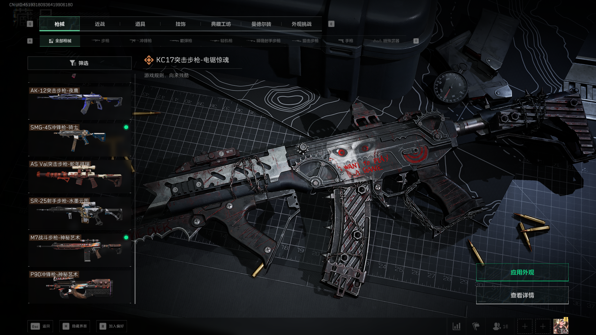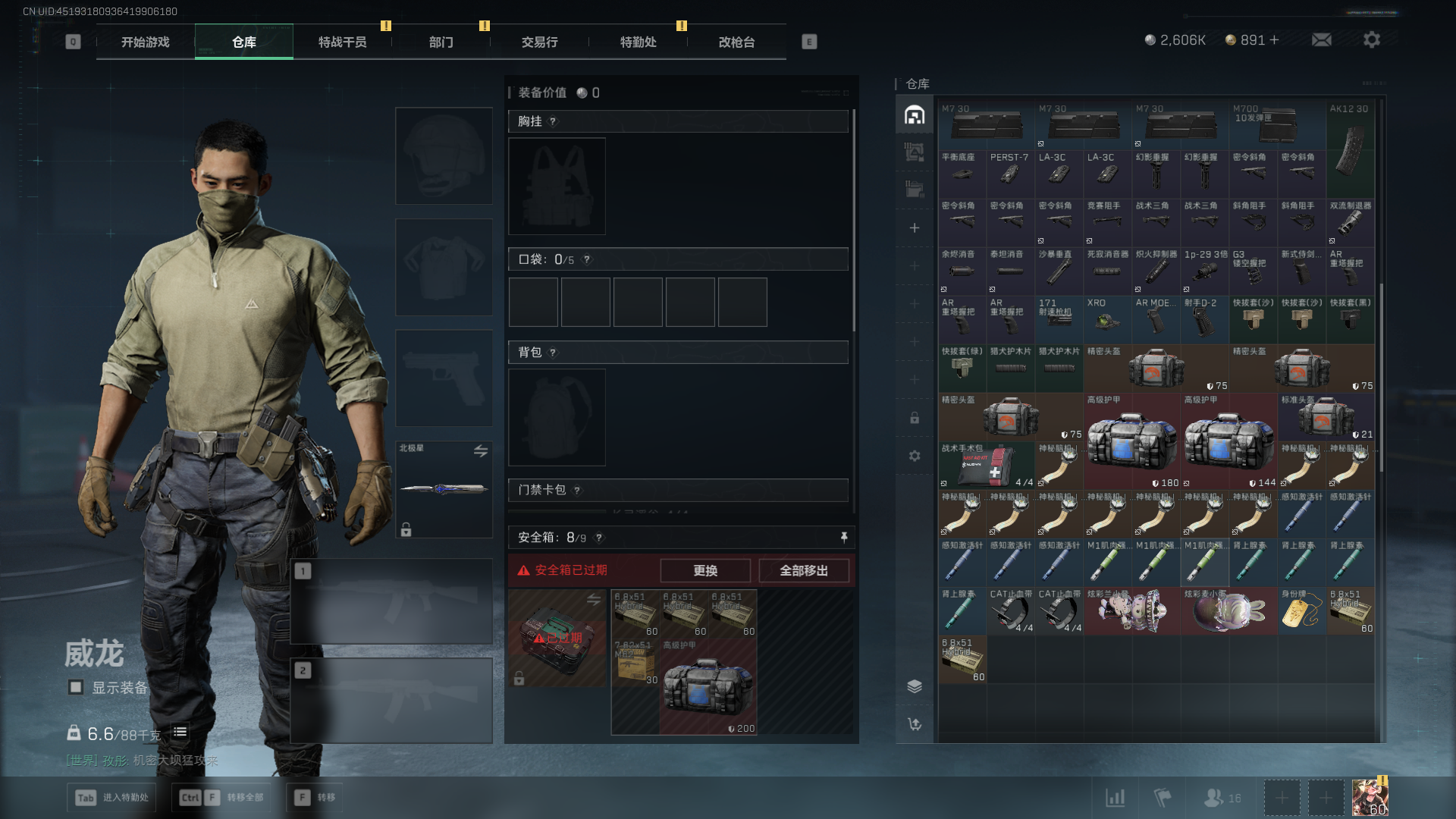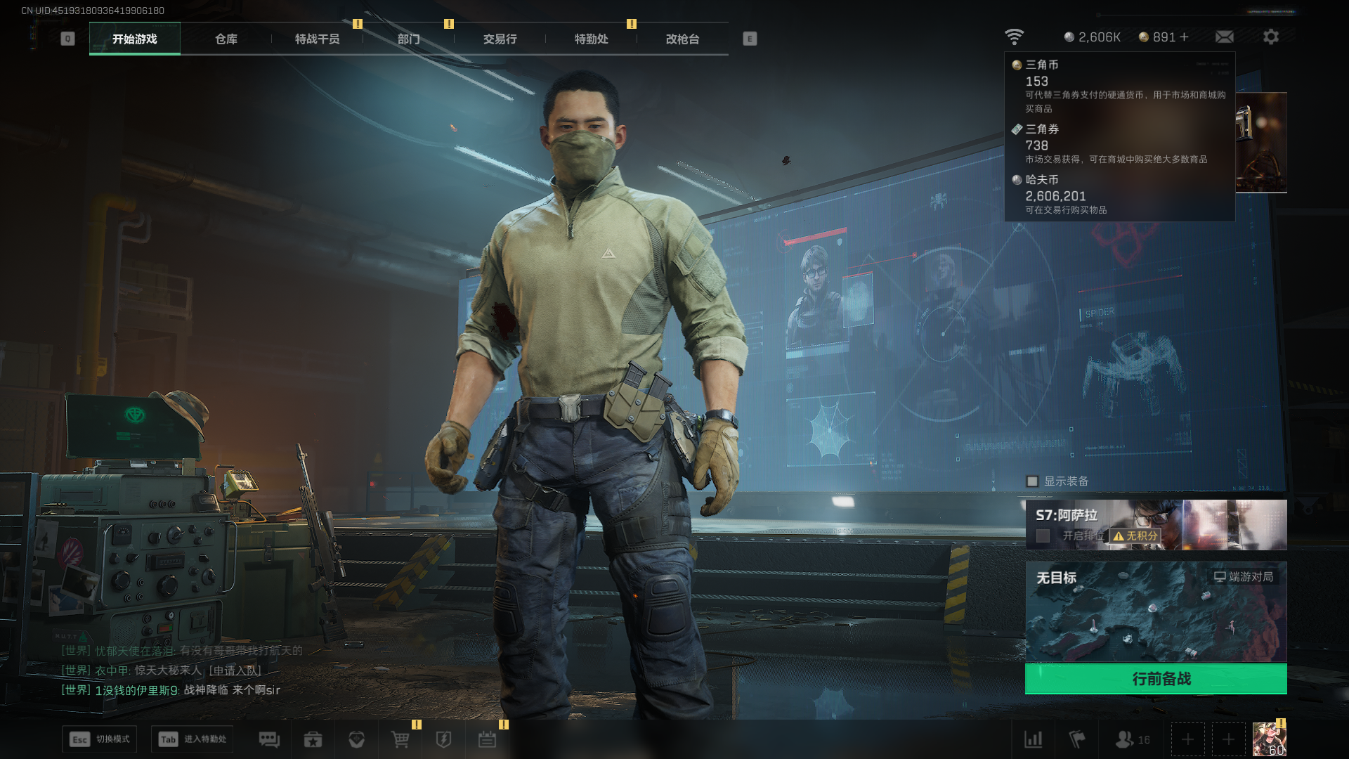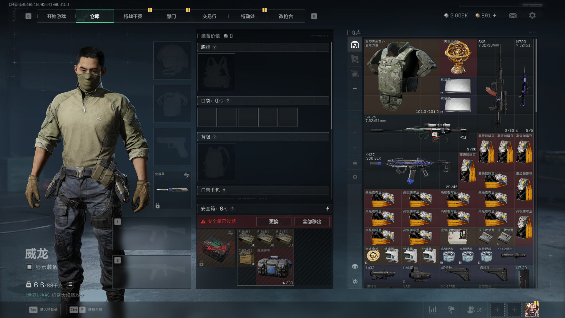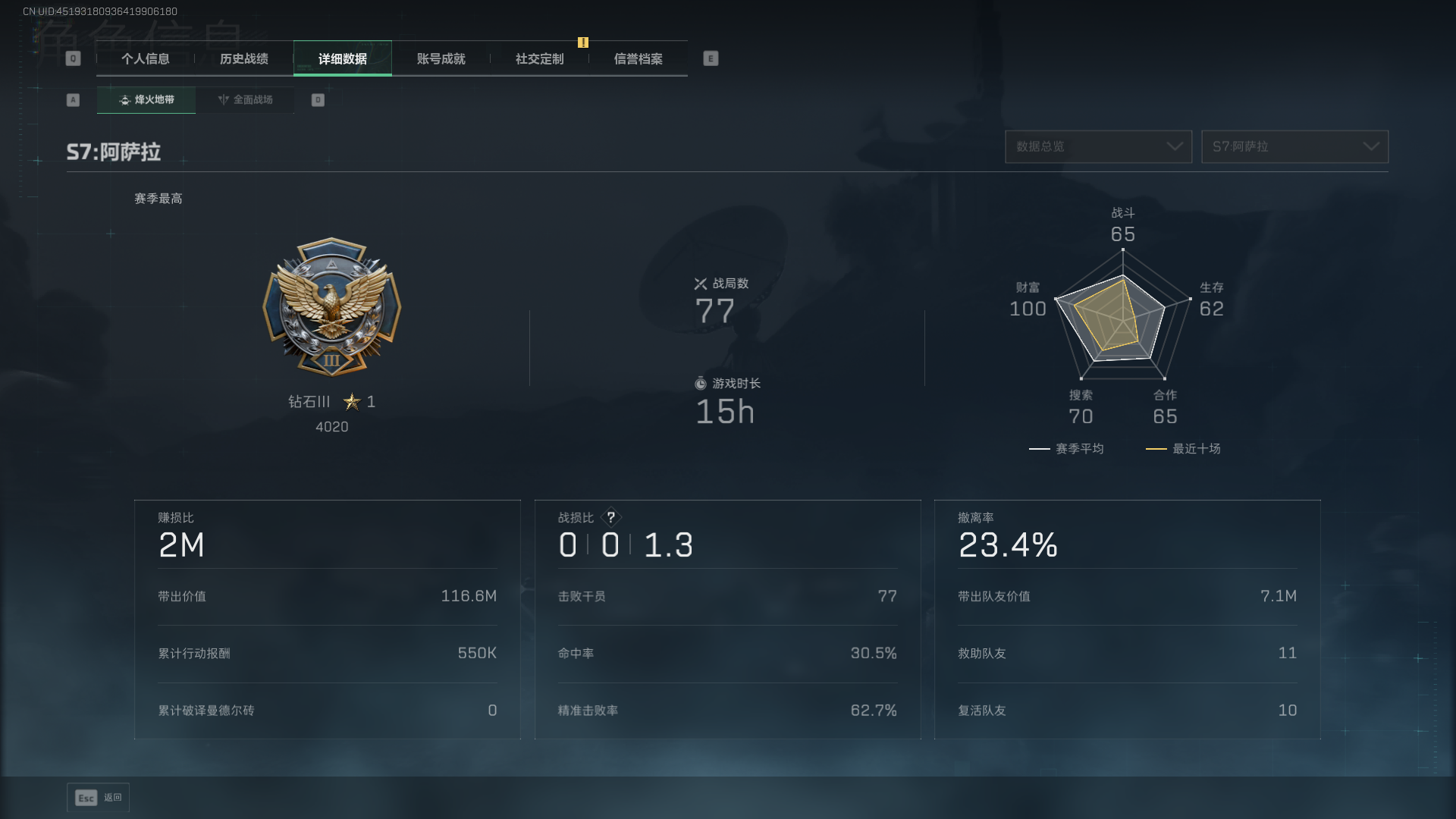 总资产:59.8M,哈夫币:260W,武器皮肤:25,钻石,战场60级:【安全箱】基础安全箱;【特勤处等级】仓库LV.8,靶场LV.7,训练中心LV.7;【干员皮肤】蜂医送葬人无题密令,无名夜鹰,红狼蚀金玫瑰;【近战武器】近战武器-北极星,近战武器-黑鹰;【步枪皮肤】M4A1突击步枪-蚀金玫瑰,M7战斗步枪-神秘艺术,SR-25射手步枪-水墨云图,ASVal突击步枪-蛇年祥瑞,AK-12突击步枪-夜鹰,K437突击步枪-北极星,CAR-15突击步枪-阿米娅,腾龙突击步枪-捞点薯条,AK-12突击步枪-特斯拉线圈,M4A1突击步枪-阿米娅,SCAR-H战斗步枪-启航,KC17突击步枪-电锯惊魂,SG552突击步枪-运动员;【冲锋枪皮肤】P90冲锋枪-神秘艺术,QCQ171冲锋枪-北极星,SMG-45冲锋枪-骑士,UZI冲锋枪-特斯拉线圈,SR-3M紧凑突击步枪-特斯拉线圈,勇士冲锋枪-能天使-午夜邮差;【狙击步枪皮肤】AWM狙击步枪-捞点薯条;【霰弹枪皮肤】725双管霰弹枪-送葬人-无题密令;【轻机枪皮肤】M250通用机枪-骑士之心;【手枪皮肤】93R-捞点薯条;