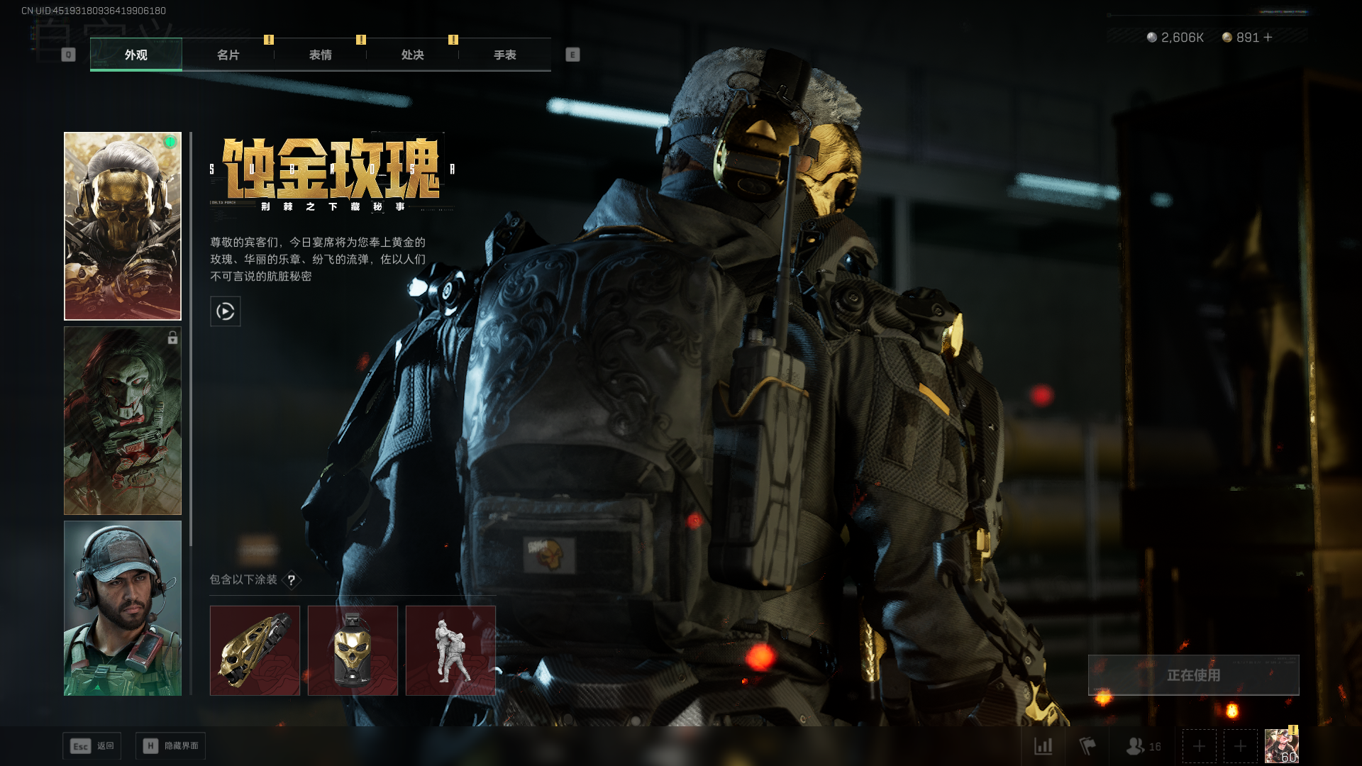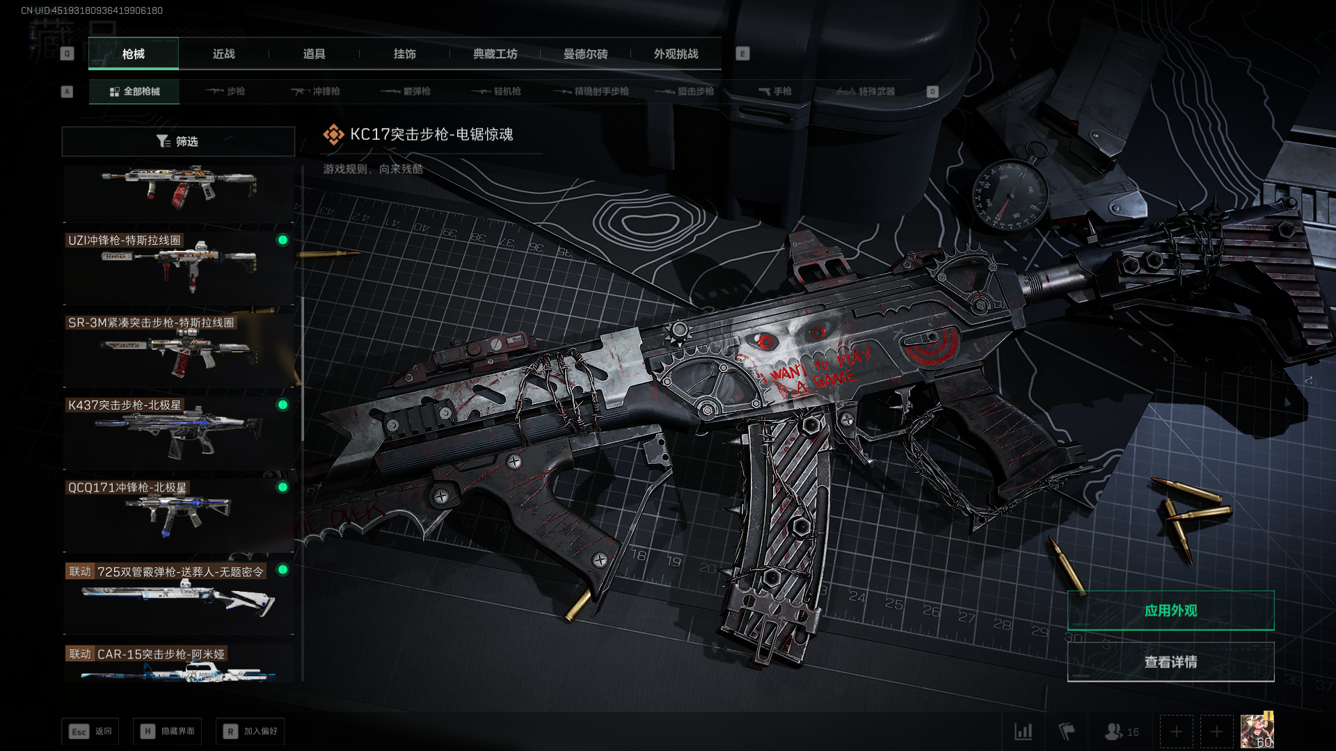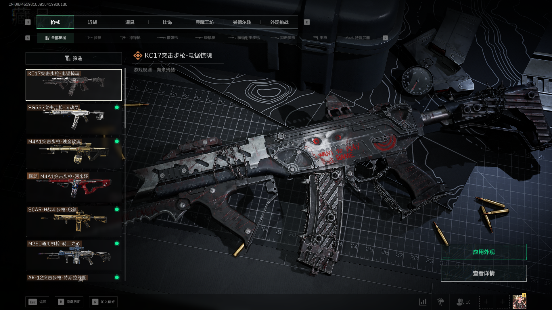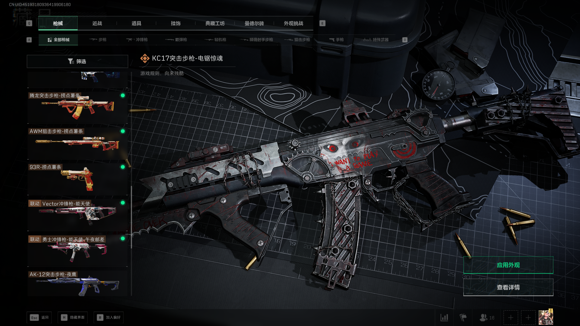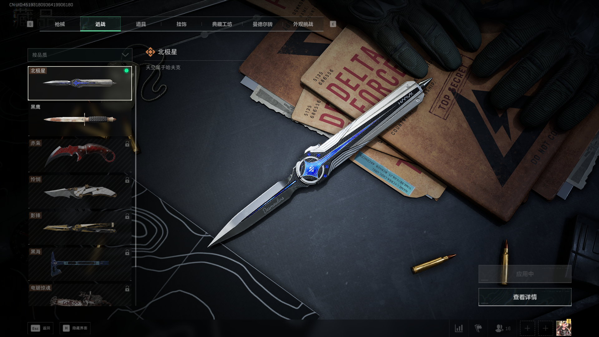 总资产:59.8M,哈夫币:260W,武器皮肤:25,钻石,战场60级:【安全箱】基础安全箱;【特勤处等级】仓库LV.8,靶场LV.7,训练中心LV.7;【干员皮肤】蜂医送葬人无题密令,无名夜鹰,红狼蚀金玫瑰;【近战武器】近战武器-北极星,近战武器-黑鹰;【步枪皮肤】M4A1突击步枪-蚀金玫瑰,M7战斗步枪-神秘艺术,SR-25射手步枪-水墨云图,ASVal突击步枪-蛇年祥瑞,AK-12突击步枪-夜鹰,K437突击步枪-北极星,CAR-15突击步枪-阿米娅,腾龙突击步枪-捞点薯条,AK-12突击步枪-特斯拉线圈,M4A1突击步枪-阿米娅,SCAR-H战斗步枪-启航,KC17突击步枪-电锯惊魂,SG552突击步枪-运动员;【冲锋枪皮肤】P90冲锋枪-神秘艺术,QCQ171冲锋枪-北极星,SMG-45冲锋枪-骑士,UZI冲锋枪-特斯拉线圈,SR-3M紧凑突击步枪-特斯拉线圈,勇士冲锋枪-能天使-午夜邮差;【狙击步枪皮肤】AWM狙击步枪-捞点薯条;【霰弹枪皮肤】725双管霰弹枪-送葬人-无题密令;【轻机枪皮肤】M250通用机枪-骑士之心;【手枪皮肤】93R-捞点薯条;