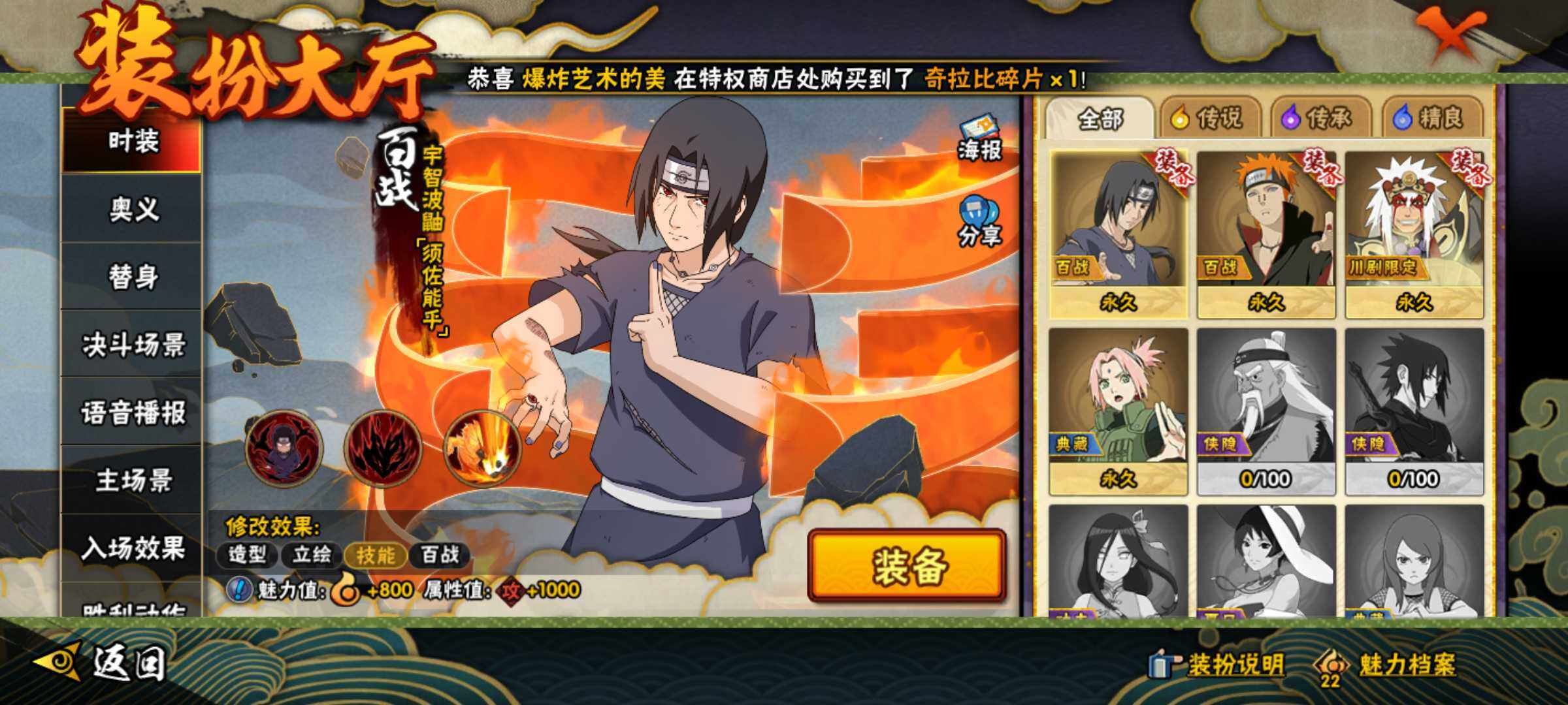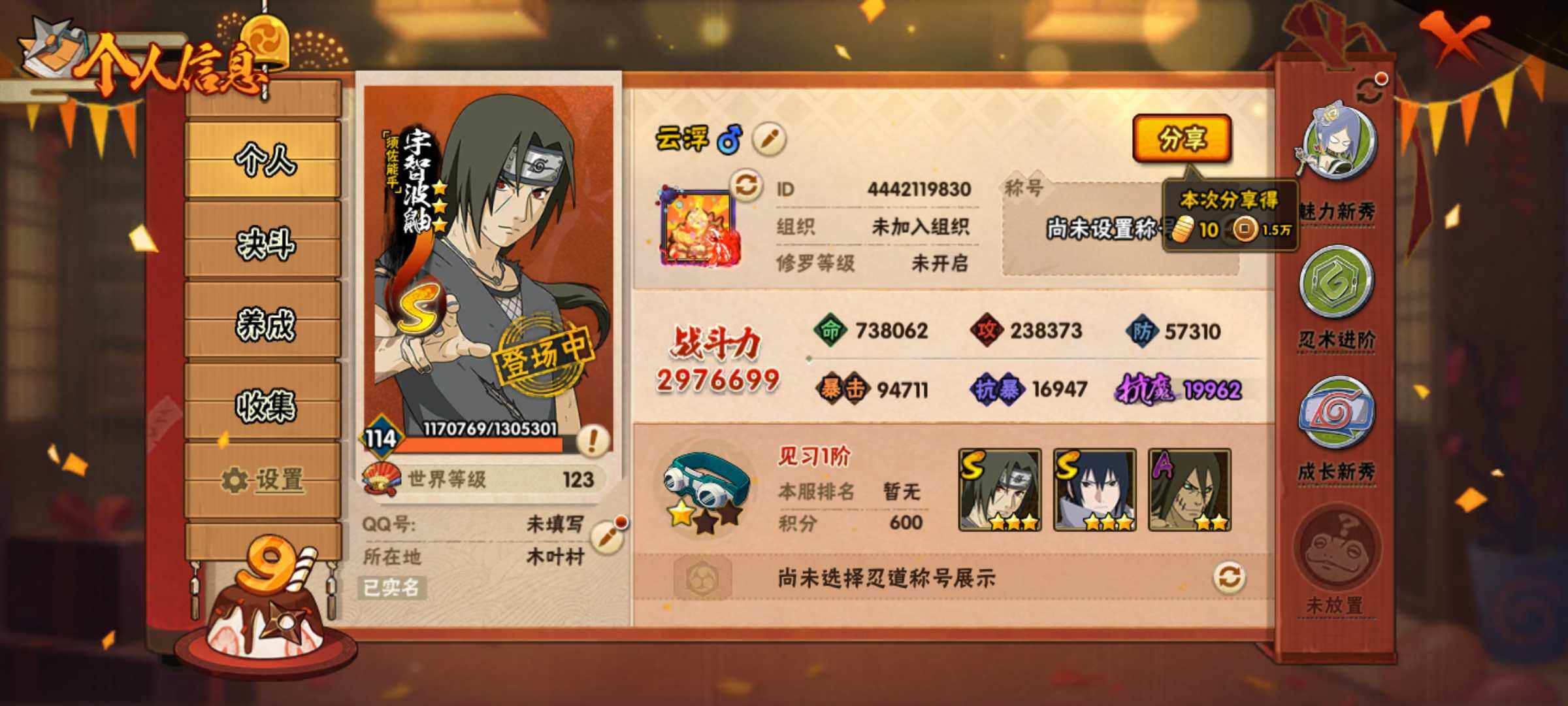 商品描述:[14117372]Xr45415-战力297W-安Q-4S级忍者数-9A级忍者数【S级忍者】:宇智波鼬「须佐能乎」(3星),自来也「舞之豪杰」(3星),佩恩「天道」(3星),宇智波佐助「永恒万花筒」(3星)【A级忍者】:迪达拉(2星),飞段「死司凭血」(2星),迈特凯(2星),角都「秽土转生」(2星),猿飞阿斯玛(2星),宇智波鼬(2星),秋道丁次「忍界大战」(2星),千代「近松十人卫」(2星),宇智波泉奈(2星)