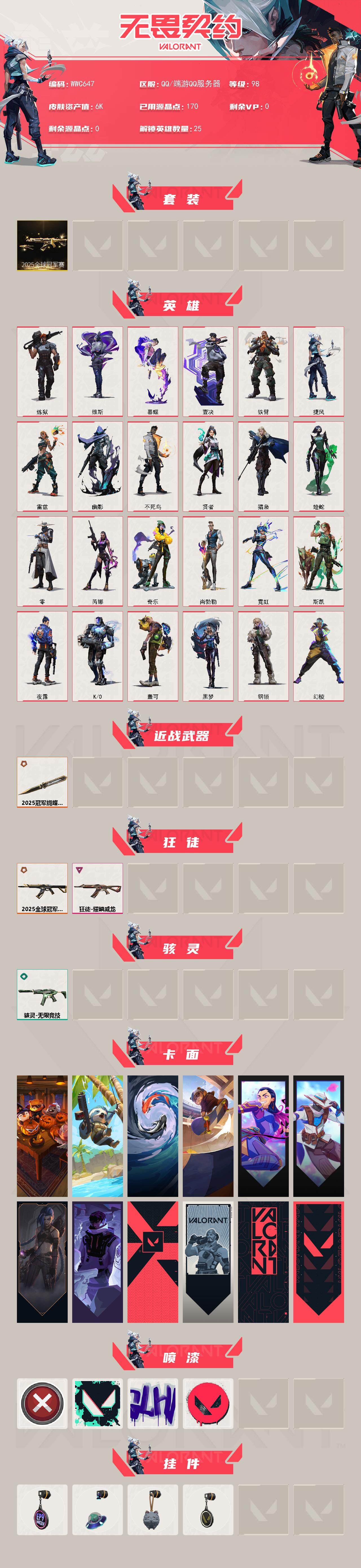 商品描述:【WWC647】终极*2/卓越*1/皮肤*7/等级*98/段位:白银/2025全球冠军赛套装/幻棱/炼狱/维斯/暮蝶/壹决/铁臂/捷风/雷兹/幽影/不死鸟/贤者/猎枭/蝰蛇/零/芮娜/奇乐/尚勃勒/霓虹/斯凯/夜露/K/O/盖可/黑梦/钢锁/近战武器-2025全球冠军赛 蝴蝶刀/狂徒-2025全球冠军赛/狂徒-耀鳞威龙/骇灵-无限竞技/南瓜盛典 卡面/树懒大作战 卡面/红鳞松叶 卡面/Clutch 卡面/无畏契约GO!第一卷:芮娜 卡面/无畏契约GO!第一卷:零 卡面/《双城之战》金克丝 卡面/逆向独行 卡面 /代号红色 卡面/新兵报到 卡面/V契约 卡面/无畏契约 卡面/买装还是存钱 喷漆