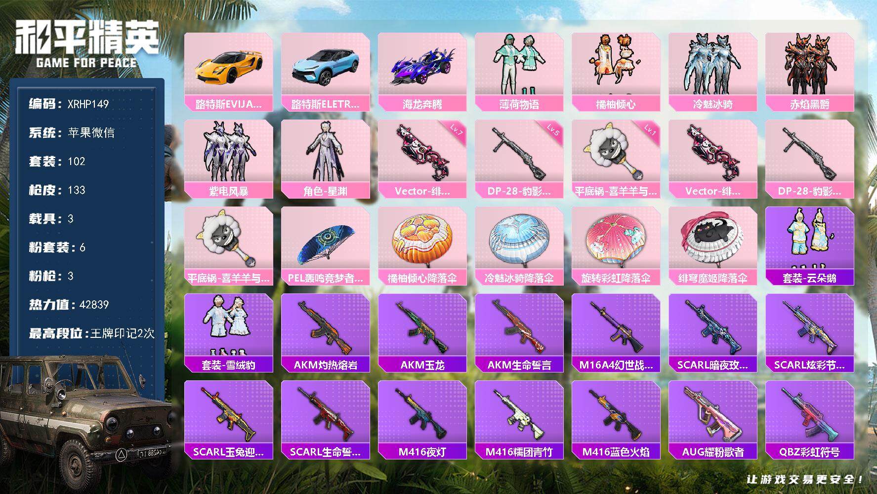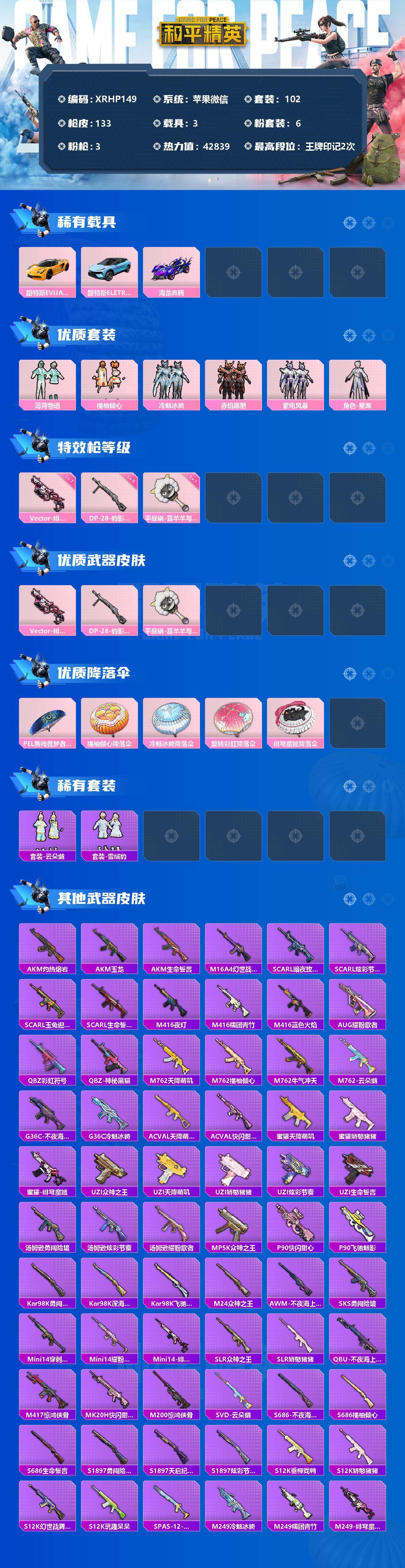 商品描述:[14134604]Xr42823-苹果 微信-6粉装-3特效枪-3载具-0粉色飞行器-42839热力值-2王牌印记-102套装-133枪皮【粉色载具】:路特斯EVIJA(星际黄),路特斯ELETRE(冰川蓝),海龙奔腾【粉色套装】:粉装-薄荷物语,粉装-橘柚倾心,粉装-冷魅冰骑,粉装-赤焰黑爵,粉装-紫电风暴,角色-星渊【粉色枪皮等级】:Vector-绯穹魔姬(七级),DP-28-豹影疾电(五级),平底锅-喜羊羊与灰太狼(一级)【粉色枪皮】:Vector-绯穹魔姬,DP-28-豹影疾电,平底锅-喜羊羊与灰太狼【粉色降落伞】:PEL轰鸣竞梦者降落伞,橘柚倾心降落伞,冷魅冰骑降落伞,旋转彩虹降落伞,绯穹魔姬降落伞【稀有套装】:套装-云朵鹅,套装-雪绒豹【稀有枪皮】:AKM-灼热熔岩,AKM-玉龙,AKM-生命誓言,M16A4-幻世战舞者,SCAR-L-暗夜玫瑰,SCAR-L-炫彩节奏,SCAR-L-玉兔迎春,SCAR-L-生命誓言,M416-夜灯,M416-糯团青竹,M416-蓝色火焰,AUG-耀粉歌者,QBZ-彩虹符号,QBZ-神秘黑猫,M762-天降萌叽,M762-橘柚倾心,M762-牛气冲天,M762-云朵鹅,G36C-不夜海上花,G36C-冷魅冰骑,AC-VAL-天降萌叽,AC-VAL-快闪甜心,蜜獾-天降萌叽,蜜獾-娇憨猪猪,蜜獾-绯穹魔姬,UZI-众神之王,UZI-天降萌叽,UZI-娇憨猪猪,UZI-炫彩节奏,UZI-生命誓言,汤姆逊-勇闯险境,汤姆逊-炫彩节奏,汤姆逊-耀粉歌者,MP5K-众神之王,P90-快闪甜心,P90-飞驰魅影,Kar98K-勇闯险境,Kar98K-深海曼妙,Kar98K-飞驰魅影,M24-众神之王,AWM-不夜海上花,SKS-勇闯险境,Mini14-穿刺龙虾,Mini14-耀粉歌者,Mini14-绯穹魔姬,SLR-众神之王,SLR-娇憨猪猪,QBU-不夜海上花,M417-惊鸿侠骨,MK20-H-快闪甜心,M200-惊鸿侠骨,SVD-云朵鹅,S686-不夜海上花,S686-橘柚倾心,S686-生命誓言,S1897-勇闯险境,S1897-天启纪元,S1897-炫彩节奏,S12K-玩趣呆呆,S12K-垂柳戏鸭,S12K-娇憨猪猪,S12K-幻世战舞者,SPAS-12-云朵鹅,M249-冷魅冰骑,M249-糯团青竹,M249-绯穹魔姬,DP-