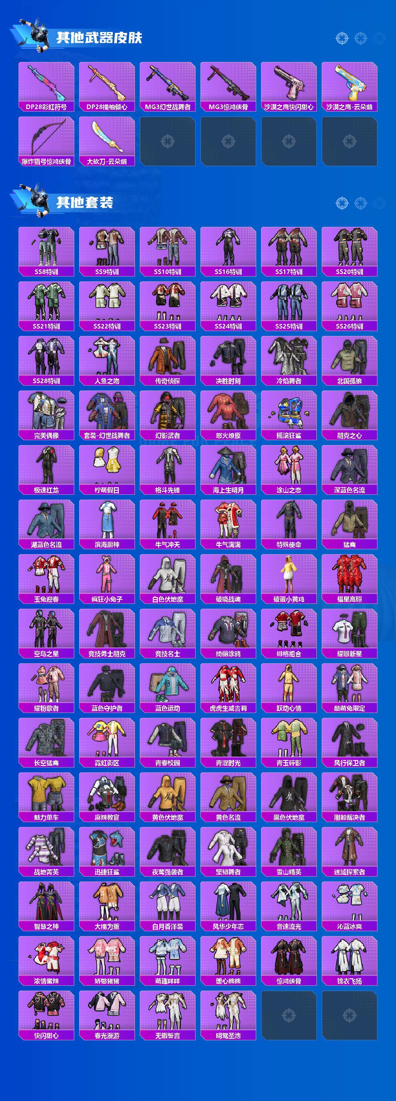 【苹果QQ】225套装-297枪皮-1载具 奇异狩猎者 潮萌小黄鸭 胖达圆圆 浪漫波比 粉红小猪 浪漫天命 M762-甜蜜誓约 SCAR-L-梦幻火箭 M416-五爪金龙 Kar98K-伏魔团 UMP45-相思残雪 玛莎拉蒂Ghibli(粉) 天之羽翼飞行器 童趣迷兔飞行器 精灵迷巫飞行器 梦幻火箭飞行器 宝贝奶油派 天启纪元 新星烈龙 向日葵 极致幻想 冰霜白皇 香水柠檬 闪金天王 粉甜马卡龙 激萌罗小黑 神秘黑猫 软嫩糖心蛋 恐龙拽拽 精灵娃娃 草莓生巧 沙场疾风 东方飞龙 漫步者 狂沙舞者 梦起落英 纯白誓言 怪笑疯兔 AUG-魔法学院 萌神柯基 暗夜契约 团圆交子 瑞龙福将 黑色刀锋 白月香洋装 风华少年志 机械英豪 软萌银虎 AKM-炫紫旋律 M24-奇异狩猎者 M249-古堡领主 M762-奇异狩猎者 M762-瑞龙福将 MK47-林间仙鹿 AKM-奇异狩猎者 S686-奇异狩猎者 GROZA-林间仙鹿 汤姆逊-林间仙鹿 霓虹街区飞行器