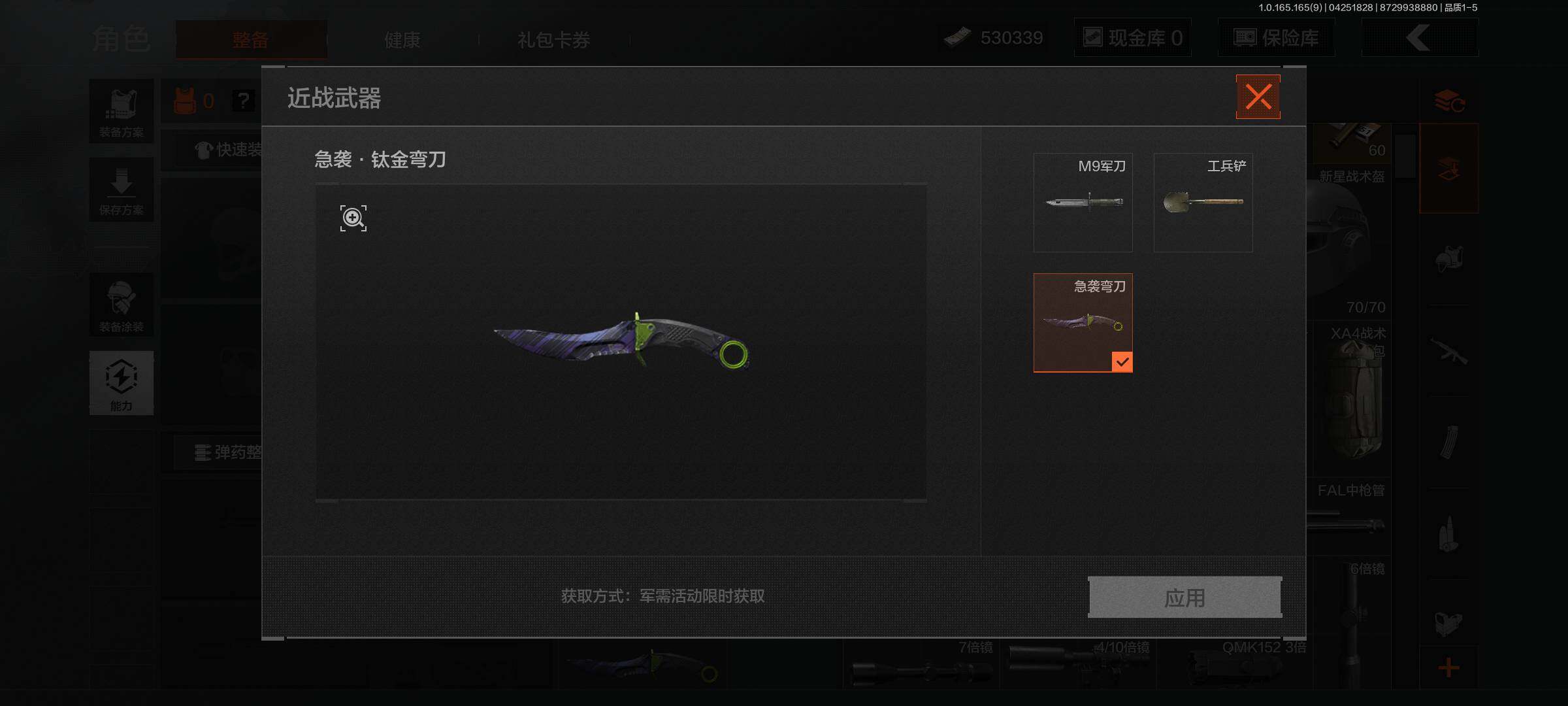 【AQQH1183】段位:新锐/仓库价值(百万):69/掠影马来剑/赤火炉心/工兵铲/秘密任务艾薇塔/镀火熔金H416/竞技风潮M4A1/百锻铁骑AEK/旗帜AEK/赤帽要塞AR57/千炼铁阵MK14/利齿风暴MPX/近卫荣誉RPK16/长夜千军武将/冲刺极限QBZ192