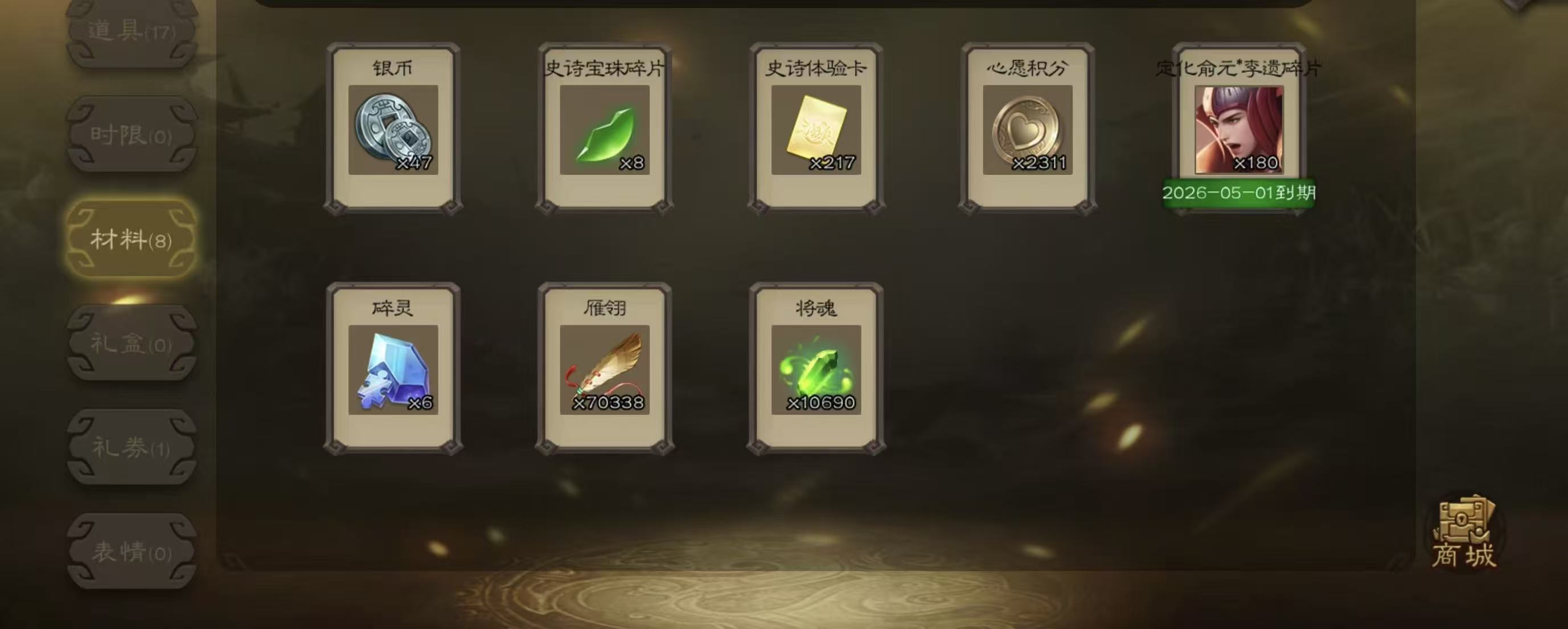 商品描述:千夫长势国渊1万将魂7万羽毛三卡