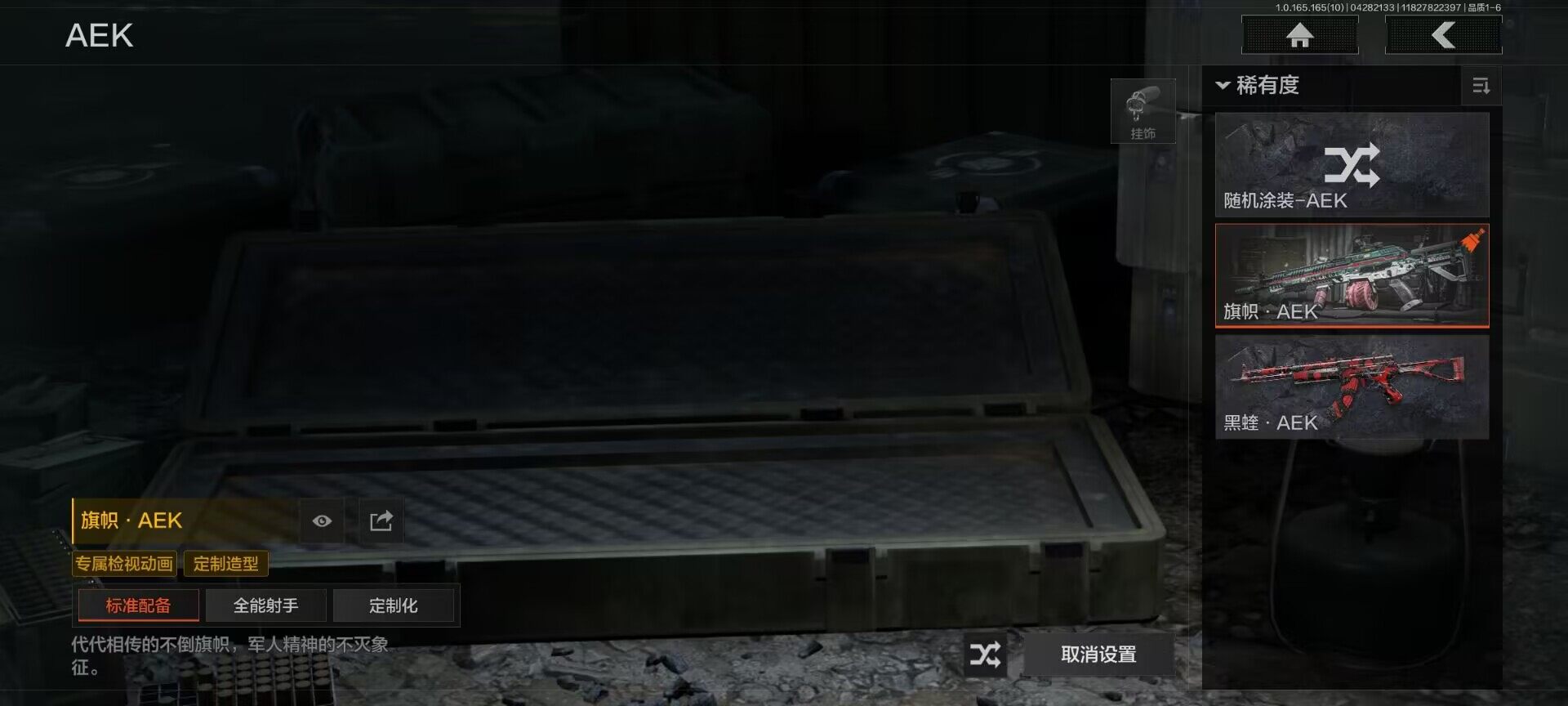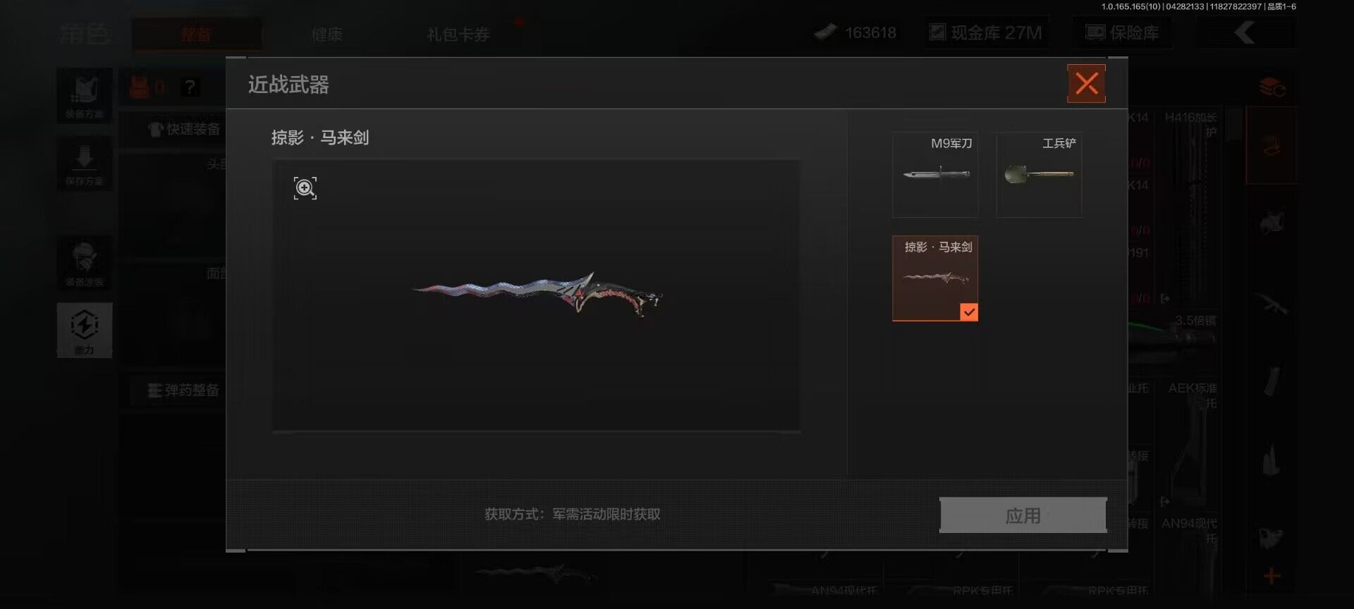 【AQQH1183】段位:新锐/仓库价值(百万):69/掠影马来剑/赤火炉心/工兵铲/秘密任务艾薇塔/镀火熔金H416/竞技风潮M4A1/百锻铁骑AEK/旗帜AEK/赤帽要塞AR57/千炼铁阵MK14/利齿风暴MPX/近卫荣誉RPK16/长夜千军武将/冲刺极限QBZ192